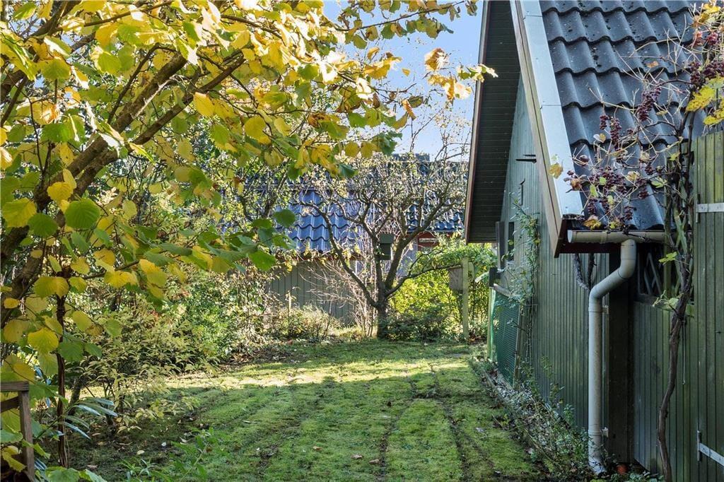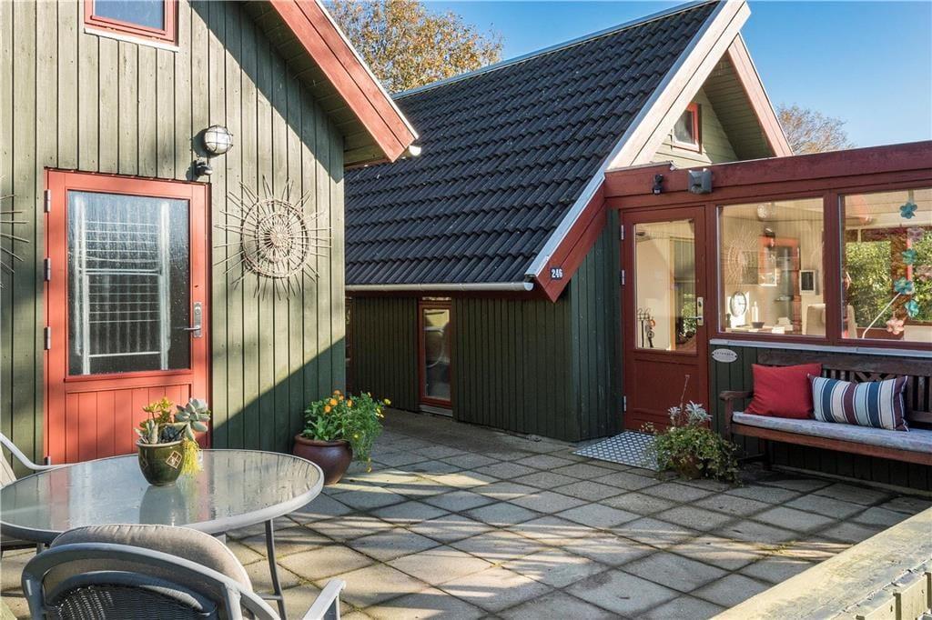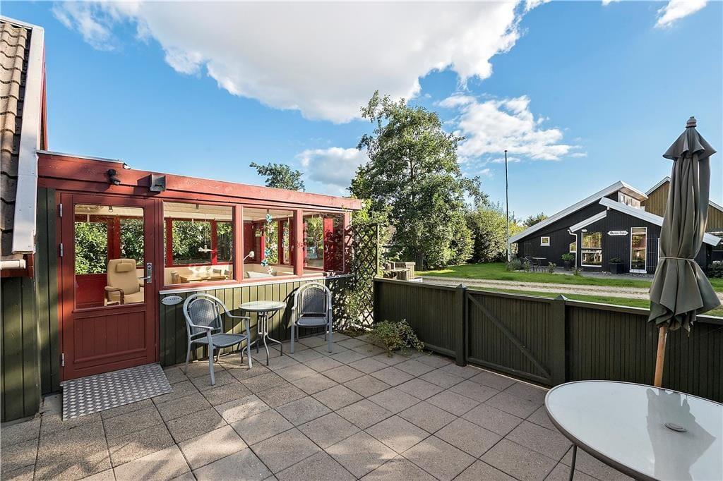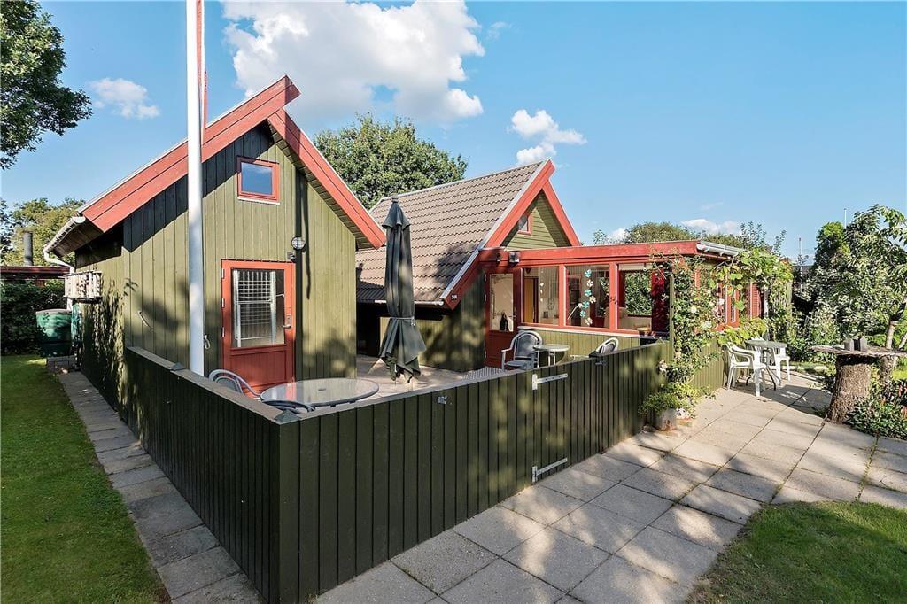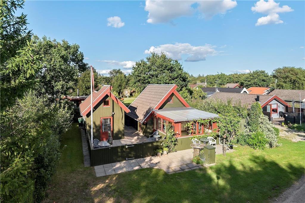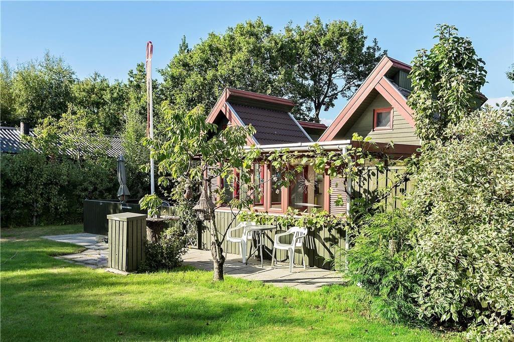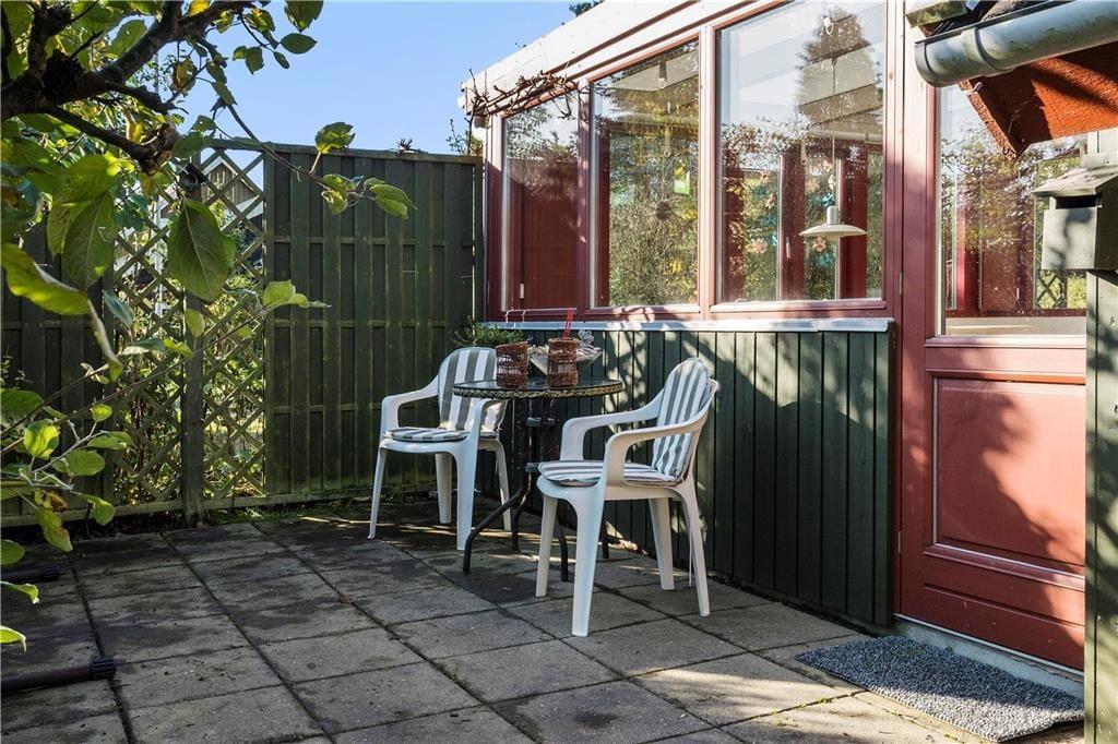 Mellem sommerhuset og annekset ligger et aflukket terrassemiljø, hvor I har flere dejlige solbeskinnede kroge og opholdspladser at vælge imellem. Der er også et ekstra terrasseområde foran huset, mens grundens grønne beplantning virker afskærmende og giver jer noget kønt at kigge på.