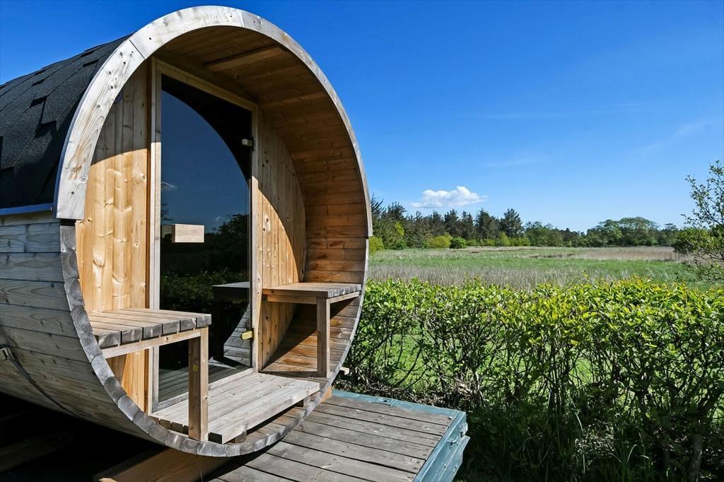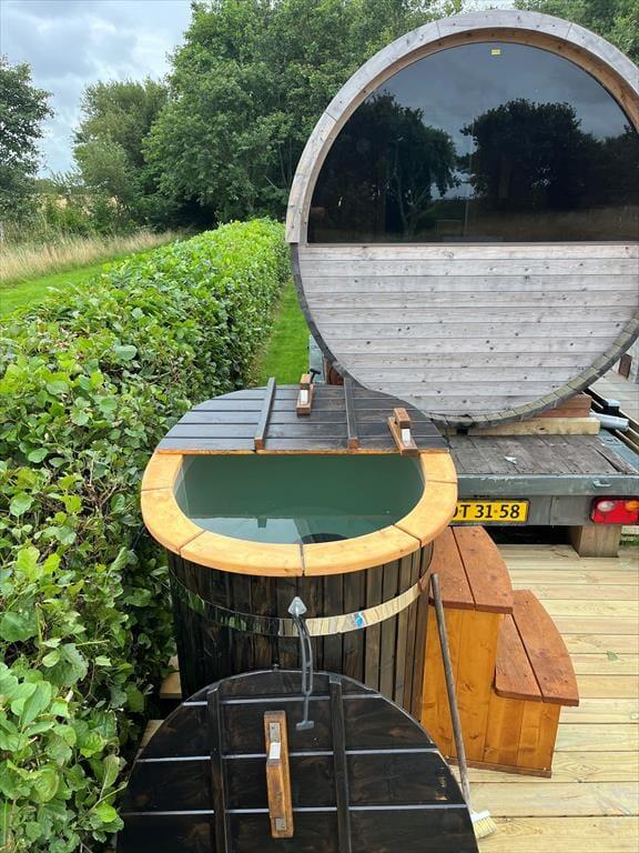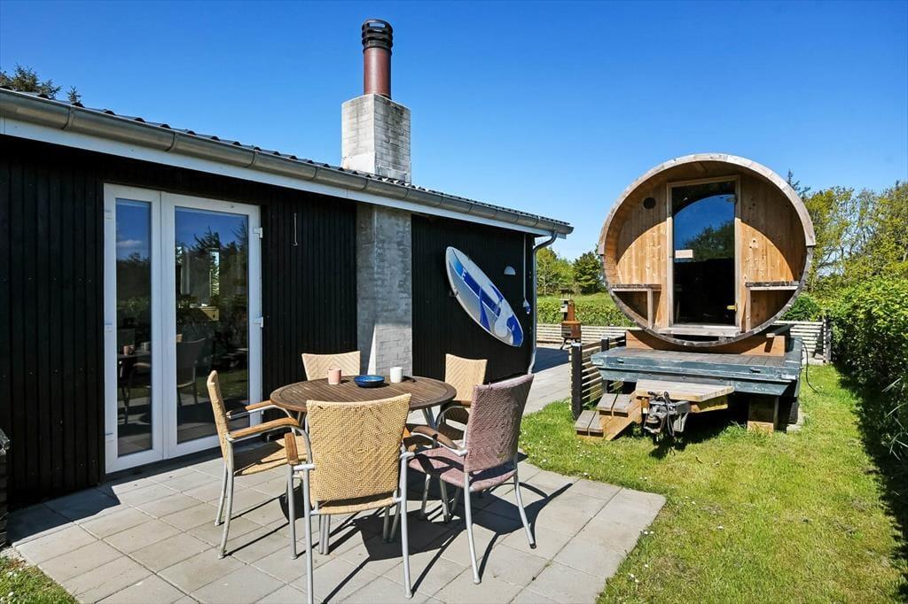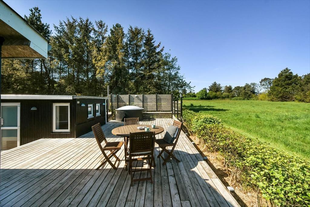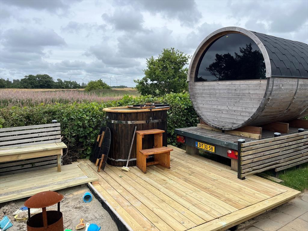 På terrassen står et dejligt vildmarksbad, så det er ikke kun om sommeren, at livsnydertilværelsen kan foregå i det fri. Det er skønt at sidde her og mærke feriefreden sænke sig– måske med fuglekvidder som behageligt lydtæppe. Livsnydertilværelsen kan desuden foregå i en god liggestol på terrassen eller på det overdækkede areal med grill og havebord, der skaber en skøn ramme om de lyse sommeraftener. På den store naturgrund er der god plads til at boltre sig, og så er der endda gode legefaciliteter til børnene i form af legehus, sandkasse, gynger og trampolin.