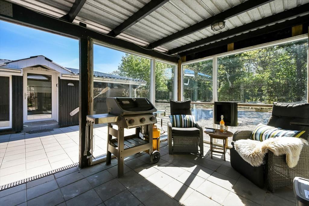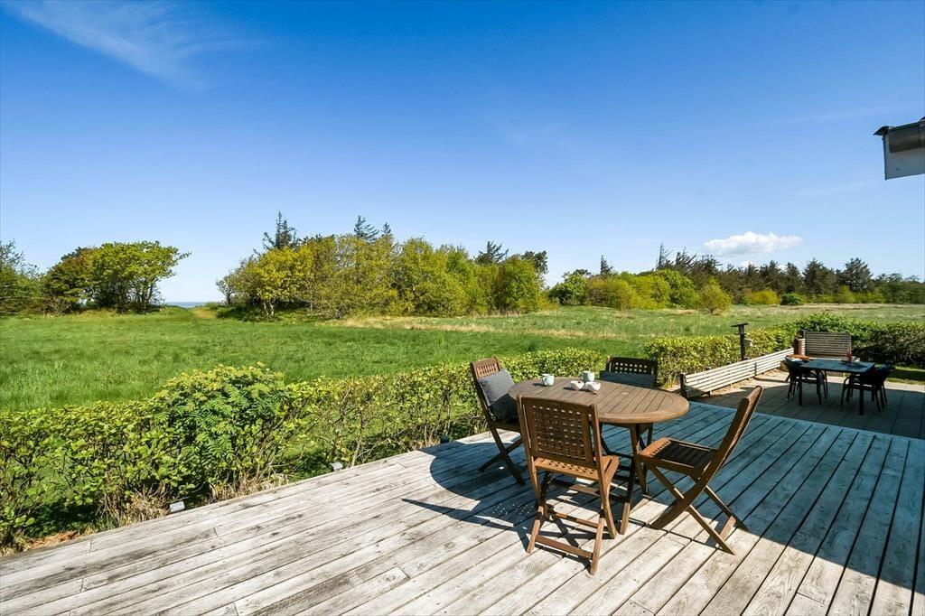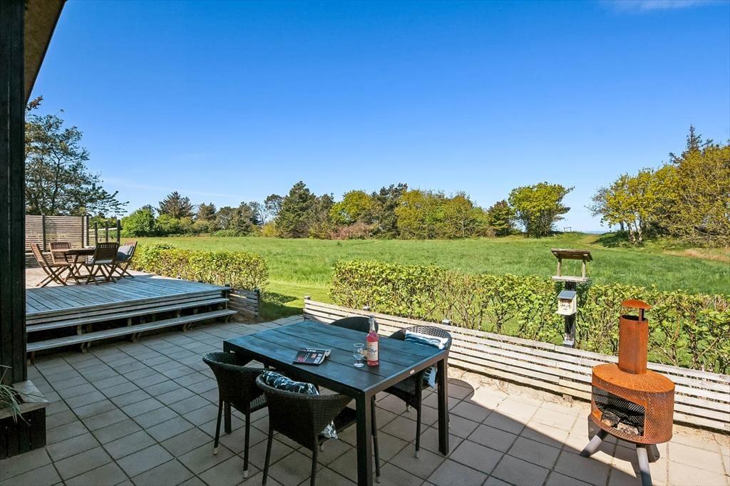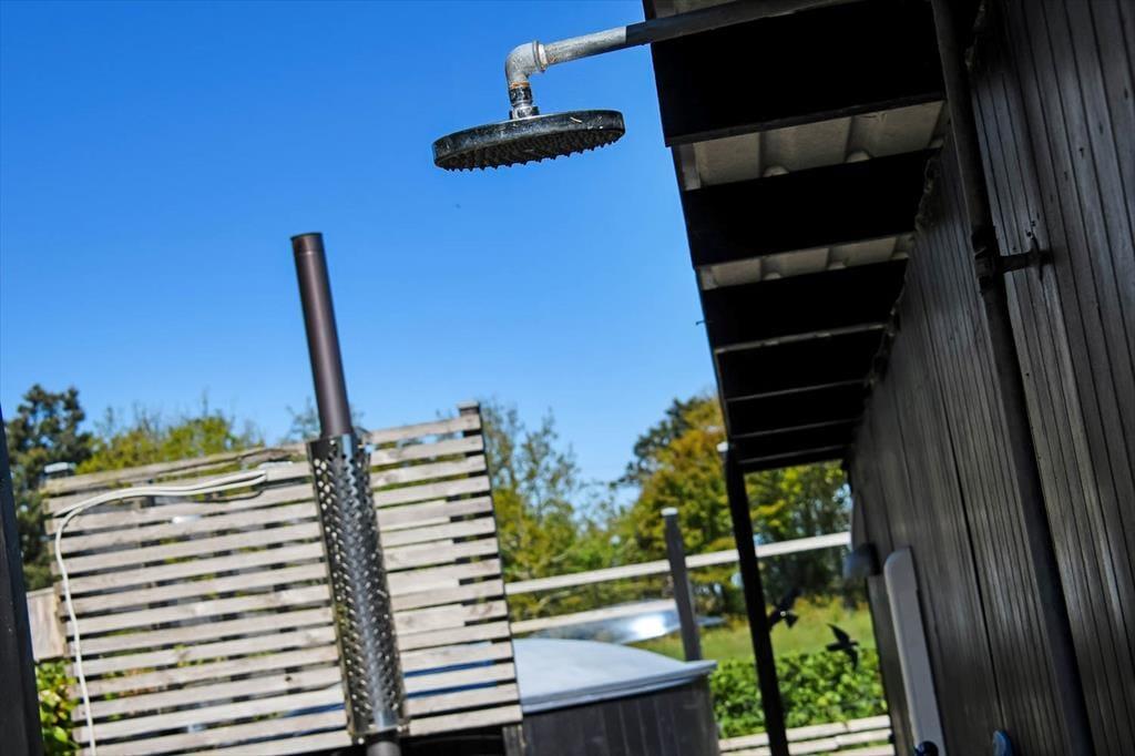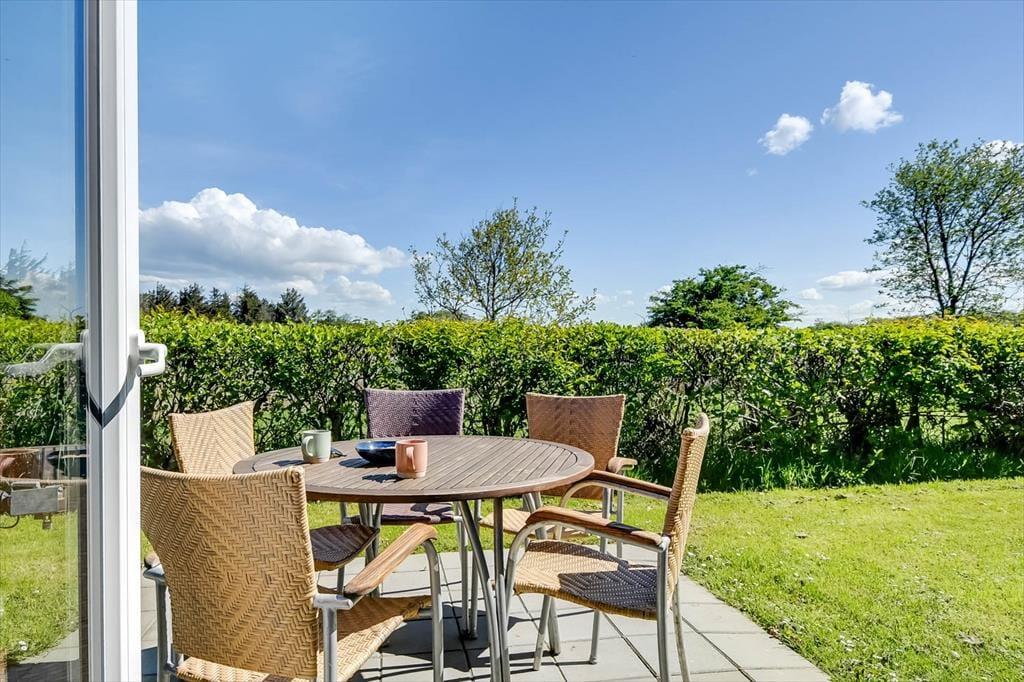 På terrassen står et dejligt vildmarksbad, så det er ikke kun om sommeren, at livsnydertilværelsen kan foregå i det fri. Det er skønt at sidde her og mærke feriefreden sænke sig– måske med fuglekvidder som behageligt lydtæppe. Livsnydertilværelsen kan desuden foregå i en god liggestol på terrassen eller på det overdækkede areal med grill og havebord, der skaber en skøn ramme om de lyse sommeraftener. På den store naturgrund er der god plads til at boltre sig, og så er der endda gode legefaciliteter til børnene i form af legehus, sandkasse, gynger og trampolin.