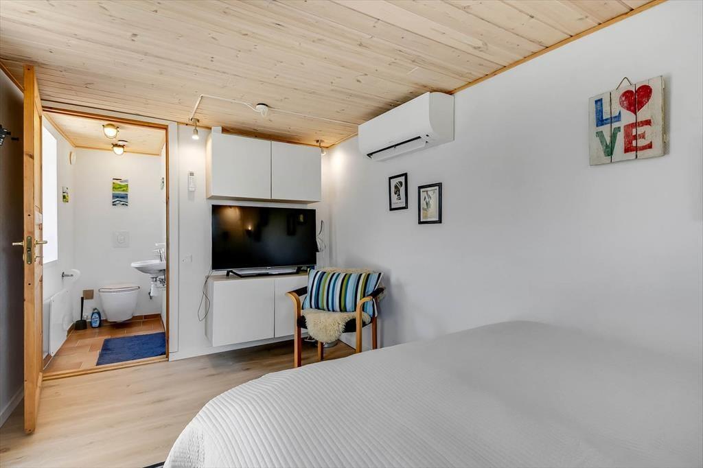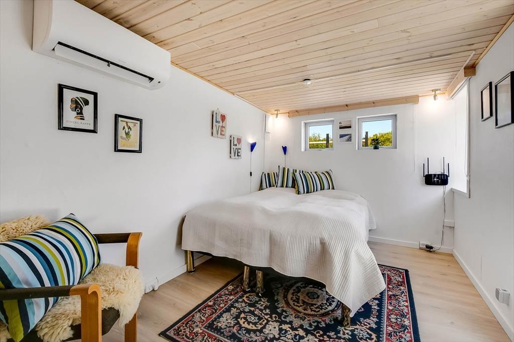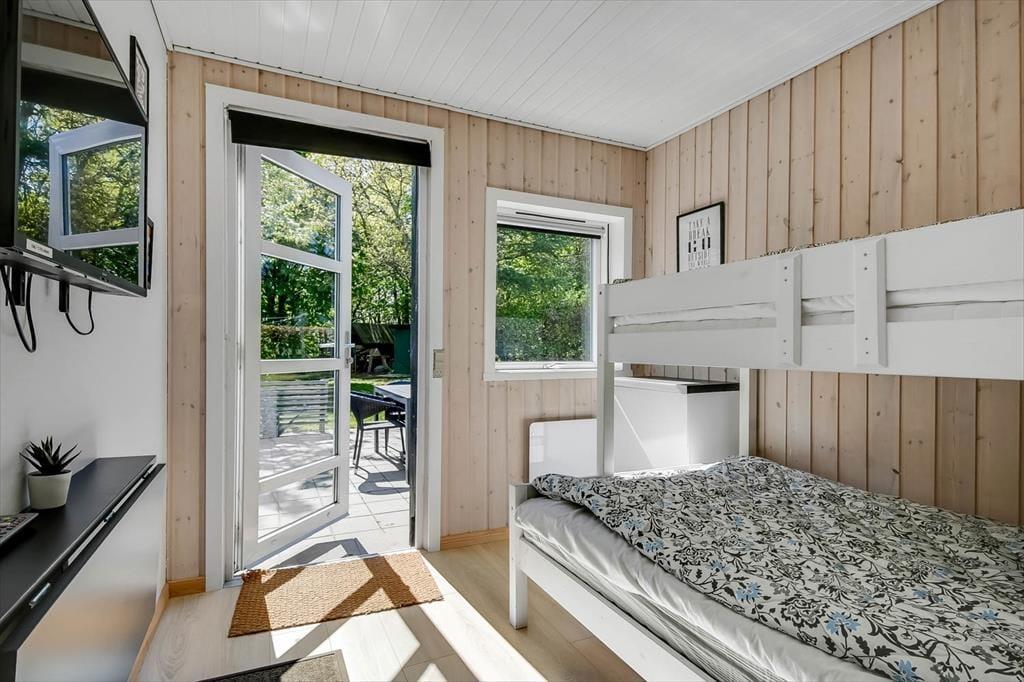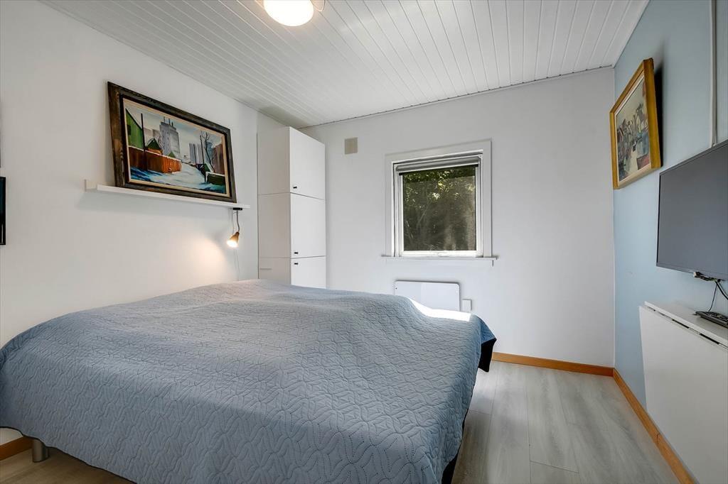 Sommerhuset er renoveret i 2018, så de mange indendørs kvadratmeter fremstår velholdte og indbydende. Hyggelig er atmosfæren bestemt også– ikke mindst i opholdsafdelingen, hvor køkken-alrum og stue ligger i åben forbindelse, blot adskilt af et par trin. Når I hygger jer her, har I godt overblik over de grønne, fredede omgivelser og kig til fjorden, og så er der både brændeovn og varmepumpe, der gør det let at holde varmen selv på kølige aftener. Huset har desuden et badeværelse og tre gode soveværelser, der giver plads til i alt seks feriegæster. Desuden er der i 2021 kommet et anneks på 10 m² med to enkeltsenge og toilet med håndvask, så her er der plads til yderligere to personer.