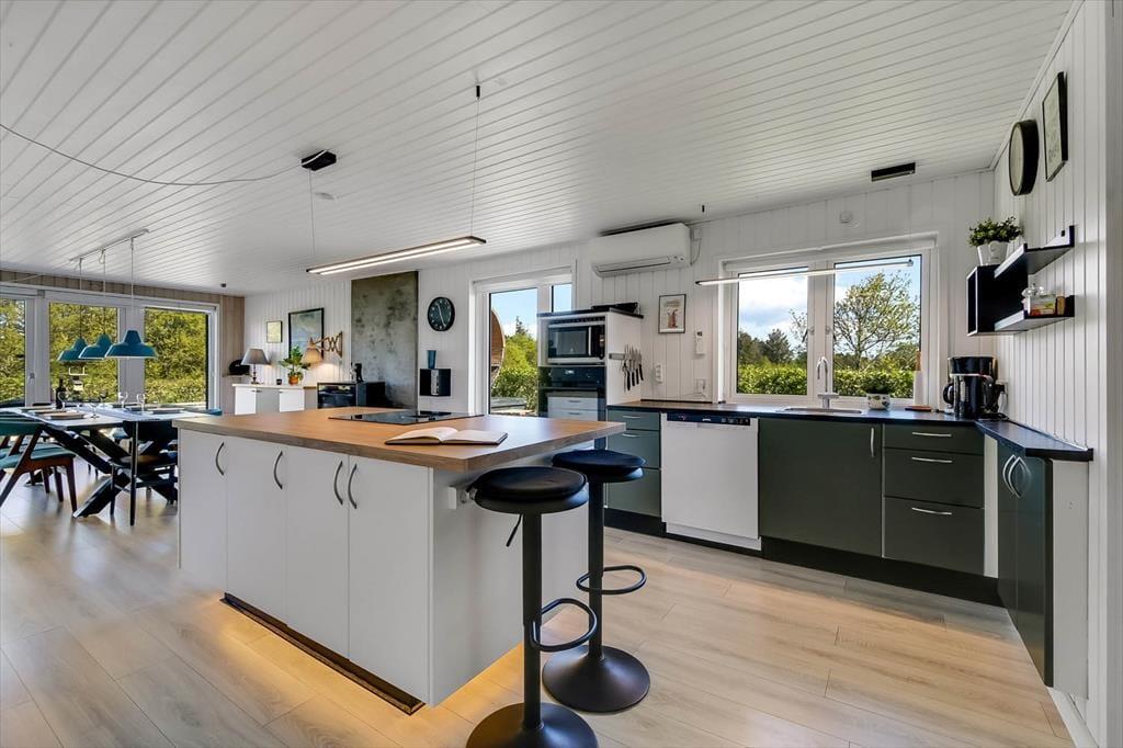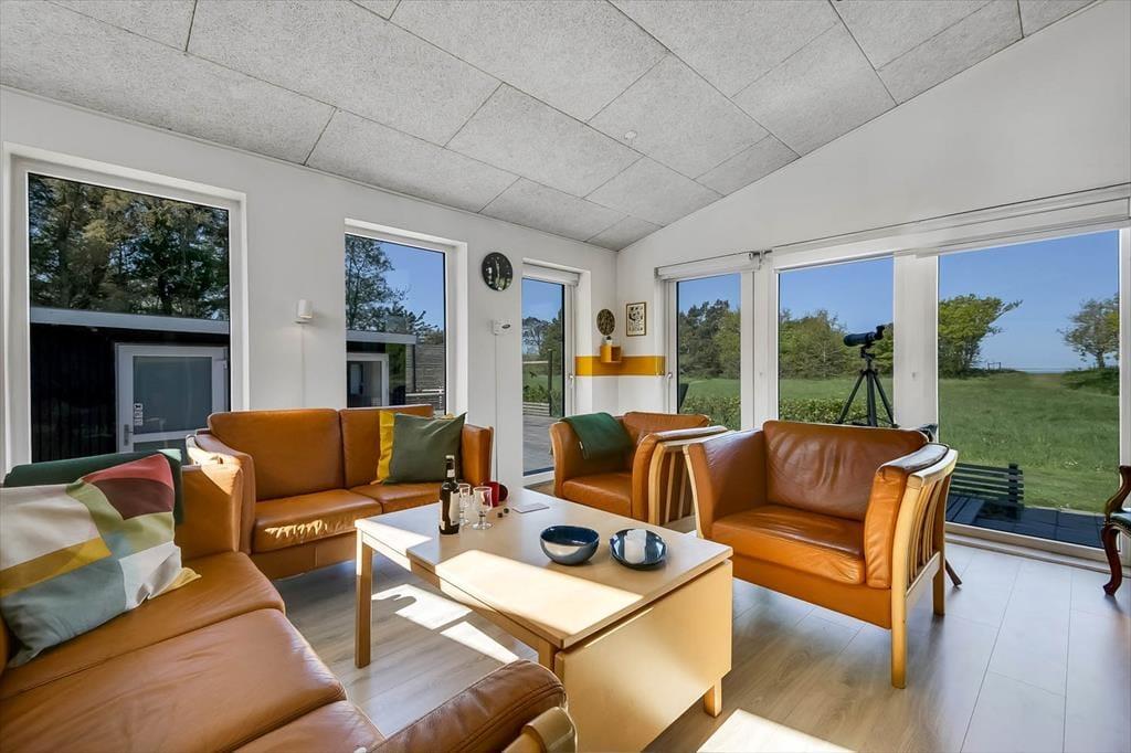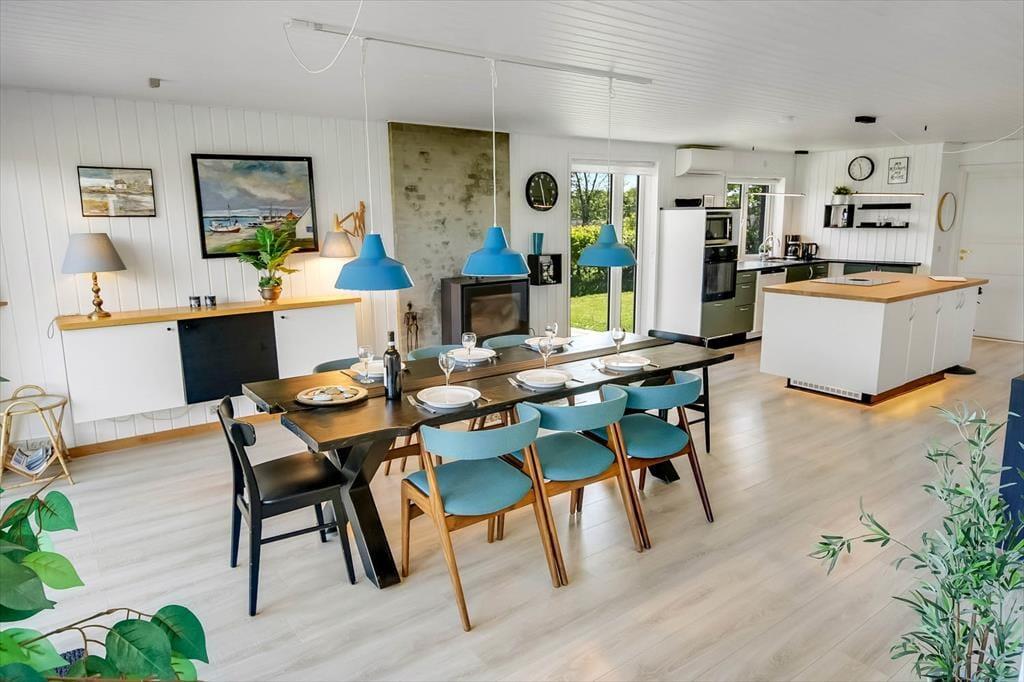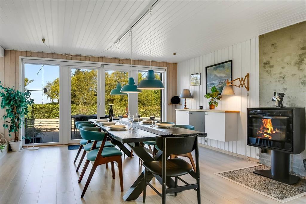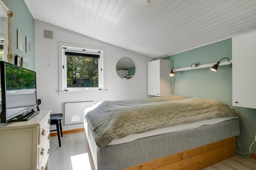 Sommerhuset er renoveret i 2018, så de mange indendørs kvadratmeter fremstår velholdte og indbydende. Hyggelig er atmosfæren bestemt også– ikke mindst i opholdsafdelingen, hvor køkken-alrum og stue ligger i åben forbindelse, blot adskilt af et par trin. Når I hygger jer her, har I godt overblik over de grønne, fredede omgivelser og kig til fjorden, og så er der både brændeovn og varmepumpe, der gør det let at holde varmen selv på kølige aftener. Huset har desuden et badeværelse og tre gode soveværelser, der giver plads til i alt seks feriegæster. Desuden er der i 2021 kommet et anneks på 10 m² med to enkeltsenge og toilet med håndvask, så her er der plads til yderligere to personer.