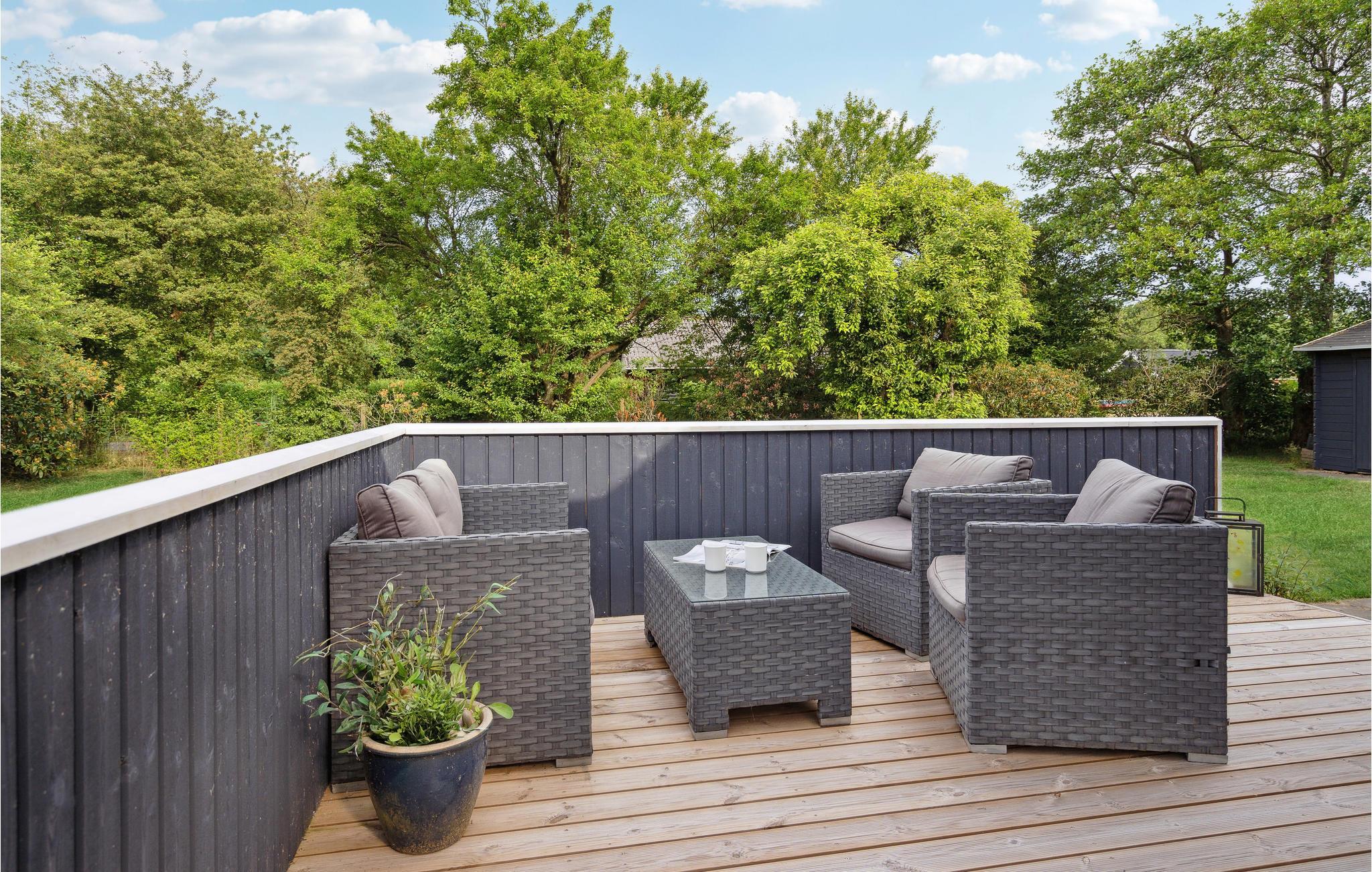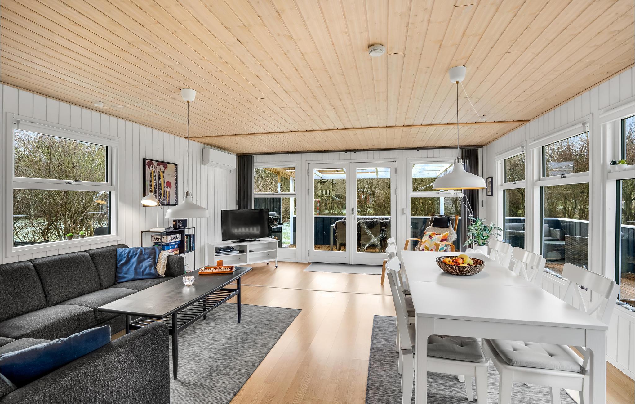 Nyd en afslappende ferie og en smuk bolig i dette charmerende feriehus. På grund af de store vinduespartier kan I nyde masser af naturligt lys i opholdsrummet, som kombinerer køkken, spisestue og stue. Det har den fordel, at I til enhver tid kan deltage i fælles samtaler, uanset om I laver mad eller er i gang med en leg i sofaen. På kølige dage bidrager brændeovnen til den gode atmosfære, og den delvist overdækkede terrasse er højdepunktet på sommerdagene. Start der med en lækker morgenmad og se jeres børn spille fodbold og boltre sig i haven.