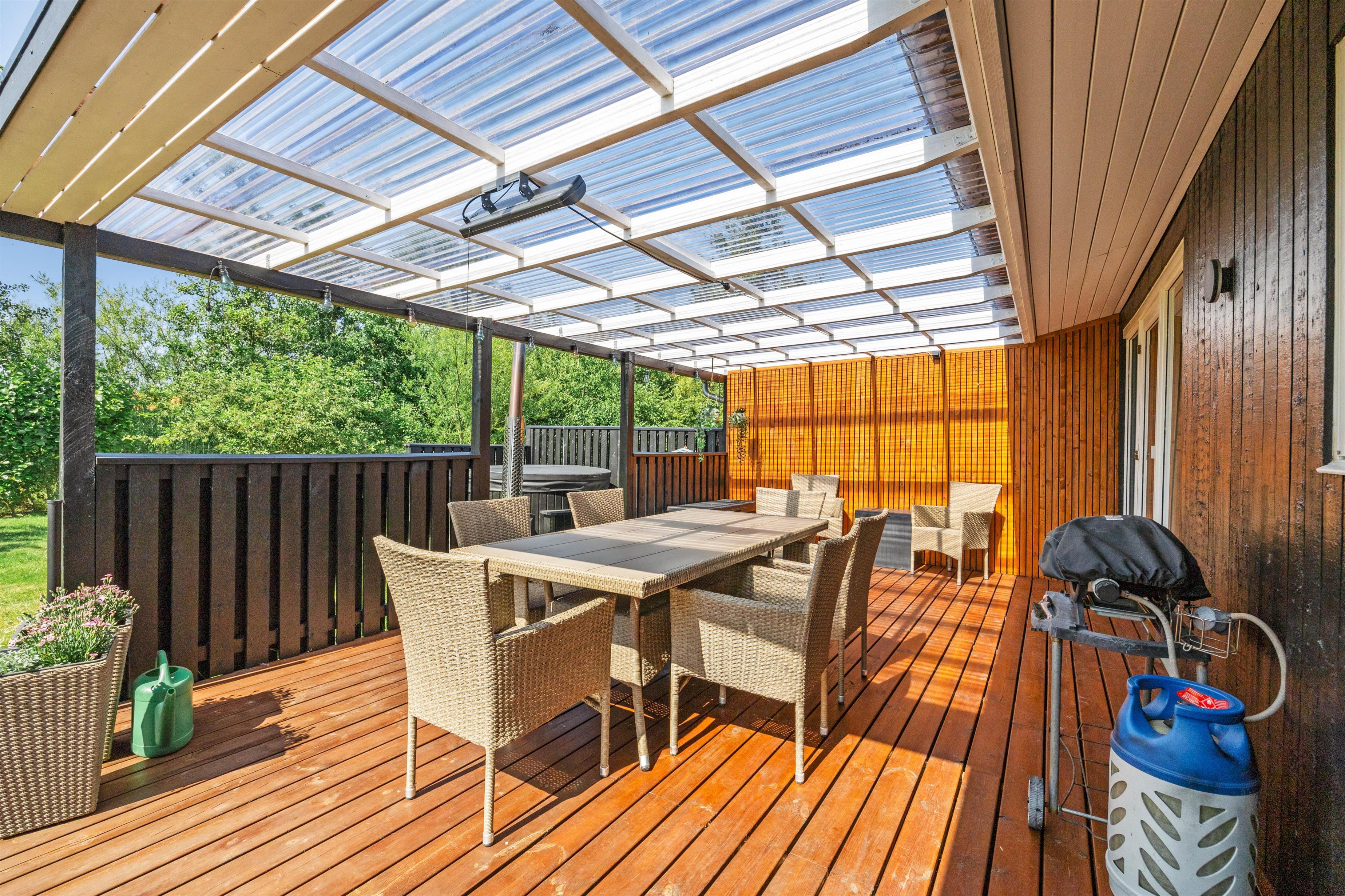 Udemiljøet omkring sommerhuset tilbyder et skønt mix af afslapning og naturoplevelser. På den åbne, afskærmede og overdækkede terrasse kan I nyde det danske vejr uanset årstid. Den overdækkede del giver mulighed for at sidde ude, selv når vejret er mindre strålende, mens den åbne del er perfekt til solrige dage. Den store plænegrund indbyder til leg og spil for både børn og voksne, mens hunden kan glæde sig over at løbe frit rundt.