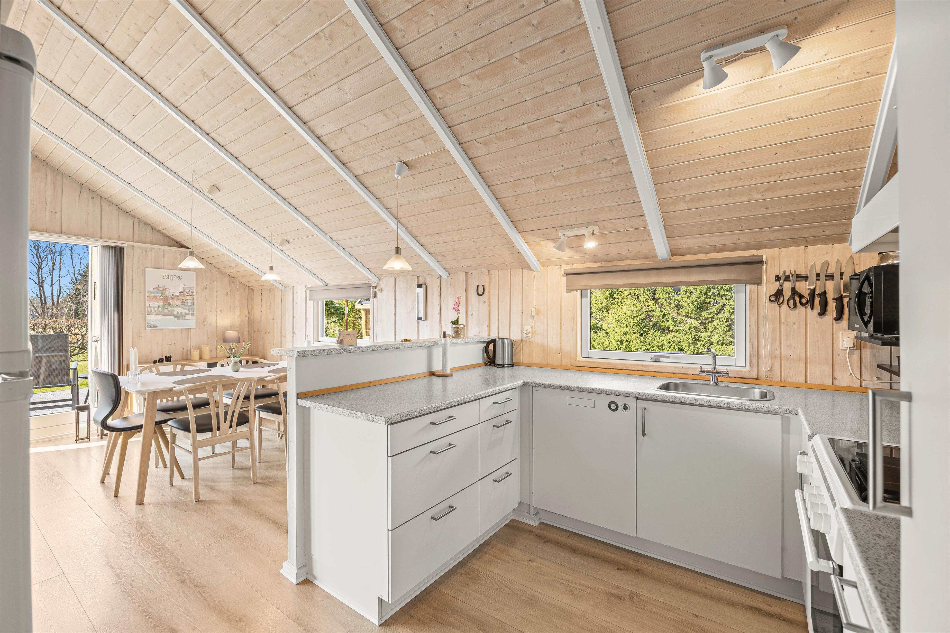 Når I træder indenfor, bliver I mødt af en lys og indbydende atmosfære i det åbne køkkenalrum, som skaber en perfekt ramme for jeres ophold. Køkkenet er praktisk indrettet med en opvaskemaskine, der gør det nemt at klare opvasken, så I hurtigt kan komme tilbage til hyggen i stuen. Her bidrager brændeovnen med både varme og charme, hvilket indbyder til afslappende stunder sammen.