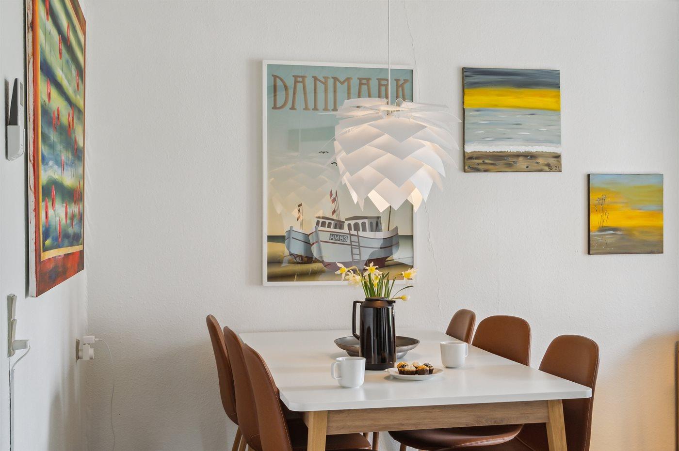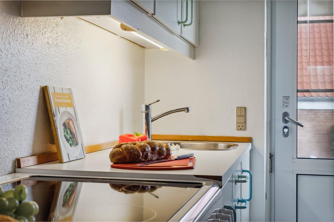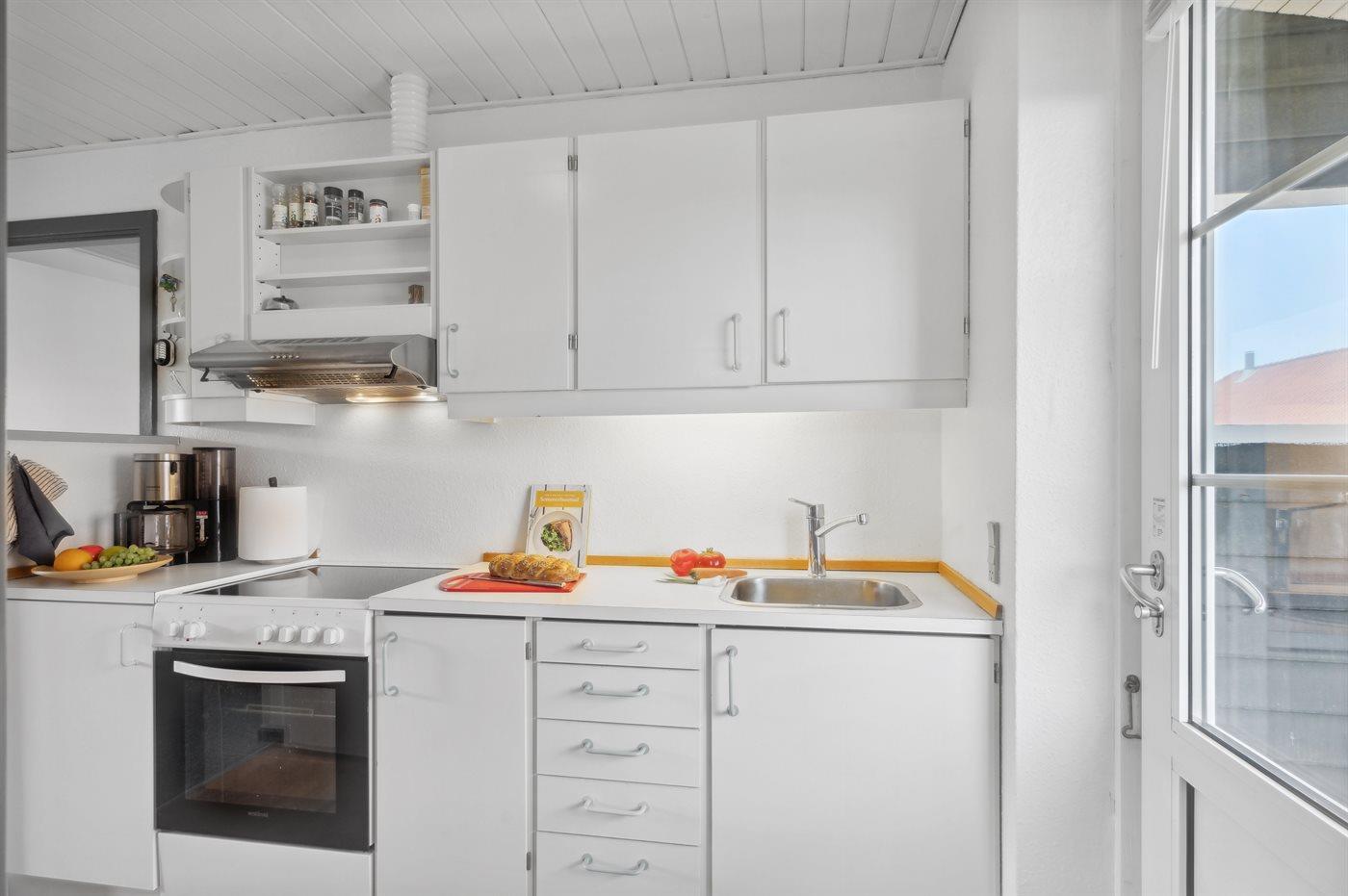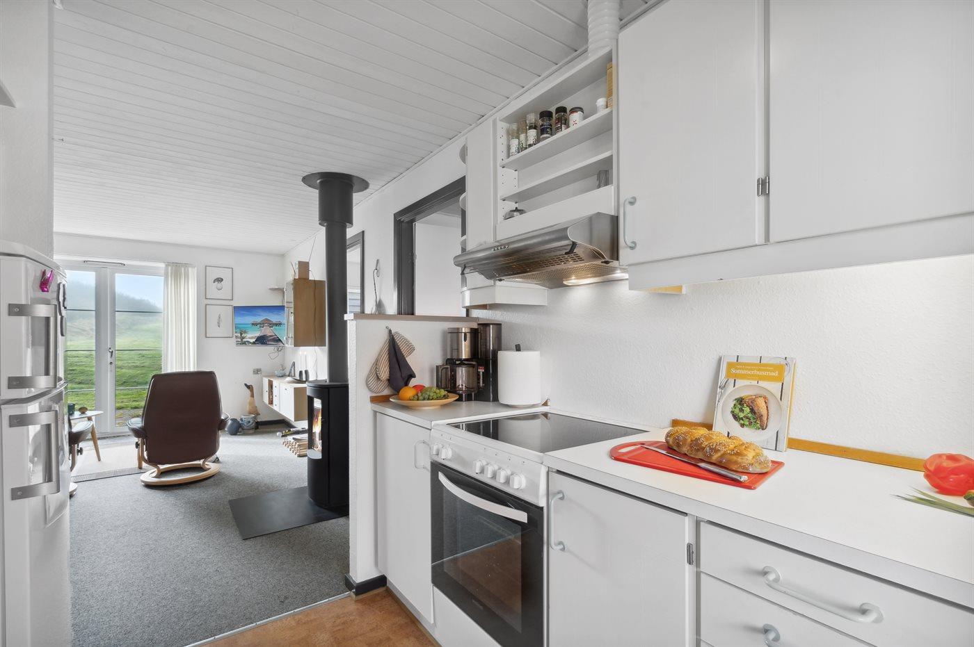 Køkkenet er udstyret med 1 køleskab. Der er 4 keramiske kogeplader, varmluftovn.