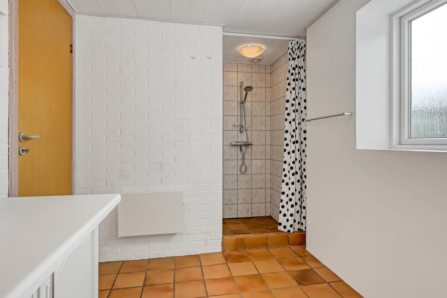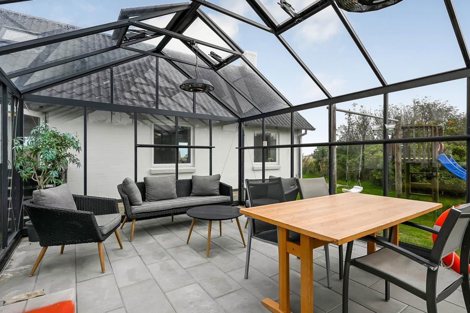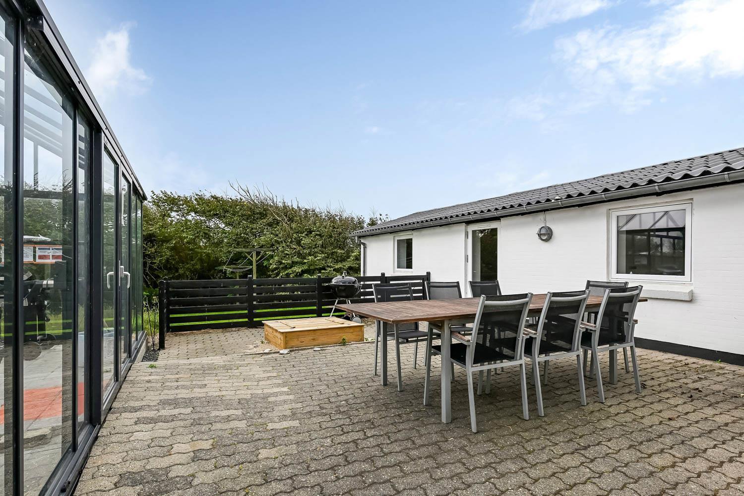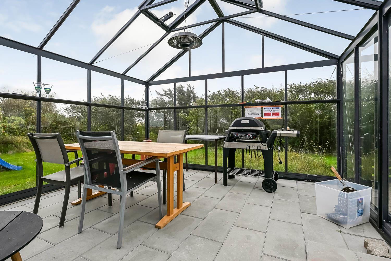 Via baggangen nås husets praktiske tilbygning. Her er der adgang til husets største soveværelse (1DS) med ekstra sofa og sofabord hvor en god bog let kan nydes. Fra baggangen er der ekstra udgang til terrassen og herfra er der adgang til det fantastiske orangeri hvor man kan sidde og nyde udsigten over markerne. Ekstra grovkøkken med praktisk håndvask, aflæggeplads, skabe og vaskemaskine. Tilbygninger byder også på et toilet med håndvask. Separat adgang til stor sauna og separat adgang til endnu et bad med bruser. For enden af gangen er der et dejlig rum med spabad, motionscykel og crosstræner. Helt perfekt til de aktive eller til dem som ønsker at forkæle dem selv med en tur i spabad. Der er klinkegulv med gulvvarme i hele tilbygningen. Barneseng og barnestol til de mindste gæster.