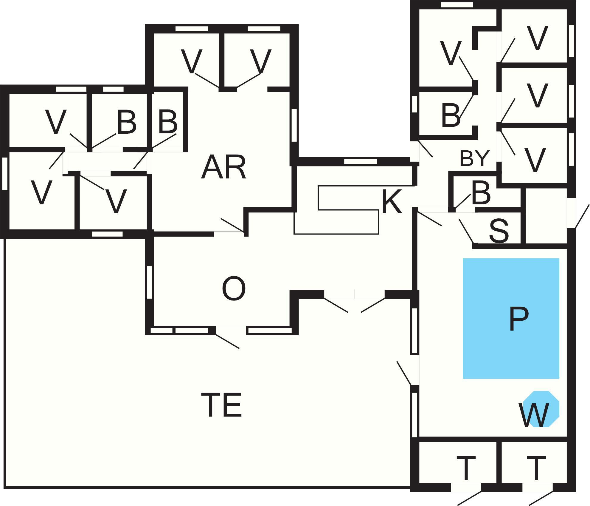 Huset er yderst rummeligt og veldimensioneret og bygget op omkring fire separate soveafdelinger i den ene ende af huset og fem soverum i forbindelse til aktivitetsrummet med i alt ni soveværelser. Hver afdeling har eget badeværelse, og der er et ekstra badeværelse i forbindelse med poolafdelingen og aktivitetsrummet. Derudover er der en hemse, der er perfekt til børnenes leg eller en god film på tv’et.