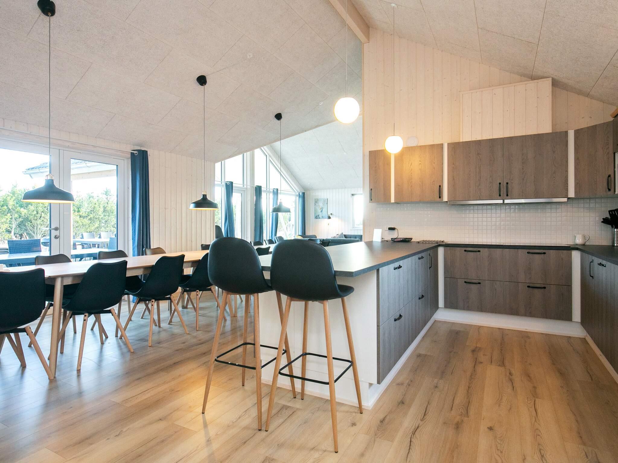 Spise-/opholdsrum er smagfuldt indrettet med to høje barnestole, sofaafdeling og brændeovn. I det gennemtænkte køkken med brændeovn er der køleskab og en stor fryser samt to opvaskemaskiner og to komfurer, så der er rig mulighed for at kokkerere.