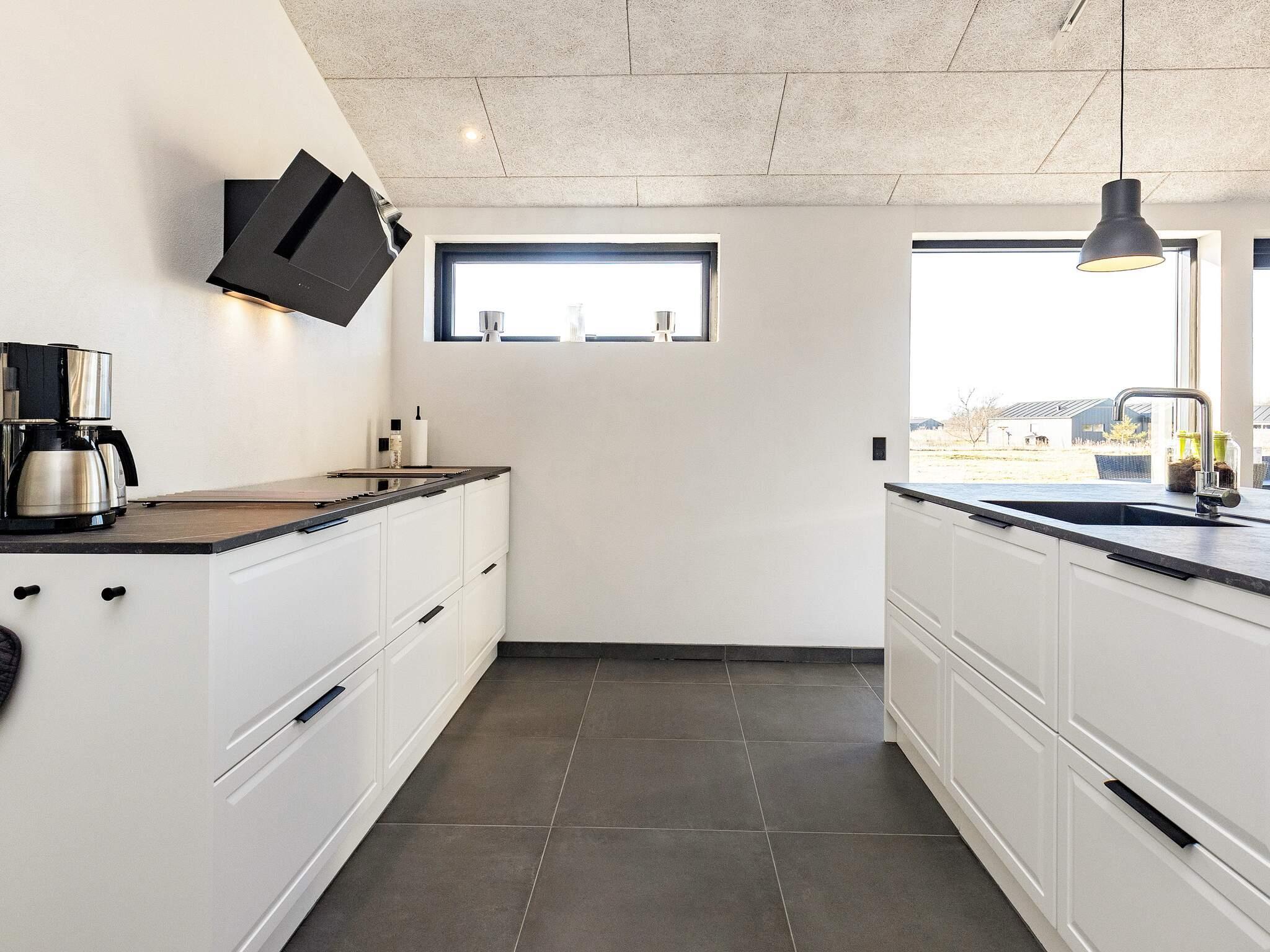 Hjertet i sommerhuset er en stor åben stue med god akustik i forbindelse med det veludstyrede køkken. Der er plads til, at alle kan mødes og nyde madlavning, måltider, spil, en god film eller hvad der ellers passer dig. Rummet har store vinduespartier, der lader det fascinerende nordjyske lys strømme ind, og på varme dage kan du åbne op til den dejlige træterrasse.