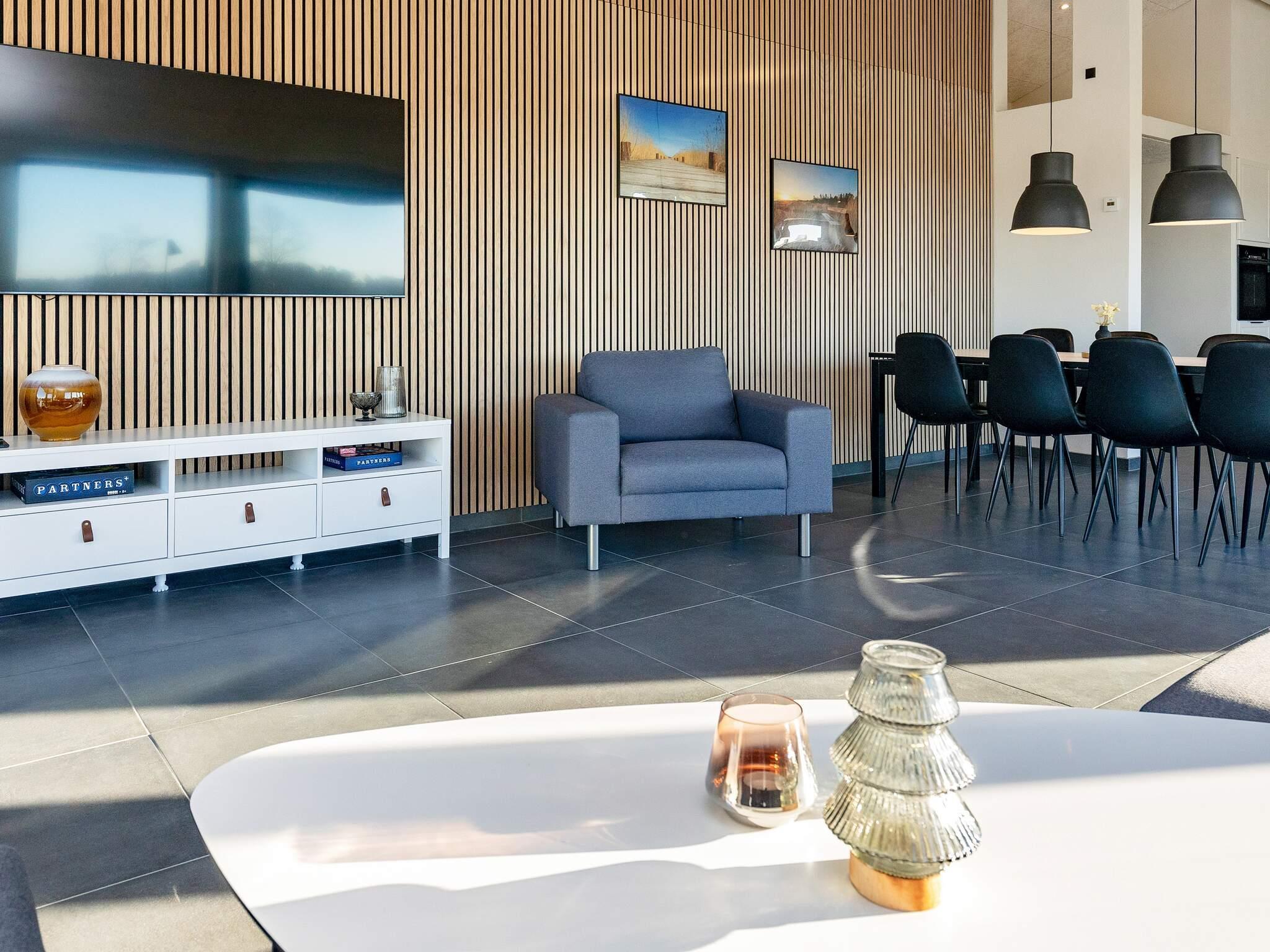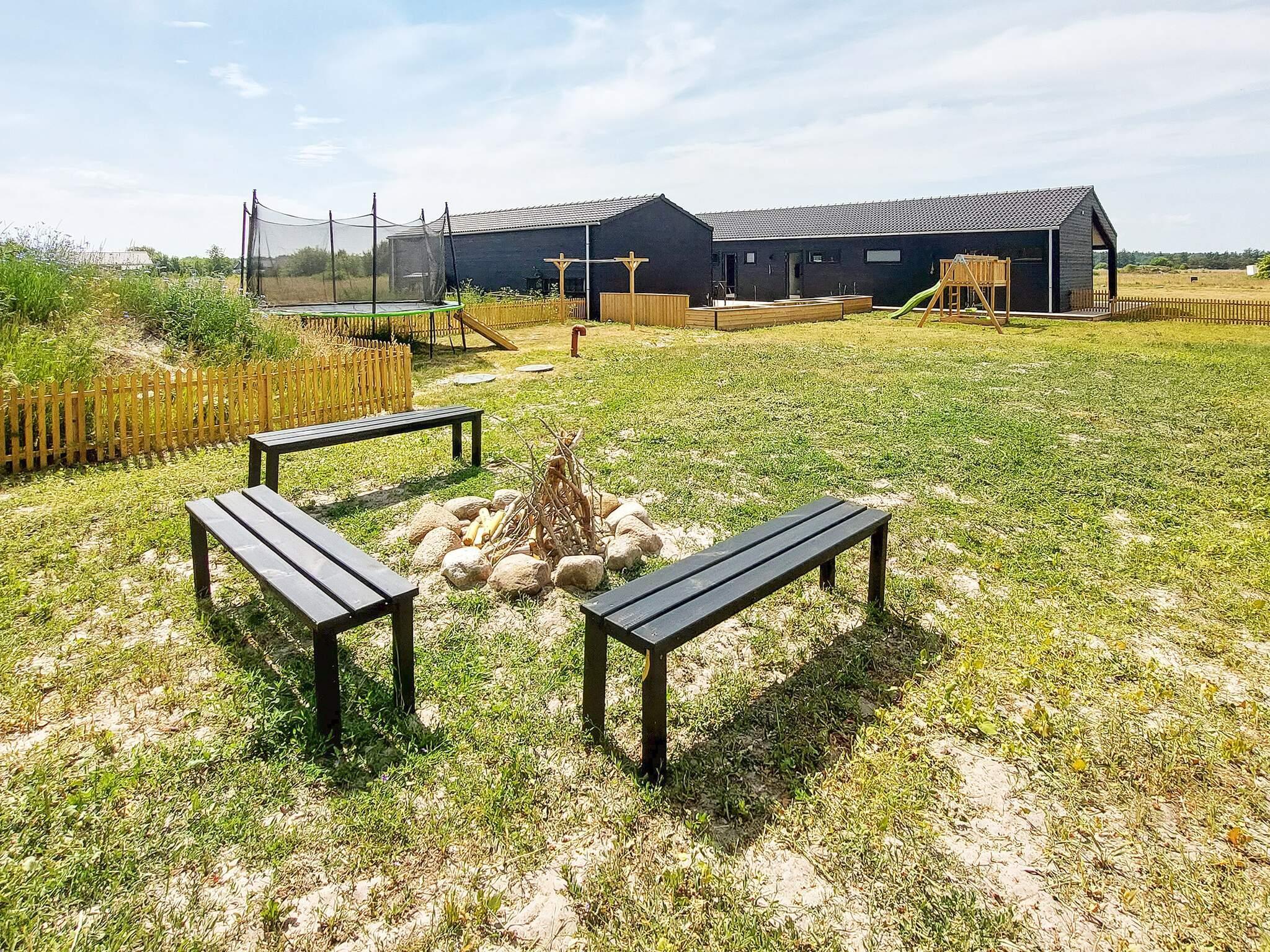Udendørs indbyder sommerhusets store terrasser, som forbinder sig med huset, til solbadning, grill og hygge, og der er god plads til leg og boldspil på plænen. Der er også et legetårn med gynger, en rutsjebane og en sandkasse.