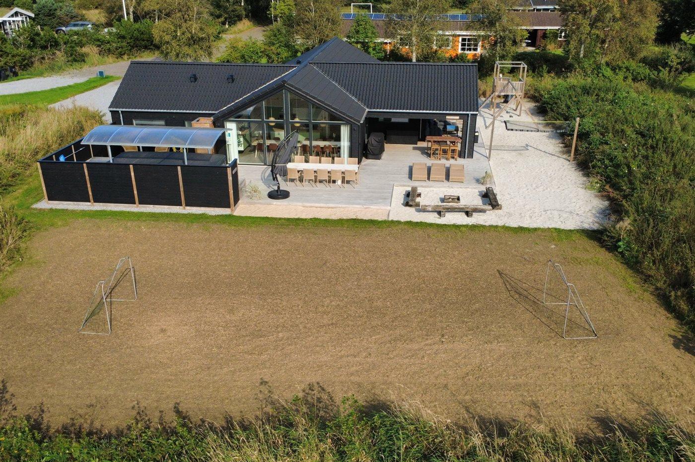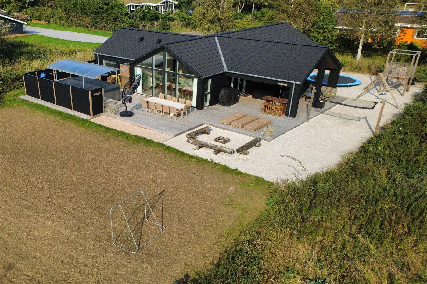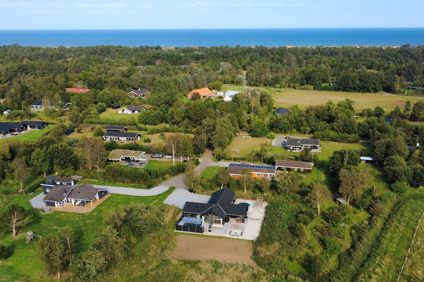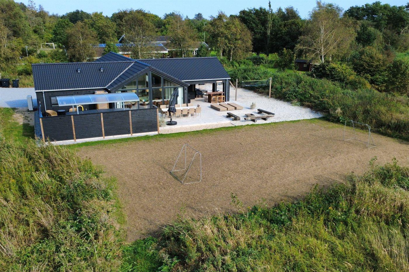 Ferieboligen er beliggende på en 3000 m² stor naturgrund. Der er 800 m til havet. Nærmeste forretning er beliggende i en afstand af 2000 m. Til ferieboligen hører åbent terrasseareal. Desuden er der overdækket terrasse. Gynge. Trampolin. Legetårn. Rutchebane. Beachvolley. Petanque. Udendørs bruser. Gasgrill og pizzaoven står til rådighed. Der er installeret stik til opladning af elbil. Med 11 kW ladeeffekt. Parkering ved ferieboligen.