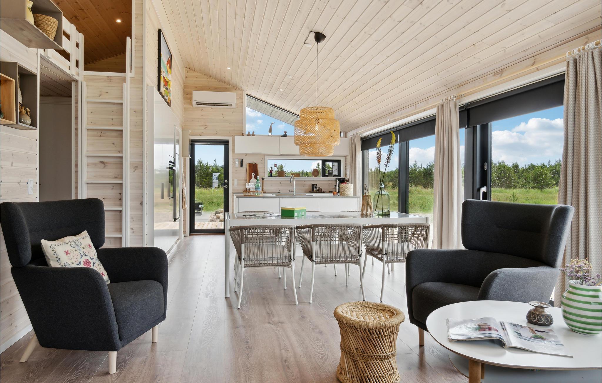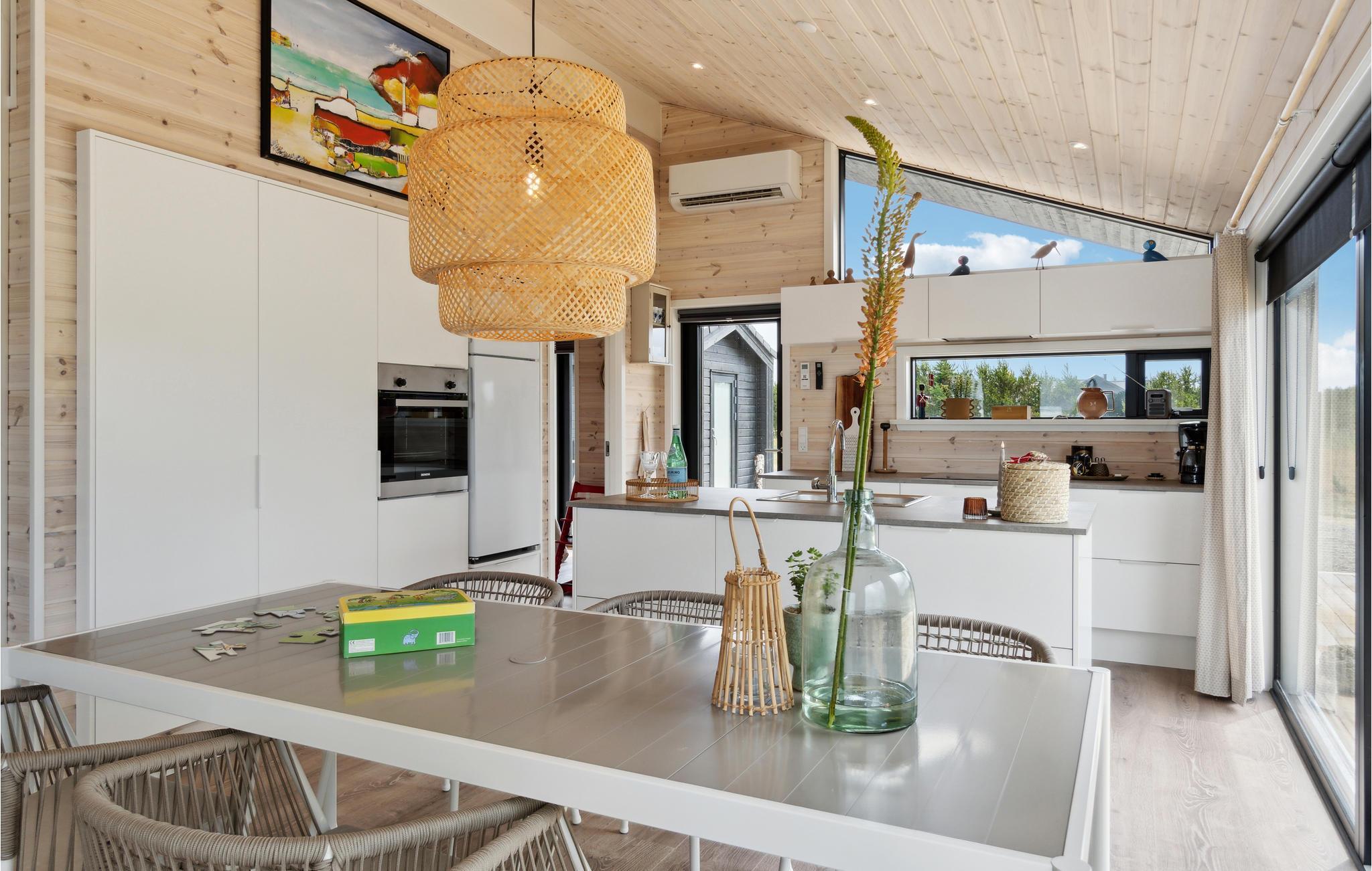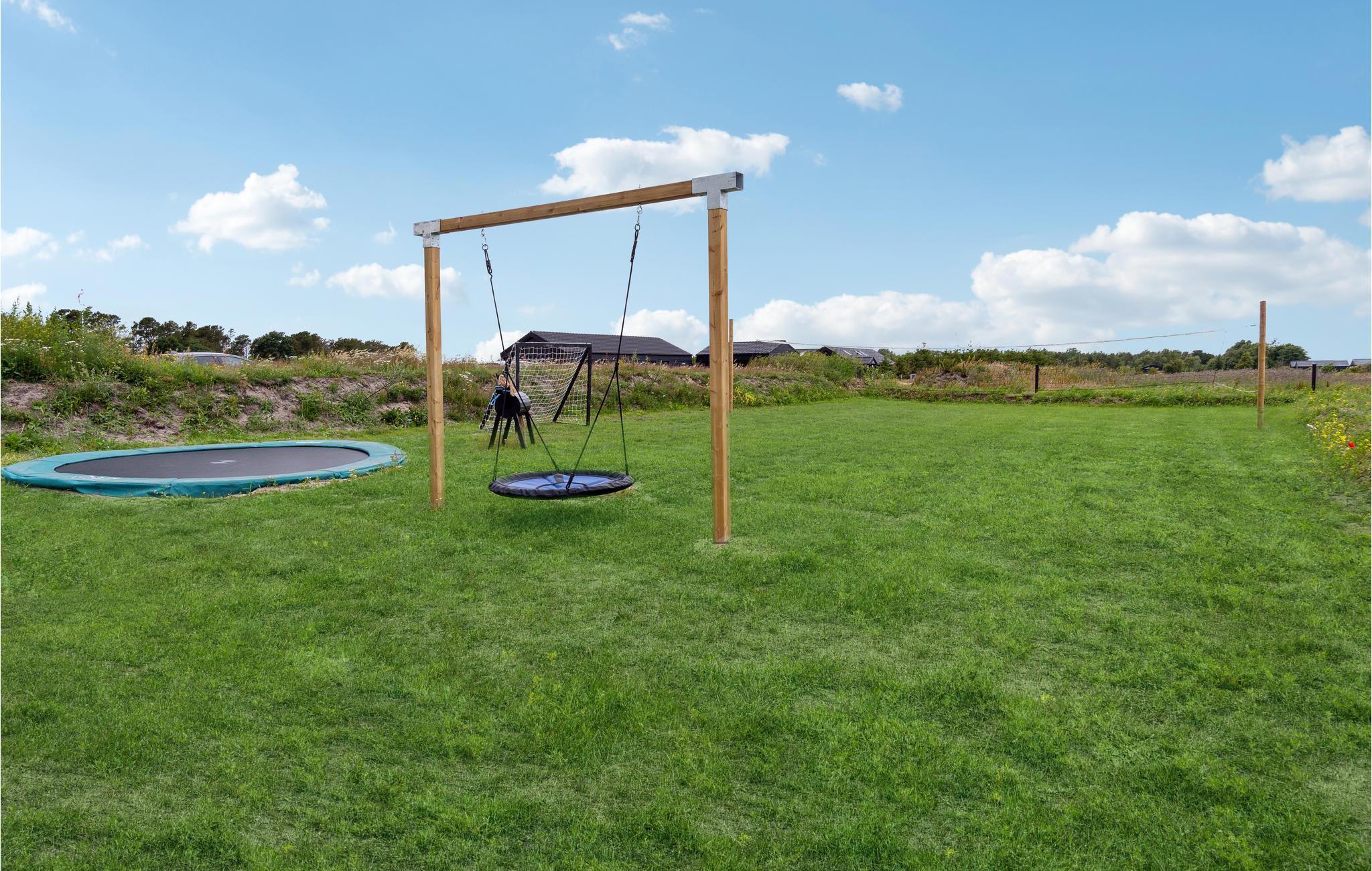 I dette komfortable feriehus beliggende i et idyllisk sommerhusområde med sø på grunden venter ren råhygge! Her kan I endelig koble af og tilbringe ægte kvalitetstid med dem, I holder af. Husets byggestil med høje lofter tillader en hyggelig hems, som jeres børn helt sikkert vil synes om. Atmosfæren er moderne og lys, takket være de fantastiske panoramavinduer, de lyse trægulve og træpaneler samt den smarte belysning. Lav puslespil med børnene ved spisebordet eller deltag i børnenes sjove sovehule-byggeri på hemsen. Her er der hjemligt og rart at være, ikke kun indenfor, men også udenfor på den store terrasse og i den private have, hvor I også kan lave et stemningsfuldt lejrbål. Haven er et paradis for store og små, for her kan børnene gynge og hoppe, og hele familien kan spille volleyball. Med en udendørs bruser og et gæstetoilet i annekset behøver I ikke at gå inden for hele tiden, og strandsandet kan skylles af. Terrassen indbyder til snacks, kølige drinks, solbadning og afslapning i vildmarksbadet. Forfrisk jer i skønne Kattegat sammen med børnene. Der er desuden en kørestolsrampe ned ad klitterne til badebroen.