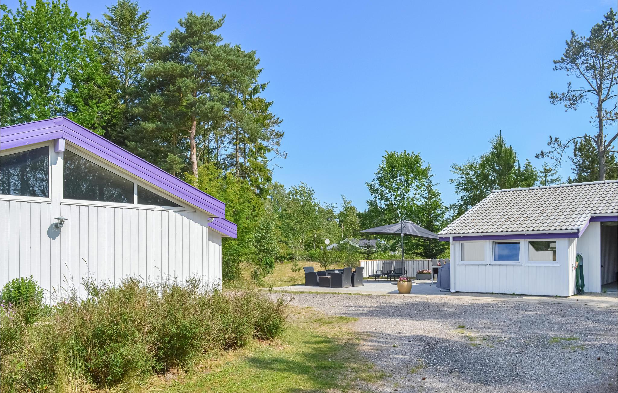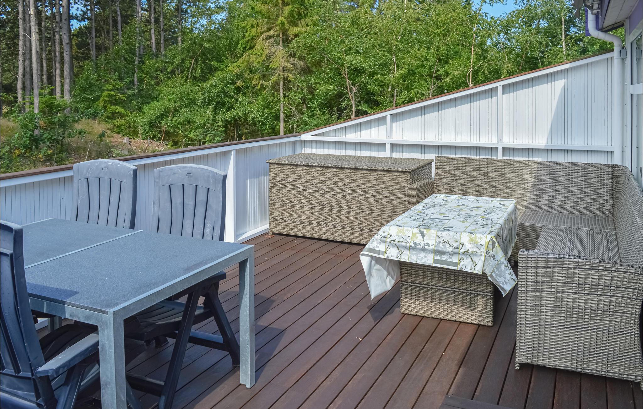 Grunden er omkranset af træer, og ferfor kan I i fred og ro slappeaf på husets store terrasser og tage solbad, hvis vejret tillader det. Da huset er bygget i flere niveauer, er der gode muligheder for at finde læ på terrasserne.