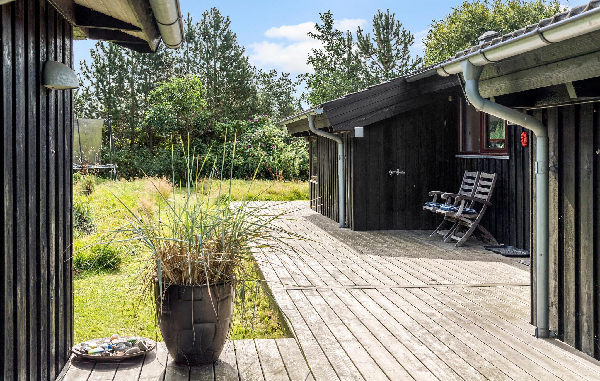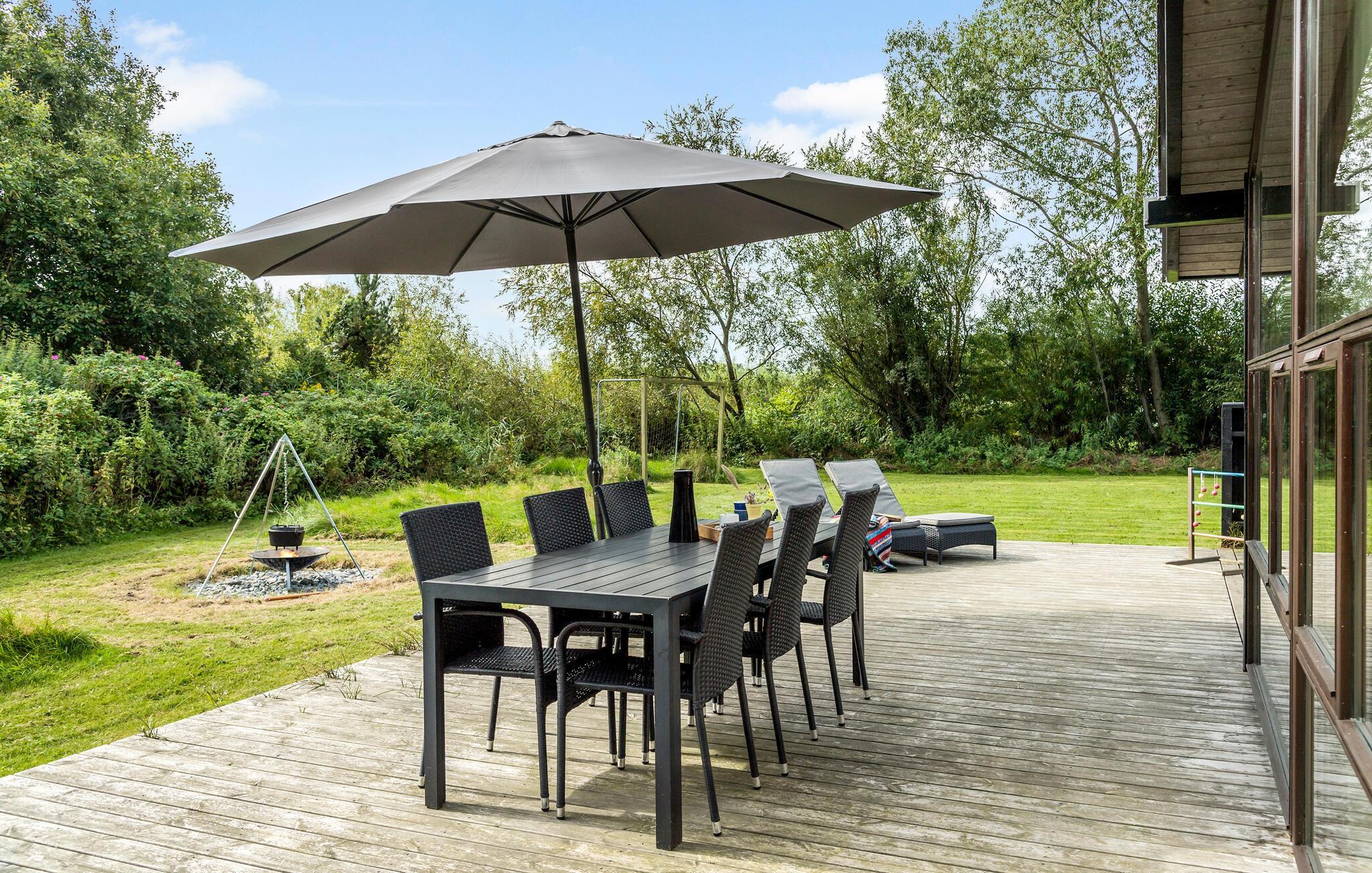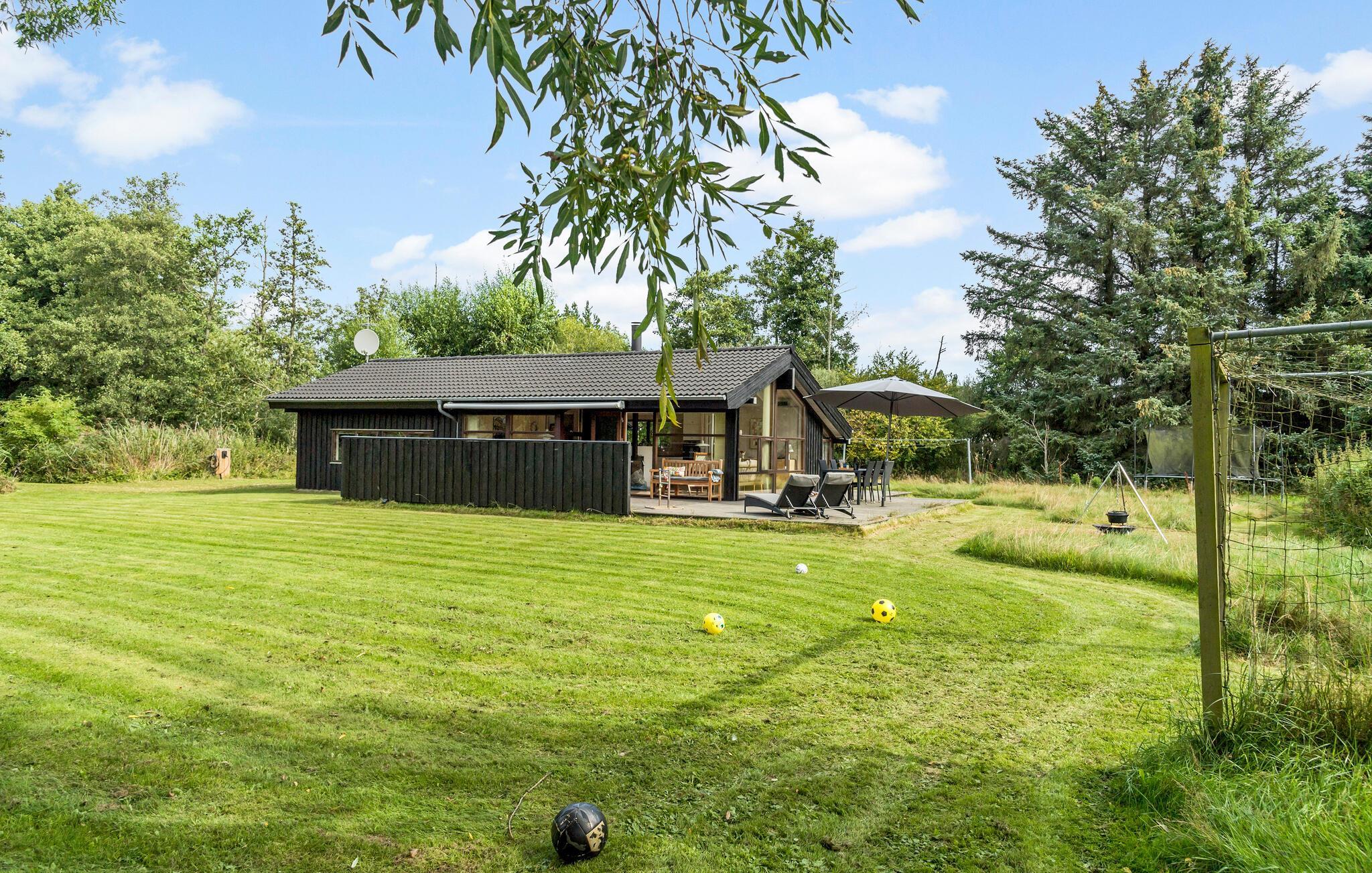 Flot feriehus i Strandby med spabad, sauna og stor terrasse i grønne omgivelser tæt ved stranden.