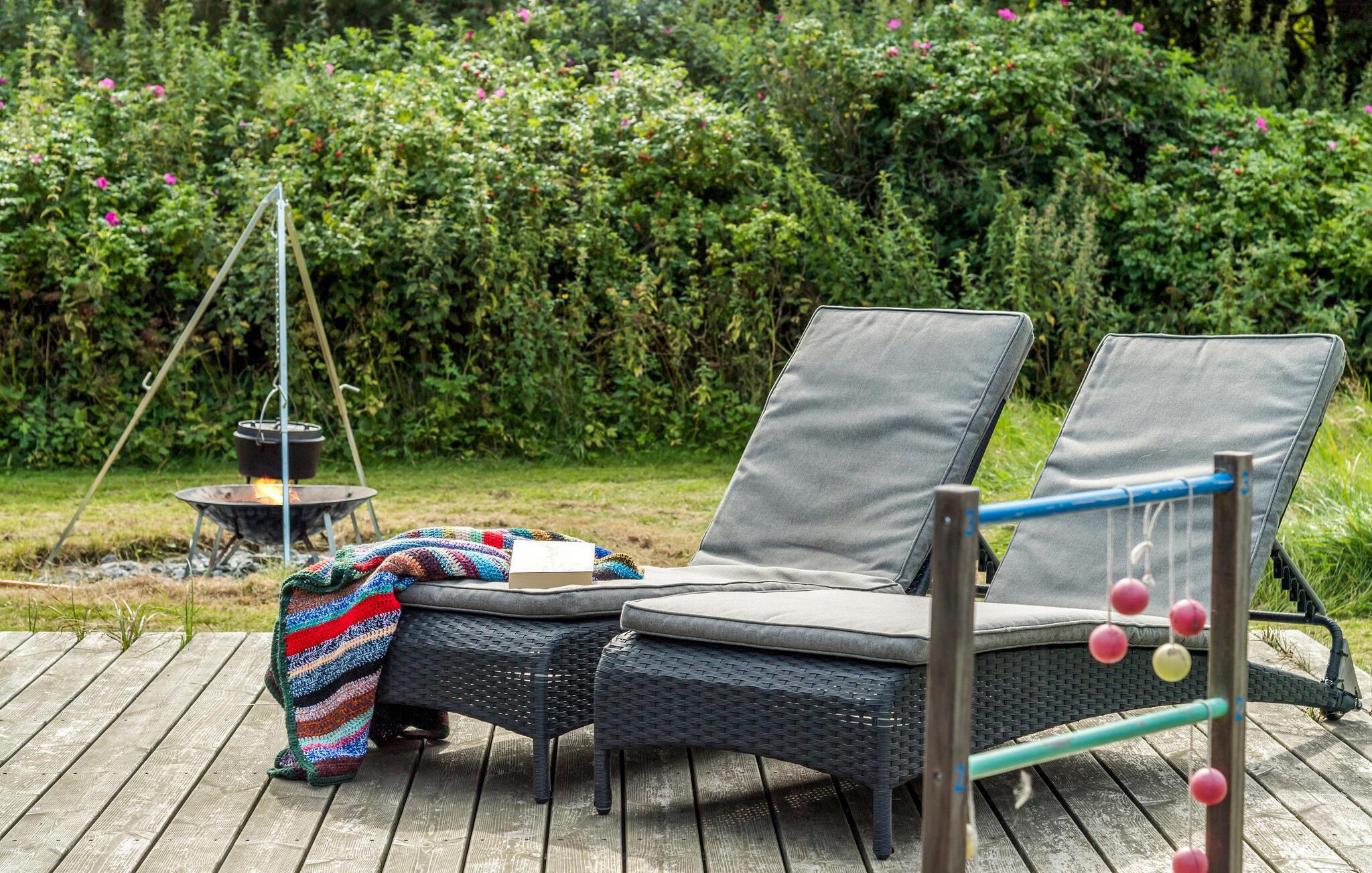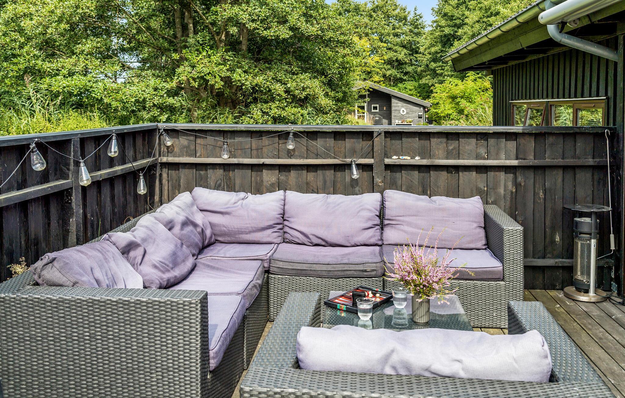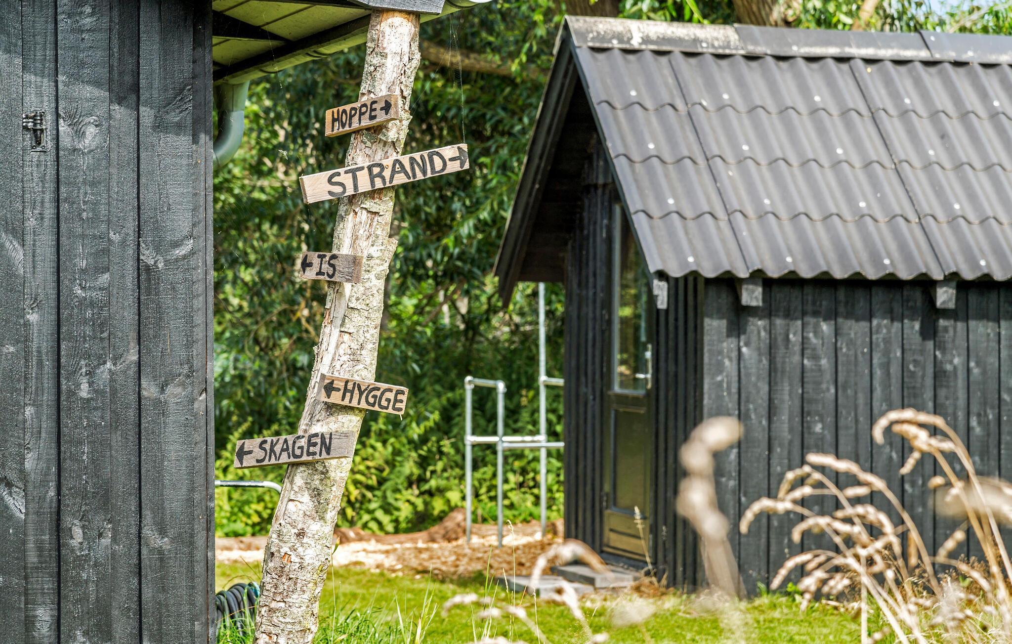 Flot feriehus i Strandby med spabad, sauna og stor terrasse i grønne omgivelser tæt ved stranden.