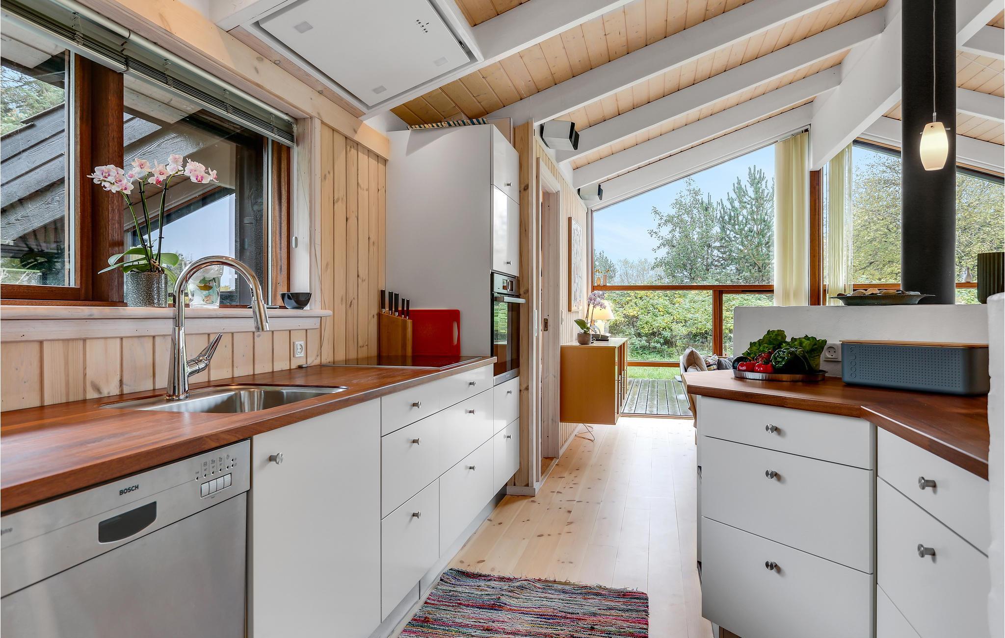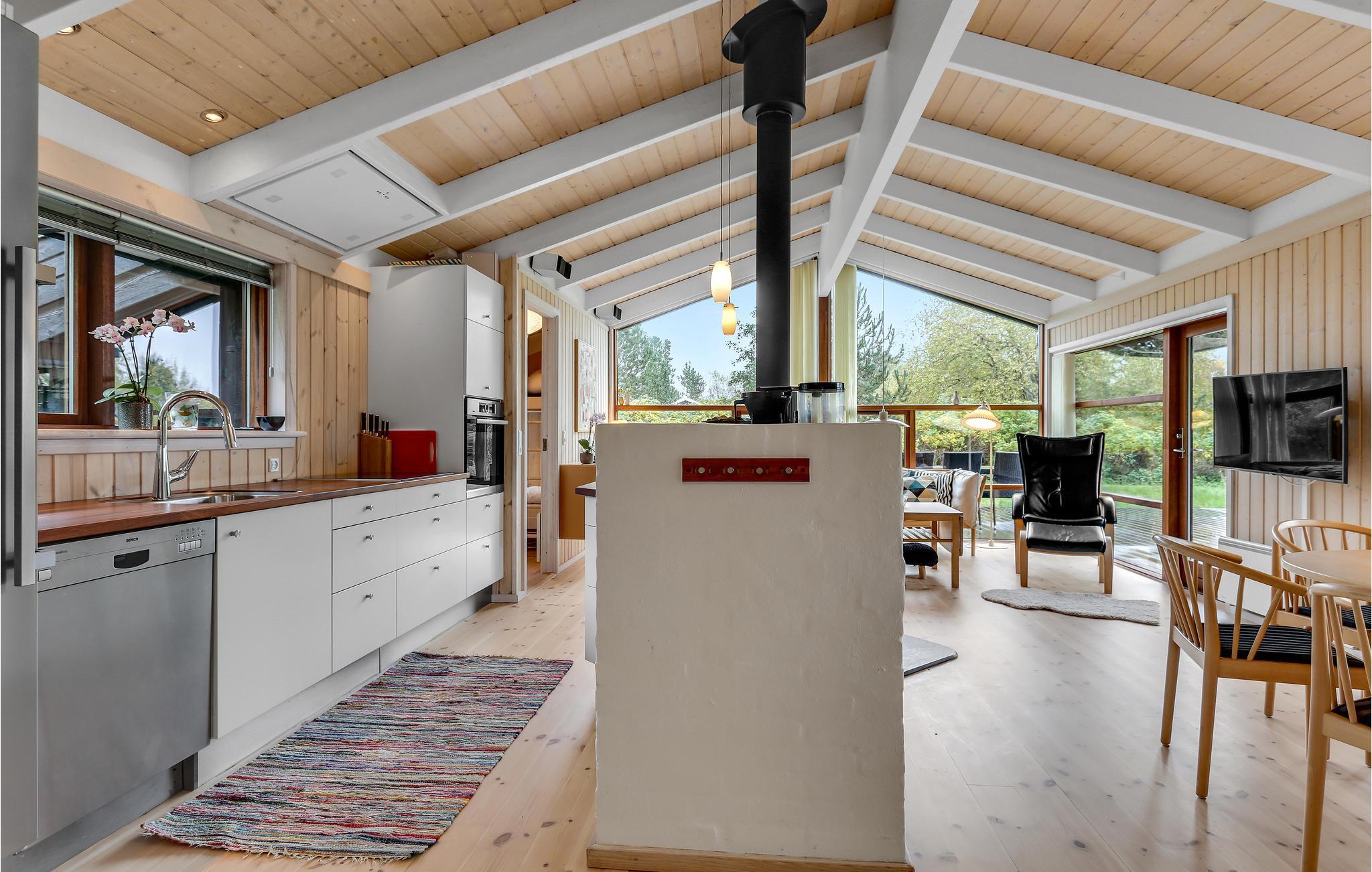 Tæt ved Nordjyllands milde østkyst ligger dette dejlige sommerhus i frodige, grønne omgivelser. Husets hjerte er den rummelige, åbne stue med store vinduesfront og en hyggelig atmosfære i enkel, nordisk stil. Nyd feriemåltiderne rundt om spisebordet og tilbring hyggelige aftener med en god film eller et brætspil, mens brændeovnen knitrer i baggrunden. Udenfor bliver den store træterrasse rammen om jeres rolige sommerdage, hvor hundene og børnene kan lege på græsplænen, og grillen braser med lækre ferieretter.
