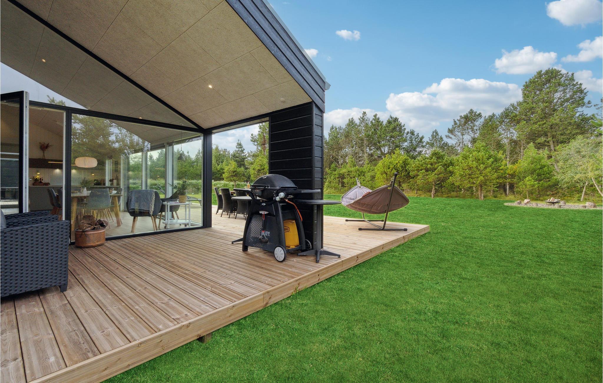 Velkommen til dette arkitektonisk interessante feriehus med en flot beliggenhed nær stranden. Huset er en drøm af lyse farver og fortryller med store panoramavinduer, som inviterer naturen indenfor. Her får I de ideelle rammer for en dejlig tid med hele familien. Selv de små vil føle sig hjemme i dette feriehus. Nyd udsigten over haven, mens I slapper af i den store hjørnesofa, og glæd jer til dejlige aftener med sjov fælles madlavning, lækre måltider og brætspilshygge ved spisebordet. Gå fra opholdsstuen og ud i den skønne have, hvor der er masser af plads til både store og små. Slik sol og slap af med kølige forfriskninger i loungehjørnet på den store træterrasse, mens jeres børn leger på livet løs. Senere kan hobbykokkene servere et lækkert måltid fra grillen, og sammen kan I nyde de lange sommeraftener udenfor. Gå til den smukke, bilfri strand, som I finder lige i nærheden.