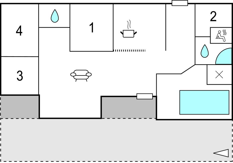 Huset er godt indrettet og fra den hyggelige stue med brændeovn, kan I holde øje med børnenes leg i swimmingpoolen. Den store og praktiske køkkenafdeling ligger i tilknytning til spiseafdelingen, og de to badeværelser samt fine soveværelser gør huset særligt velegnet til ophold for to familier. Op til hemsen, hvor børnere kan hygge sig, er der en rigtig trappe.