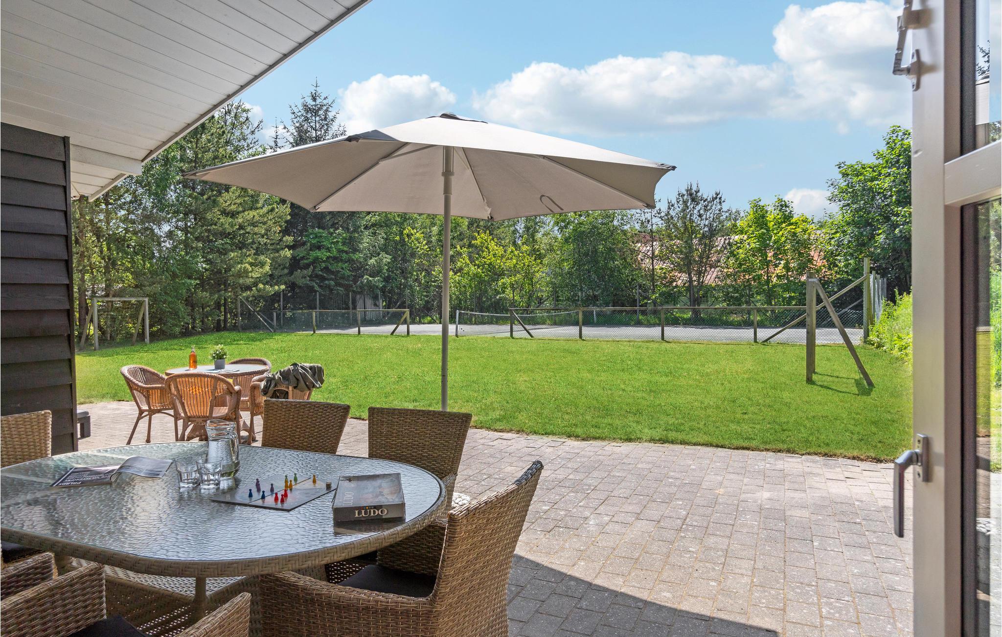Hyggeligt feriehus i Bratten med opvarmet pool, sauna og tennisbane tæt på stranden og indkøb.