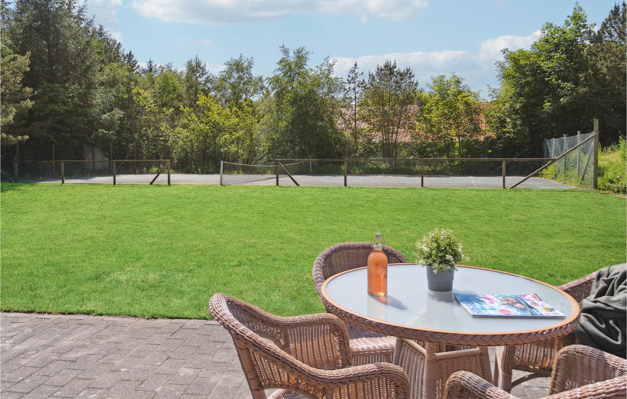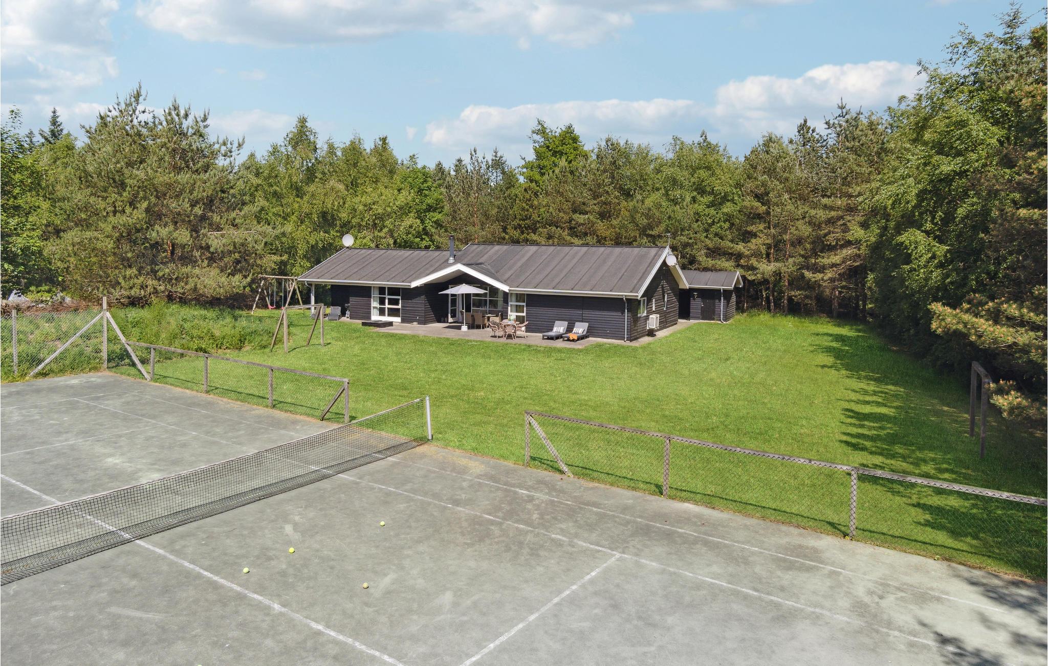 Den vestvendte terrasse indbyder til herligt udeliv og hertil kommer muligheden for et spil tennis på husets egen tennisbane, der er belagt med asfalt. Husets varmepumpe sørger for opvarmning af poolvandet og dette gør at opvarmning af poolen er ekstra billig og energivenligt. Der er ikke varmepumpe til rumopvarmning.