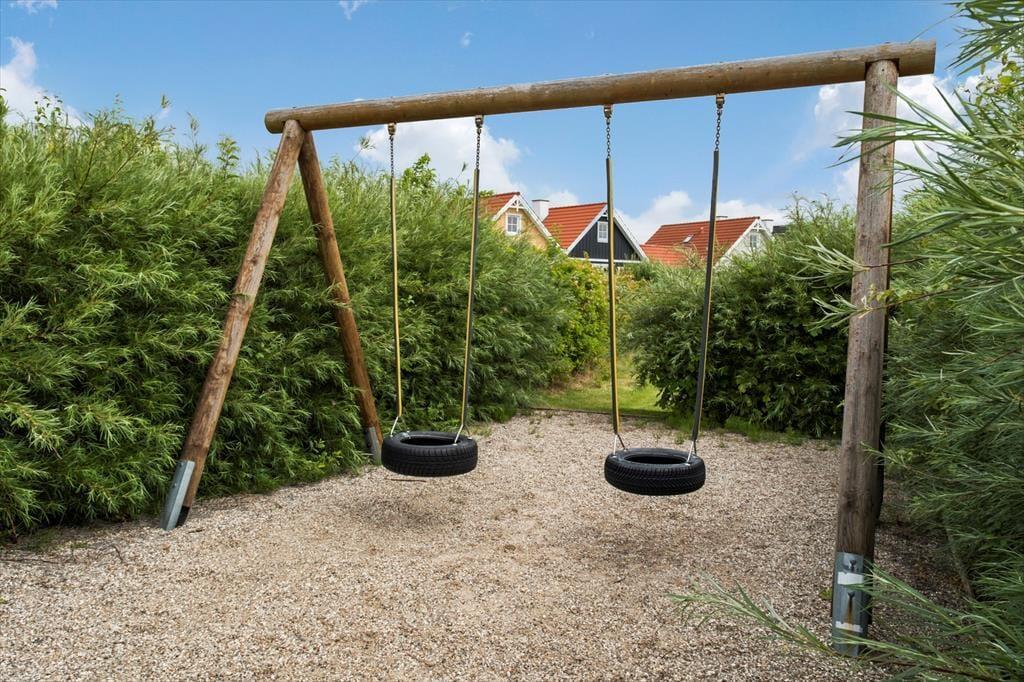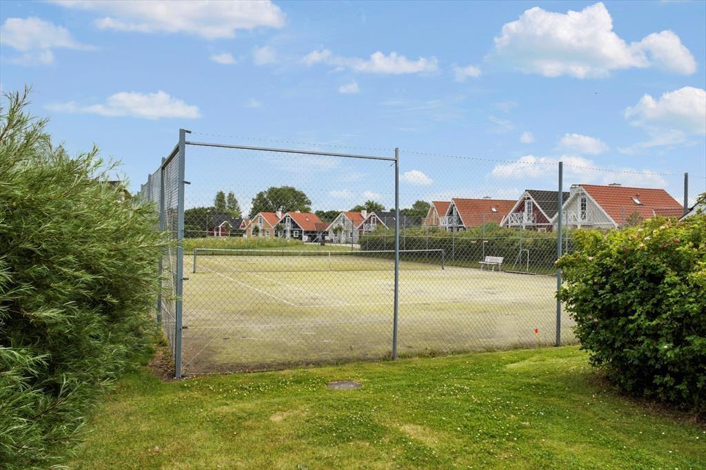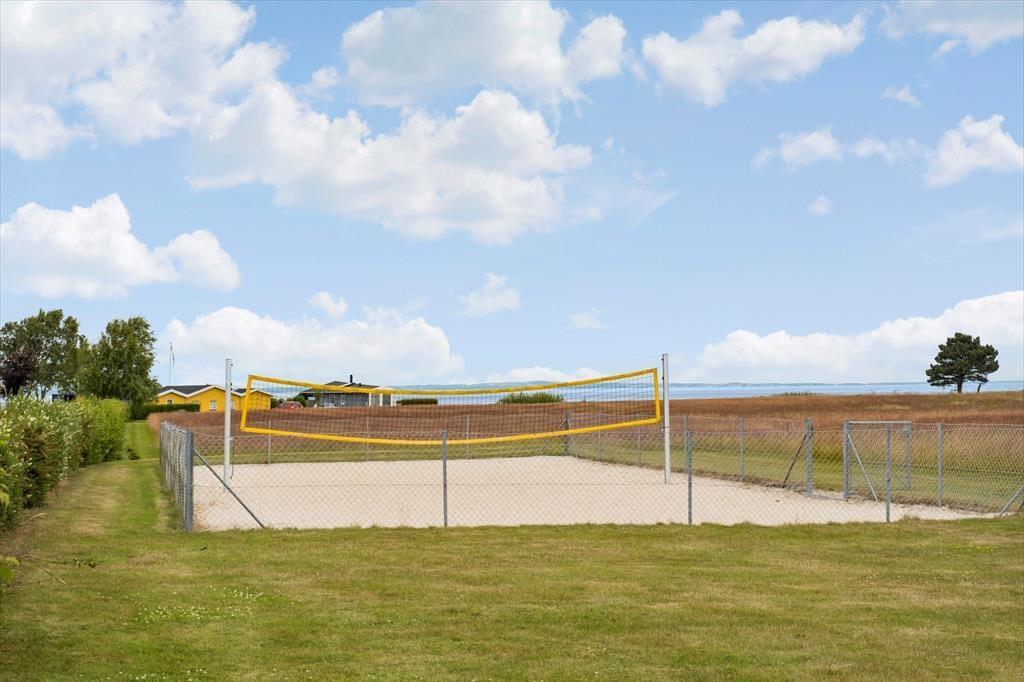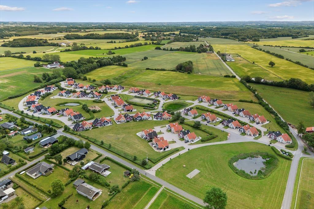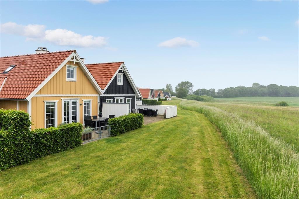 Udenfor finder du et grønt fællesareal, der danner rammen om udelivet i dette sommerhusområde. Her kan børnene lege frit, mens de voksne nyder en stille stund på terrassen med udsigt til de omkringliggende marker. Terrassen er perfekt til morgenkaffe, frokost under åben himmel eller en afslappende aften med grill og hyggeligt samvær. Den fredelige atmosfære og den friske luft fra det nærliggende hav sætter scenen for en afslappende ferie, hvor tempoet automatisk sænkes.