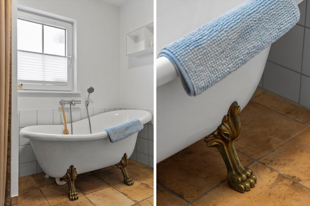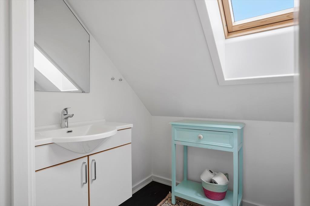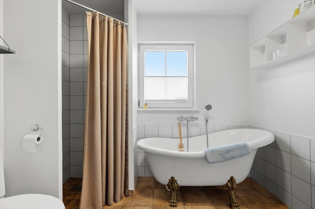 Det lyse køkken/alrum fungerer som husets naturlige samlingspunkt, hvor store vinduer og udgang til terrassen trækker naturen helt ind i rummet. Her kan du nyde fælles måltider, spille kort ved spisebordet eller bare lade roen sænke sig med en kop kaffe i hånden. En hyggelig brændeovn sørger for varme og atmosfære på kølige aftener, og det åbne rum gør det nemt at være sammen – uanset om du laver mad, læser en bog eller leger med børnene. Sommerhuset råder over to badeværelser, hvoraf det ene er udstyret med et dejligt badekar – perfekt til et afslappende karbad efter en dag ved stranden. De tre soveværelser er enkelt indrettet og giver god plads og komfort til både børn og voksne, og planløsningen gør huset velegnet til både små familier og vennepar.