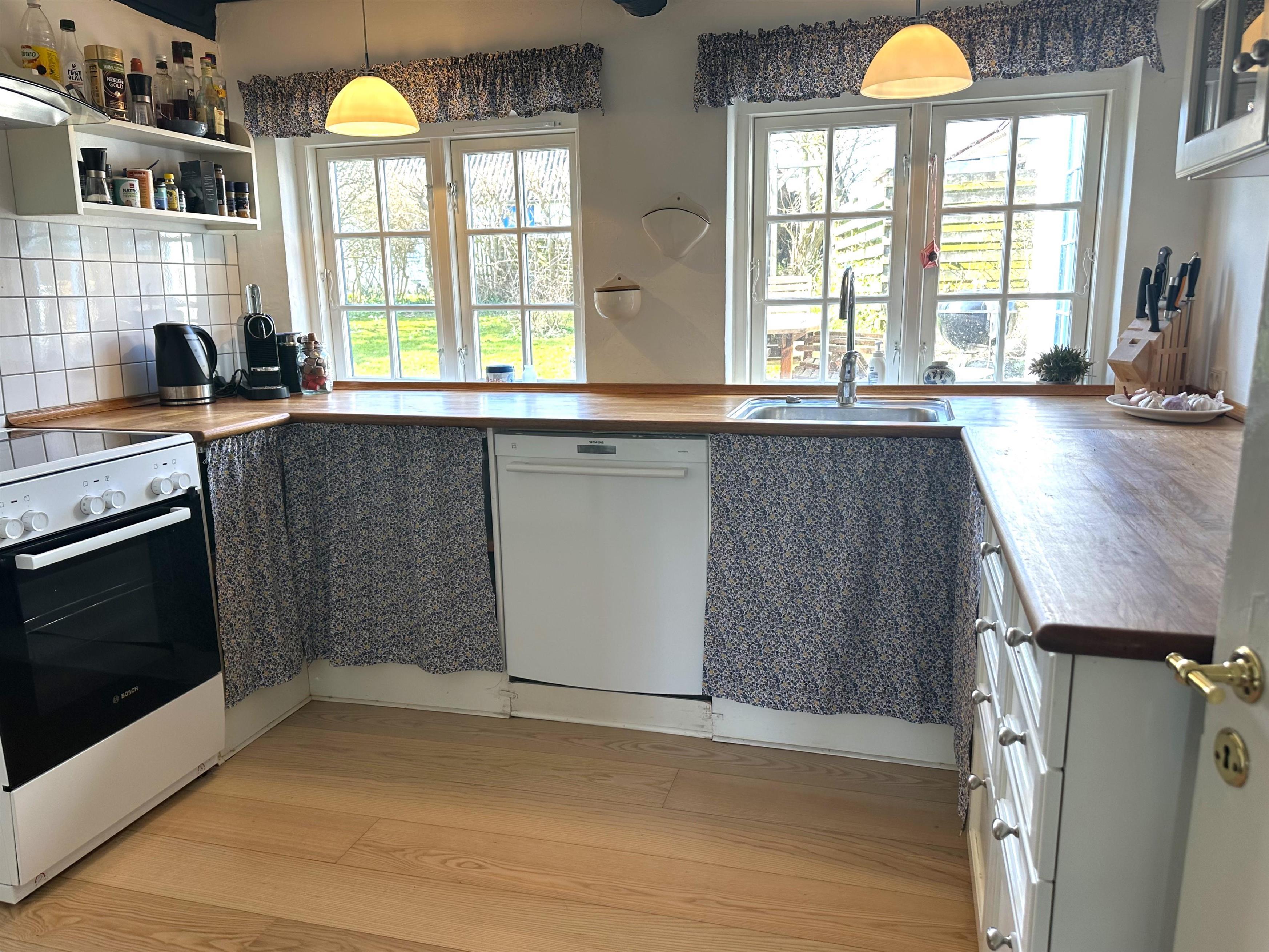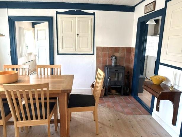 Huset er et klassisk bindingsværkshus med sjæl og charme, samtidig med at det tilbyder moderne komfort og plads til op til seks gæster. Indenfor mødes du af et skønt landkøkken, hvor du kan tilberede lækre måltider, en dejlig spisestue med brændeovn, der skaber en varm og hyggelig atmosfære, samt en rummelig og lys stue med store vinduer, der lukker dagslyset ind. I stueetagen findes også et soveværelse med dobbeltseng samt et badeværelse. På førstesalen er der yderligere to soveværelser, begge med dobbeltsenge, samt endnu et badeværelse, hvilket gør huset ideelt til både familier og vennepar, der ønsker at nyde ferien sammen.
