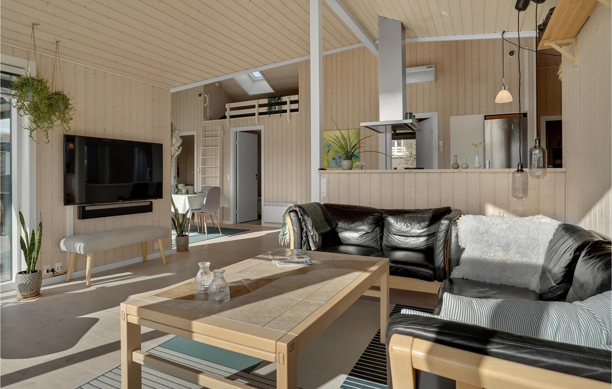 I de lyse lokaler til dette hus kan I hygge jer med hele familien på alle tider af året. Den hyggelige bolig med smukt lysindfald gennem de store glasfronter sørger for en behagelig atmosfære. Lav ferieretterne sammen, mens I nyder en vidunderlig udsigt til omgivelserne og dæk derefter op i stuen, hvor I også har en dejlig udsigt. Senere kan I finde jer godt til rette i sofaområdet og lade blikket vandre over de grønne omgivelser.