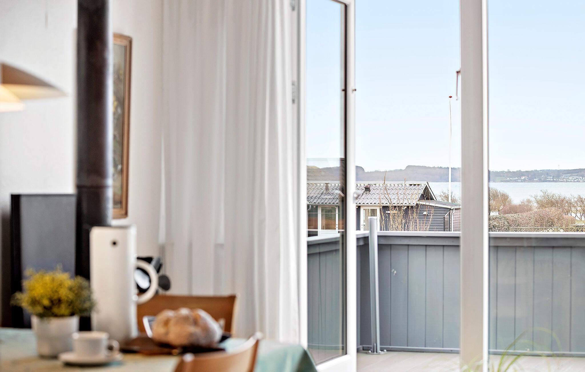 Hyggeligt feriehus ved Brunsnæs Strand med panoramaudsigt over Flensborg Fjord og tæt på sandstrand.