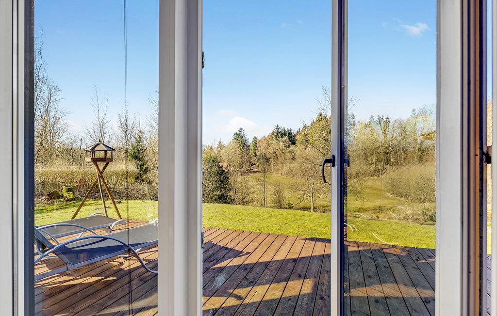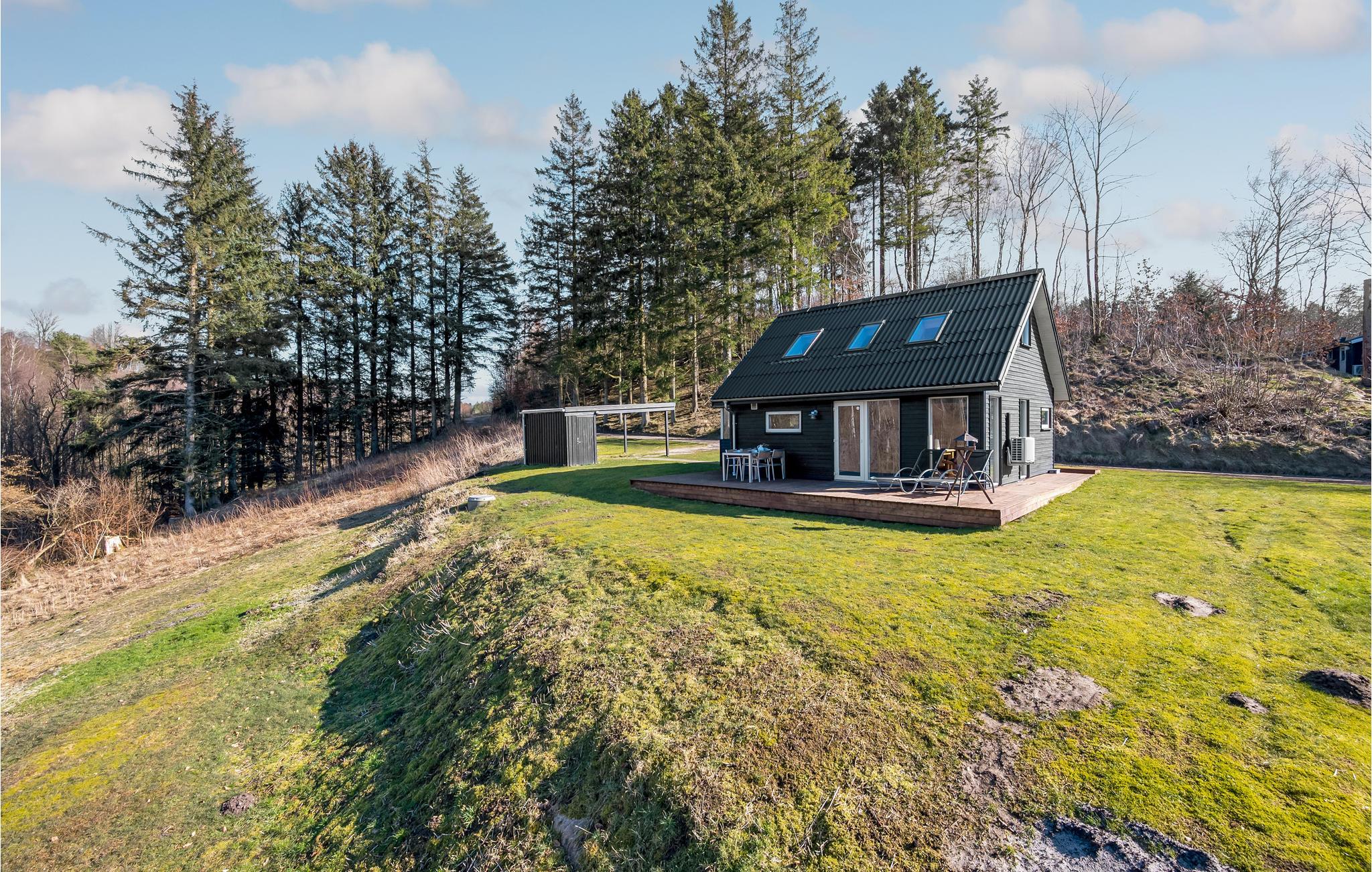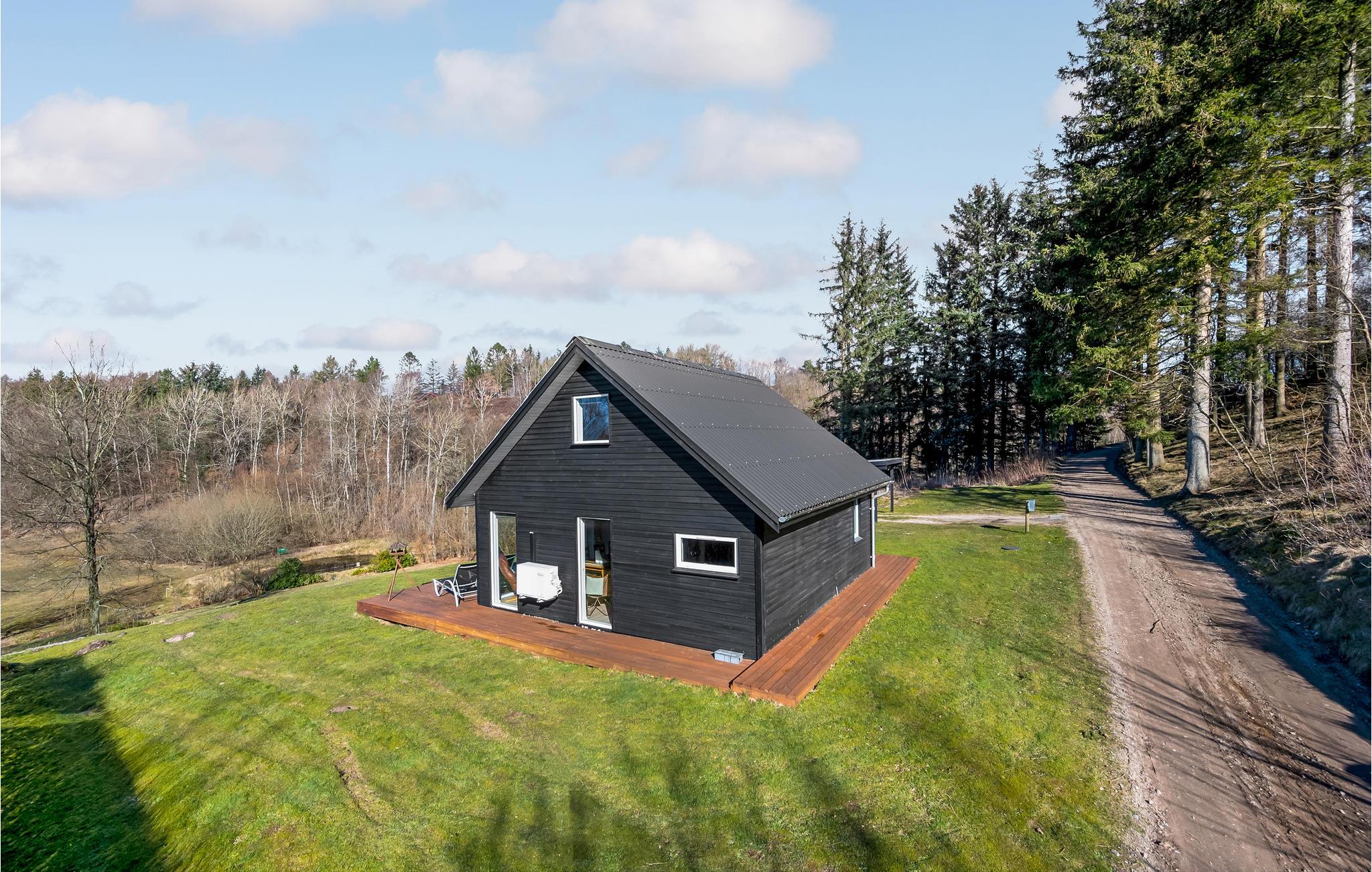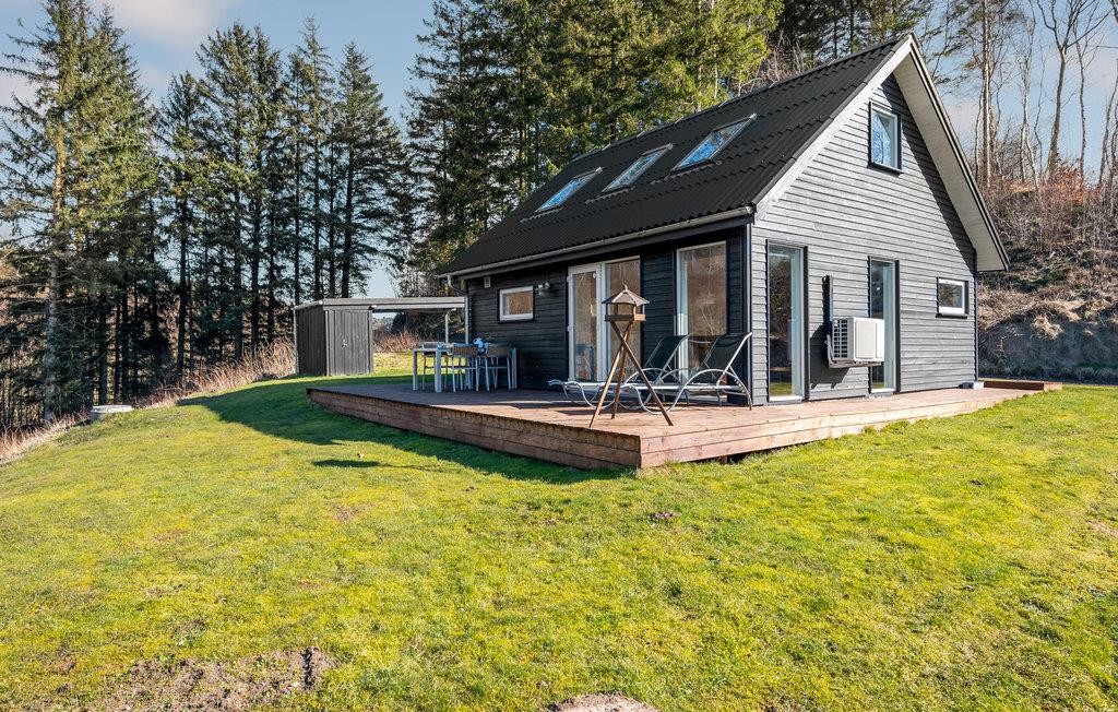Moderne feriehus i skov omgivelser nær Bryrup, med terrasse, køkken og plads til hund.