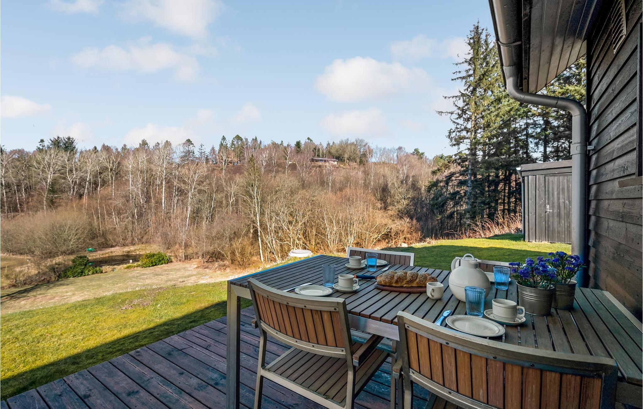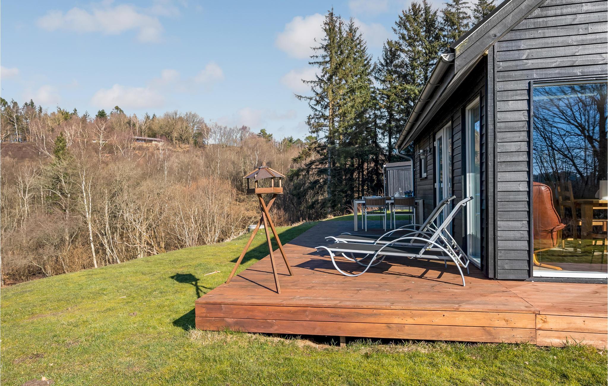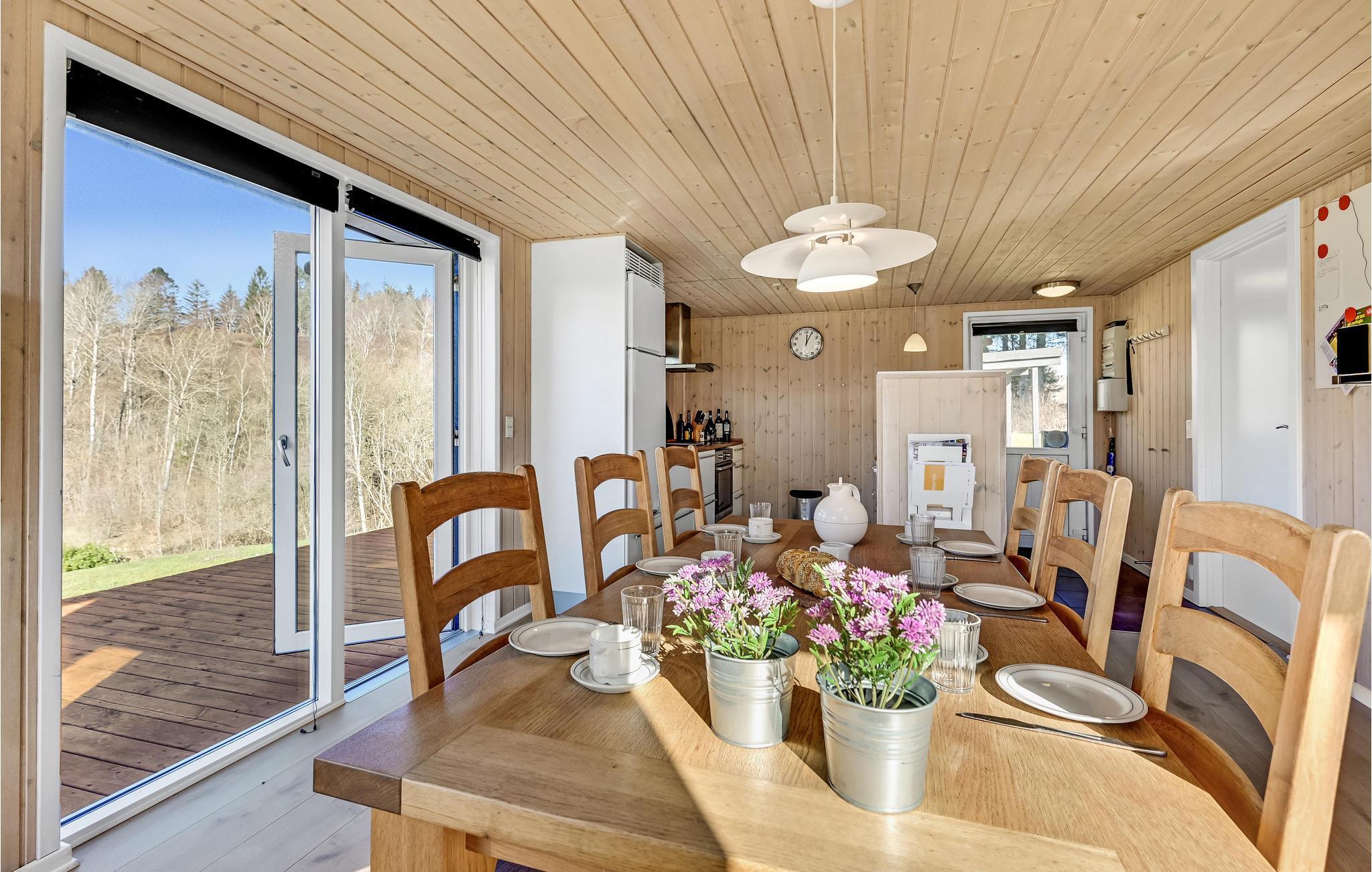 Velkommen til dette moderne, lyse og pænt indrettede feriehus, som ligger ugenert på en skråning med skov omkring. Glæd jer til at sidde på terrassen med en kop kaffe og nyde solen og udsigten til de fredelige, naturskønne omgivelser. Har I hund, er den også velkommen her og vil elske at boltre sig i dette naturparadis. Huset har et stort, veludstyret køkken, hvor I kan tilberede lækre feriemåltider, og en rummelig opholdsstue, hvor I kan tilbringe mange hyggelige stunder.