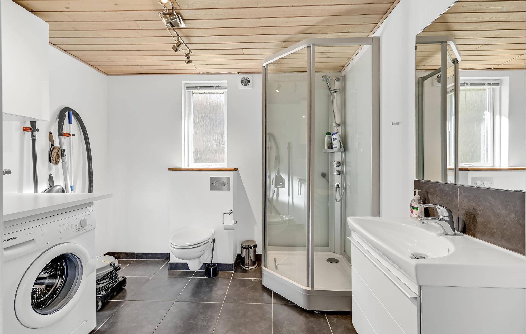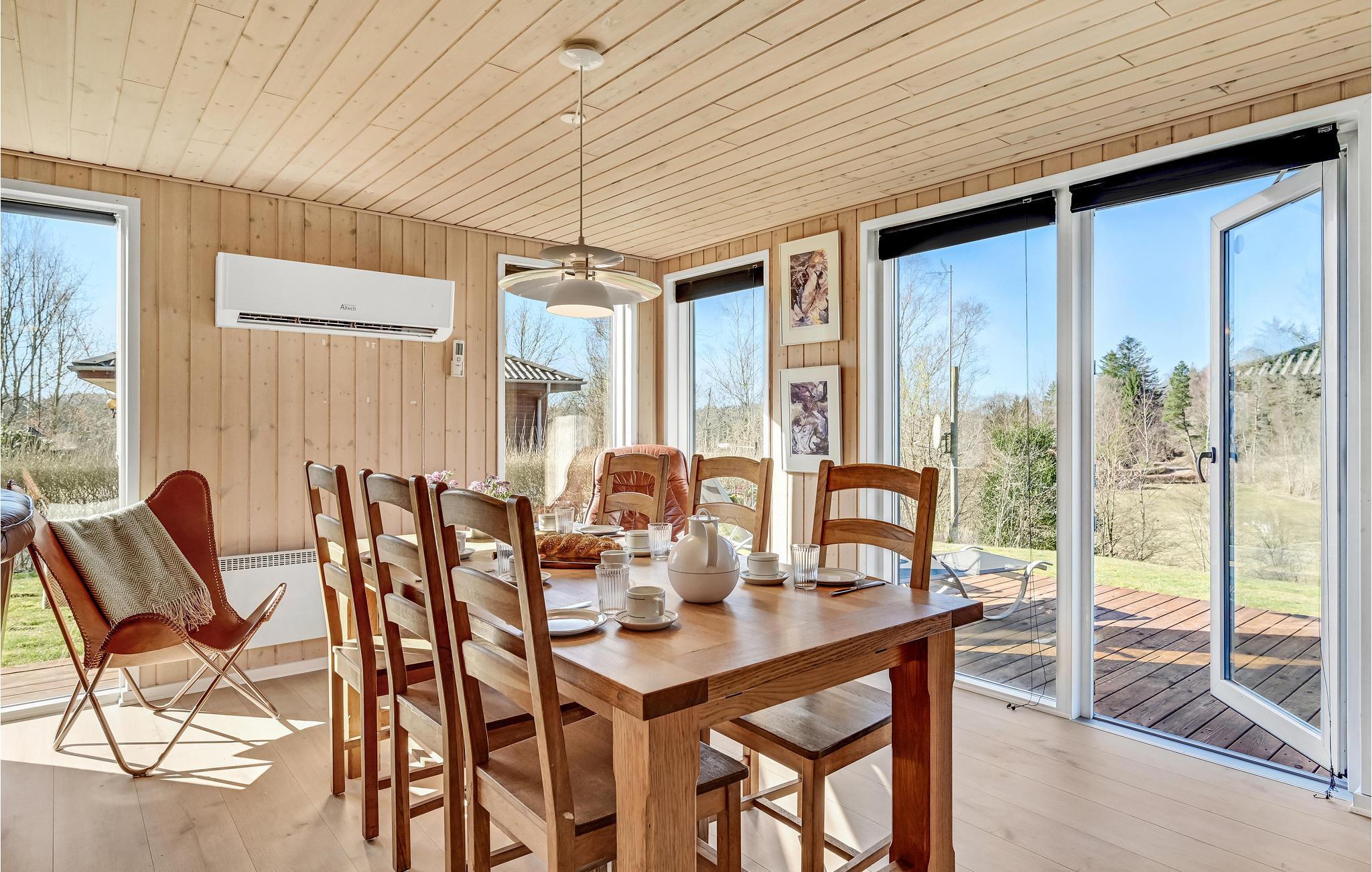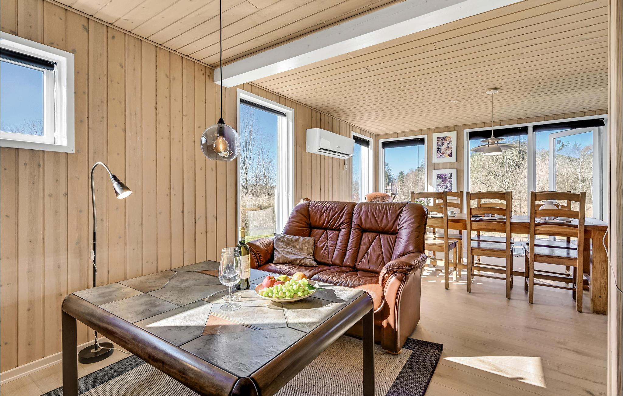 Velkommen til dette moderne, lyse og pænt indrettede feriehus, som ligger ugenert på en skråning med skov omkring. Glæd jer til at sidde på terrassen med en kop kaffe og nyde solen og udsigten til de fredelige, naturskønne omgivelser. Har I hund, er den også velkommen her og vil elske at boltre sig i dette naturparadis. Huset har et stort, veludstyret køkken, hvor I kan tilberede lækre feriemåltider, og en rummelig opholdsstue, hvor I kan tilbringe mange hyggelige stunder.