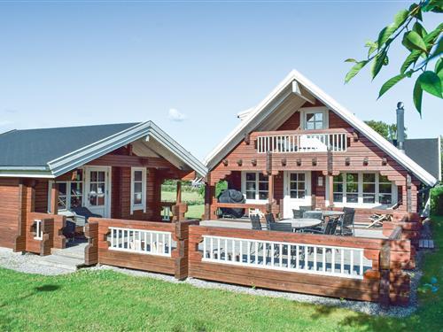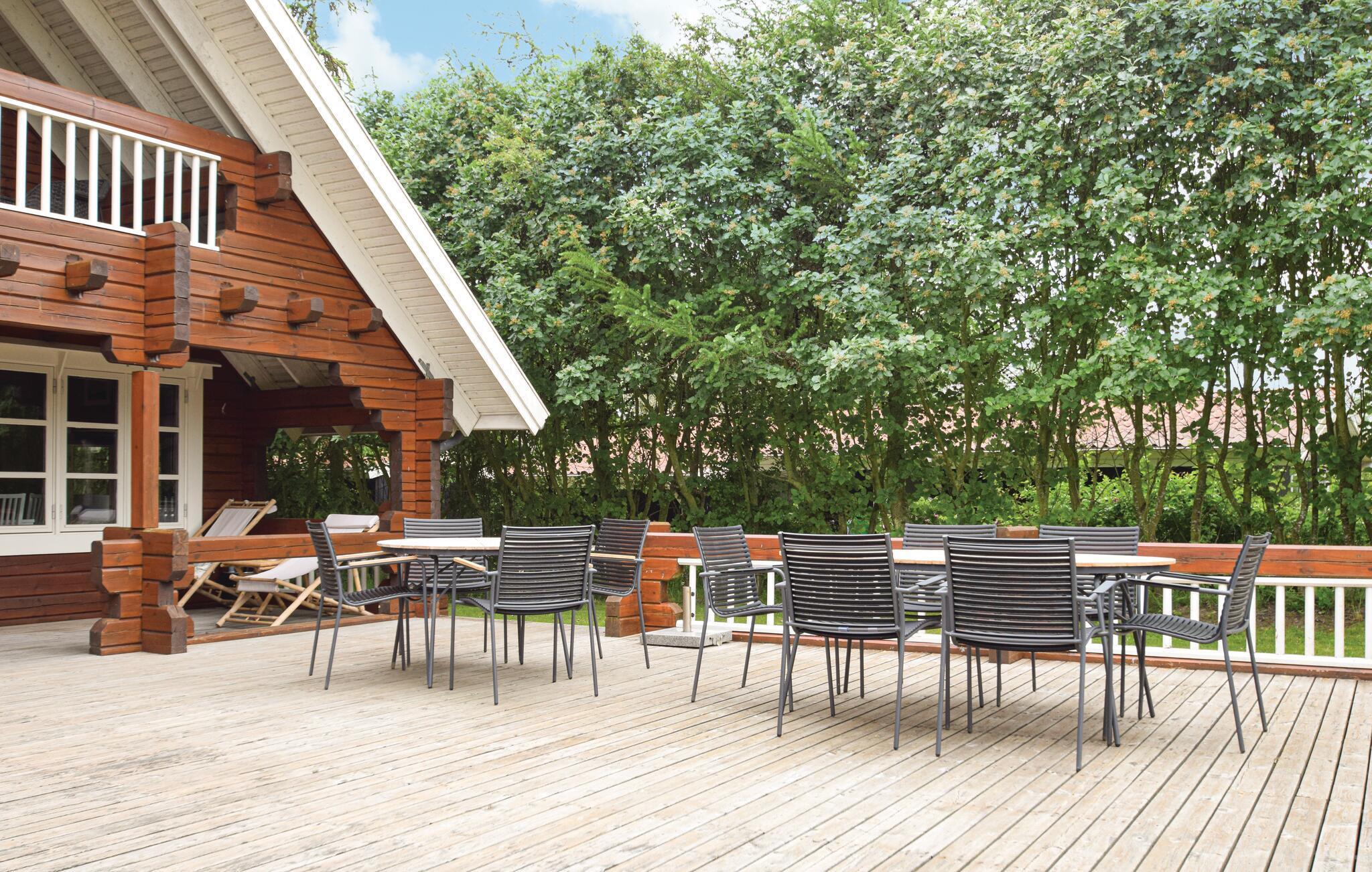 Eksklusiv bjælkehytte i Bukkemose med sauna, åbne terrasser og nærhed til vandet og golf.