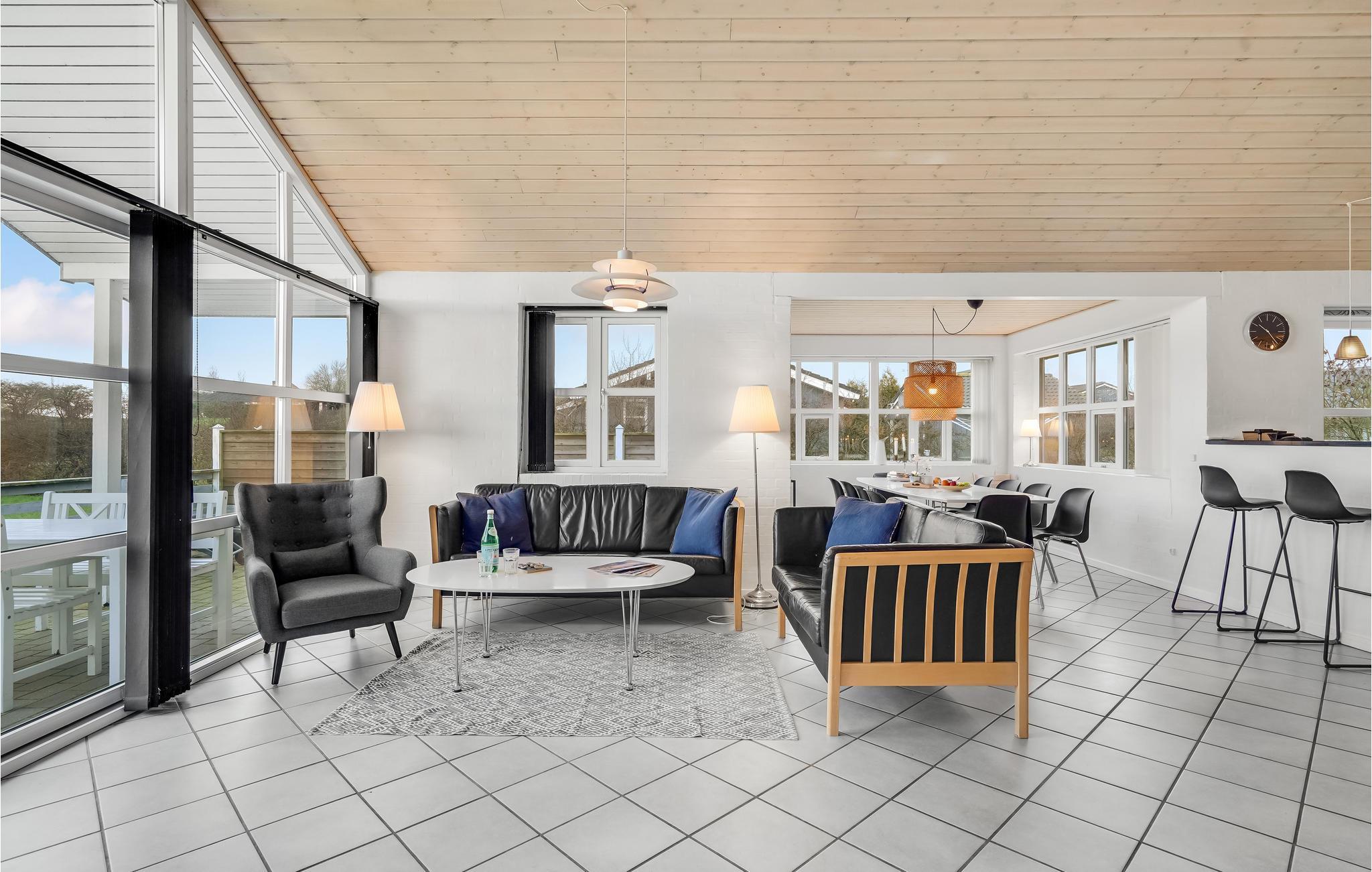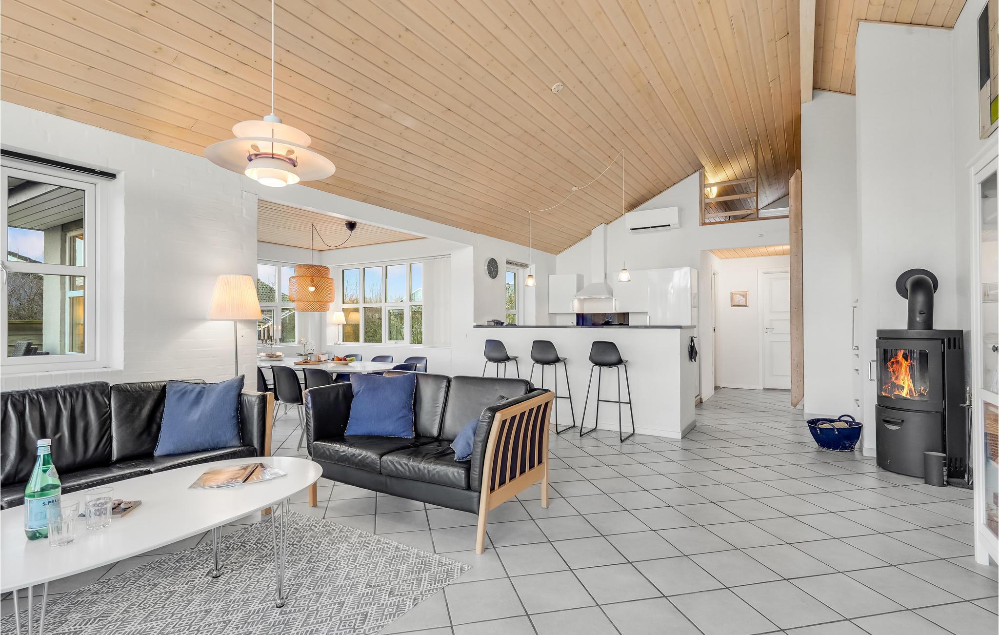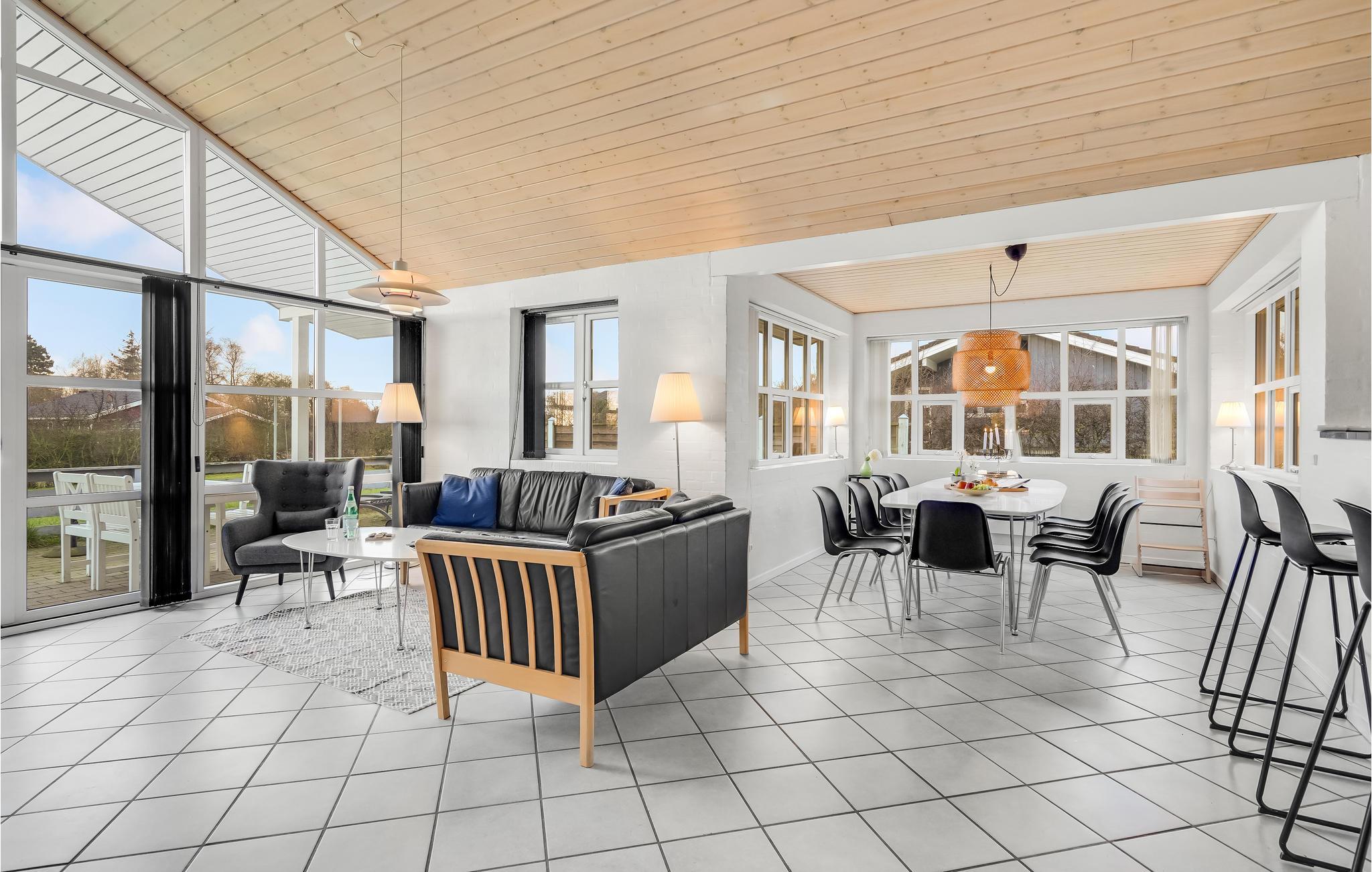 Hold en afslappende ferie i dette skønne feriehus, som byder på plads til jeres store familie eller to familier, der holder ferie sammen. Huset fremstår smukt, lyst og indbydende, så I vil hurtigt føle jer godt tilpas. Udnyt den store mængde plads i stuen og vær sammen om madlavningen i det åbne køkken, slap af foran brændeovnen og læg fødderne op eller spil kort ved spisebordet. I kan slappe af på badeværelset med en tur i badekarret med spabad funktion og eller blive varmet godt igennem i saunaen. Så snart de første solstråler kommer frem, kan I nyde tiden på terrassen om morgenen, spise morgenmad og planlægge jeres dag. Se på jeres børn fra den delvist overdækkede terrasse, mens de spiller bold eller gynger og lidt senere kan I gå til en tur til stranden.