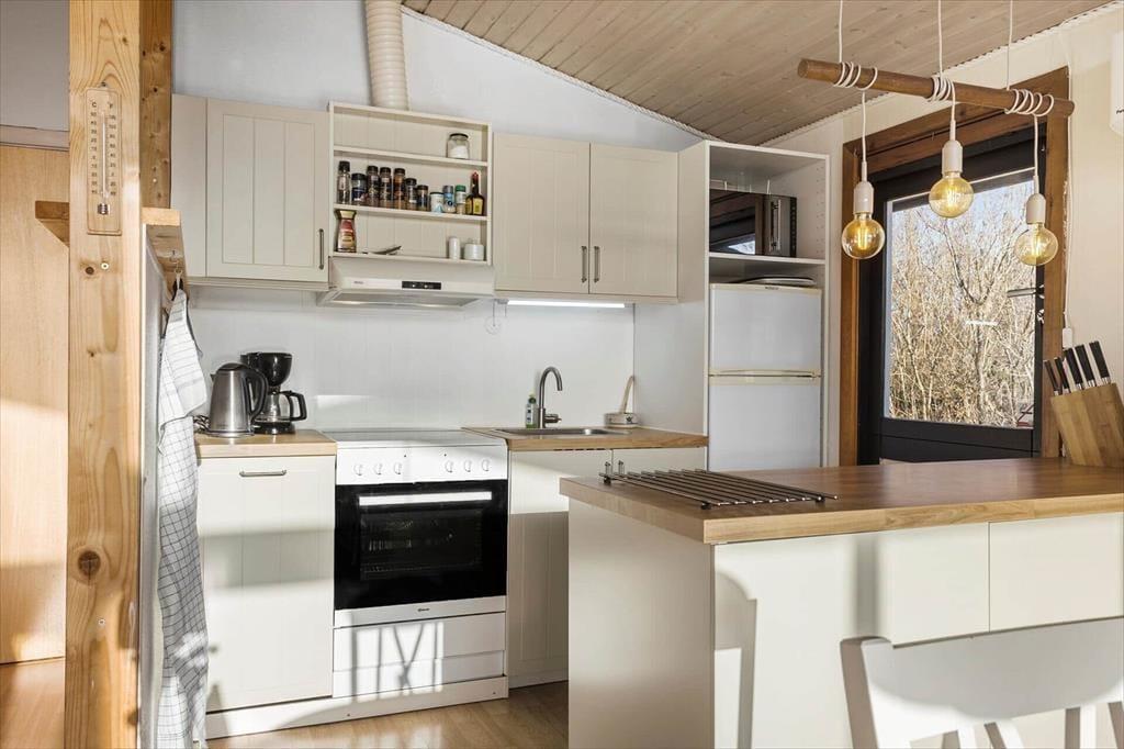 Når du træder ind i dette dejlige sommerhus på Slåvænget 21 i Bukkemose, mødes du af en autentisk sommerhusstemning, og med det skønne lysindfald gennem stuens store vinduer, bliver dit ophold her dejligt afslappende. Stuen er udstyret med en hyggelig biopejs, som indbyder til afslapning med en god bog eller en hyggelig filmaften, når dagen går på hæld. Det åbne køkken ligger i forlængelse af stuen, hvilket skaber en god sammenhæng mellem rummene og gør det let at være sammen, selv når der kokkereres. Med tre soveværelser er der god plads til både familie og venner.
