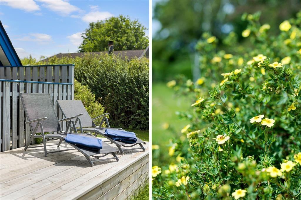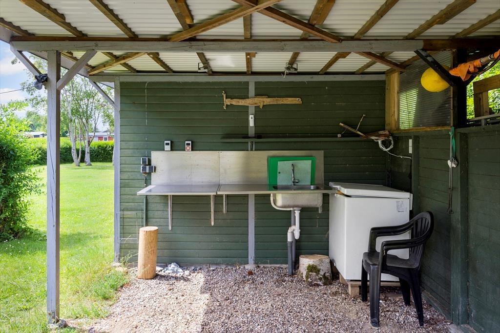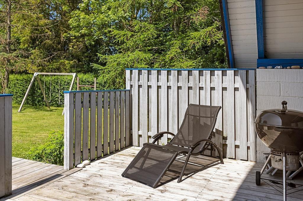 Udenfor venter en stor, grøn have, der er som skabt til både afslapning og leg. Børnene vil elske at udforske haven, hvor der både er en gynge og en sandkasse, der kan underholde dem i timevis. På den skønne terrasse kan du slappe af med en bog i hånden eller samle familien til en lækker grillmiddag i de lune sommeraftener. Hvis du er fiskeentusiast, vil du sætte pris på det overdækkede fiskerensebord, hvor du kan klargøre dagens fangst, inden den ryger på grillen eller i fryseren. Her er det let at mærke sommerhuslivet helt tæt på naturen, mens du lytter til fuglene synge, og havets bølger rulle ind mod stranden.