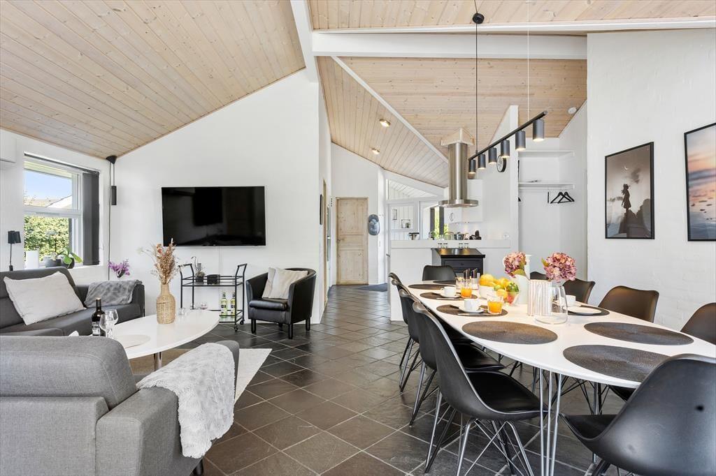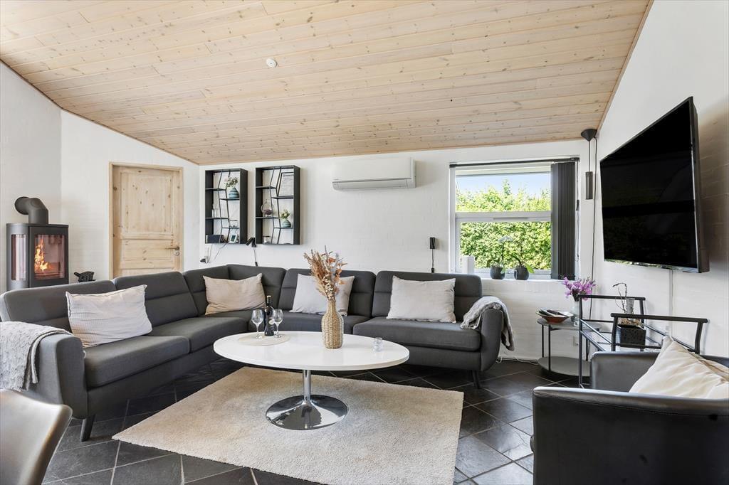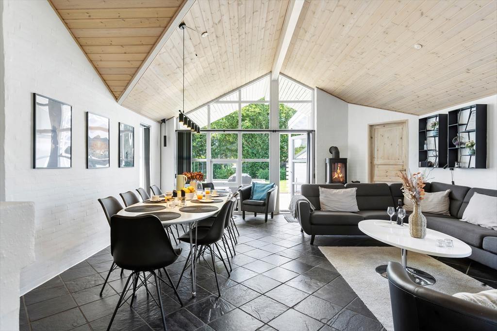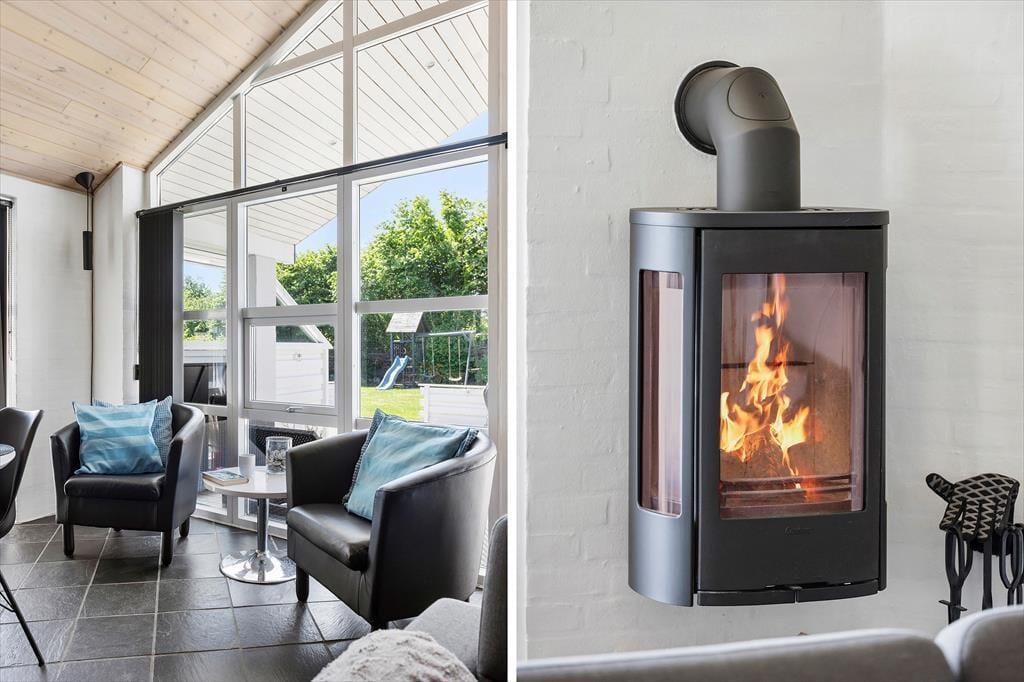 Sommerhuset byder på hele 118 m² veludnyttet bolig med god plads til op til 10 personer fordelt på fem soveværelser. Det centrale køkken/alrum er lyst og moderne indrettet og fungerer som husets naturlige samlingspunkt. Her er masser af bordplads og alle de nødvendige faciliteter til at lave mad sammen og nyde ferien i fællesskab. Brændeovnen skaber hygge på kølige aftener, og de store vinduespartier lukker lyset ind og forbinder inde- og udeliv på smukkeste vis. Huset har to badeværelser – det ene med bruser, det andet med både sauna og indendørs spabad, som er oplagt til wellness og afslapning efter en lang dag i naturen. Her er tænkt på både komfort og funktionalitet, og huset har selvfølgelig også TV og lynhurtig opladning til elbilen.