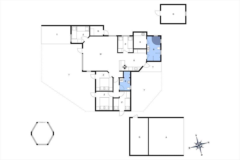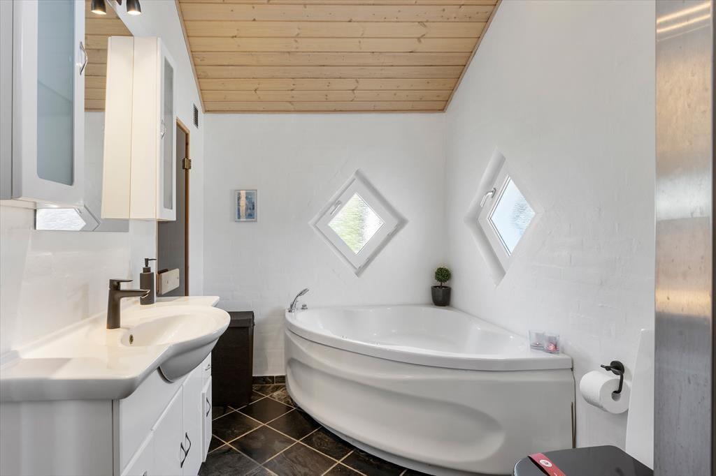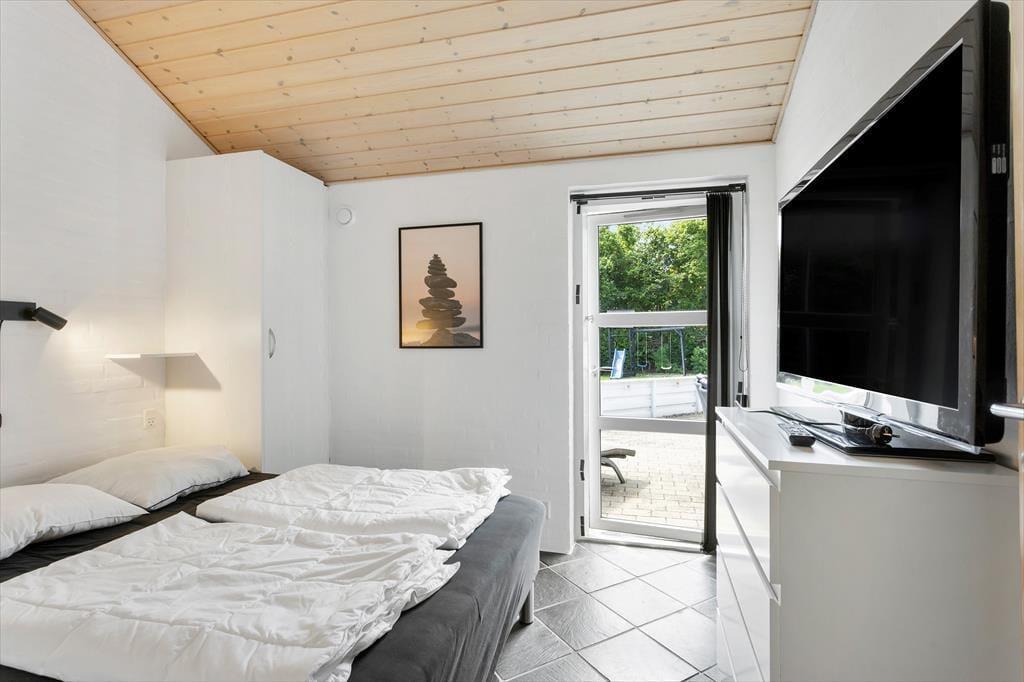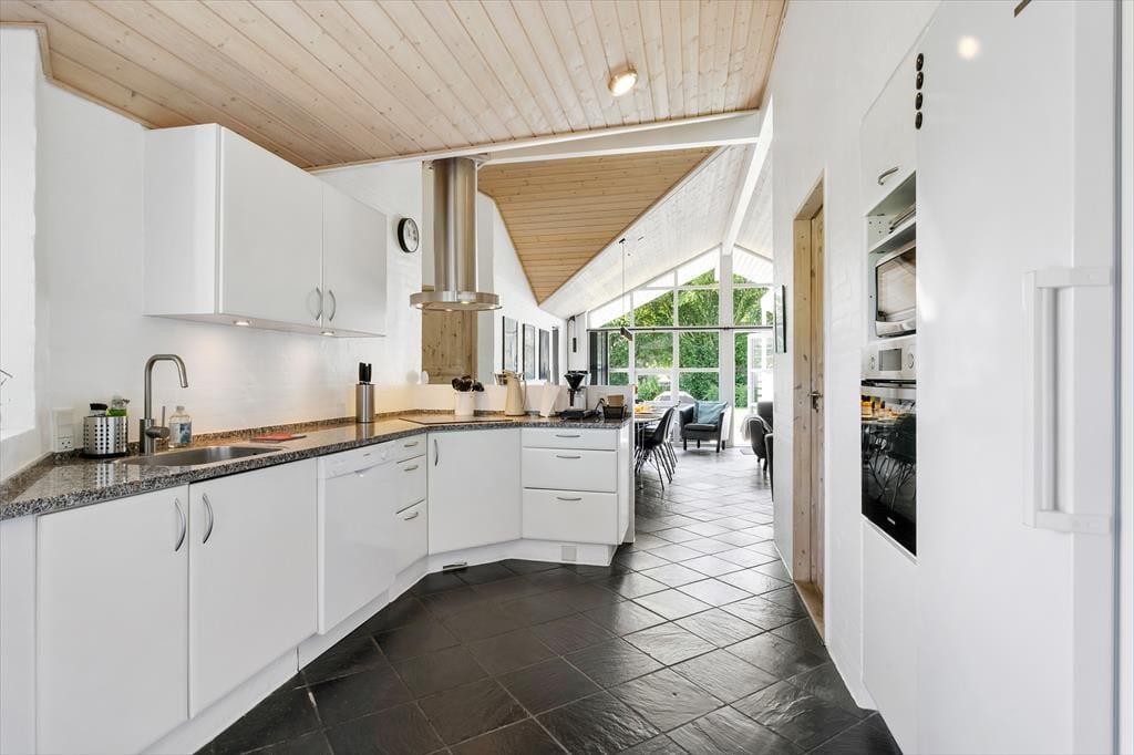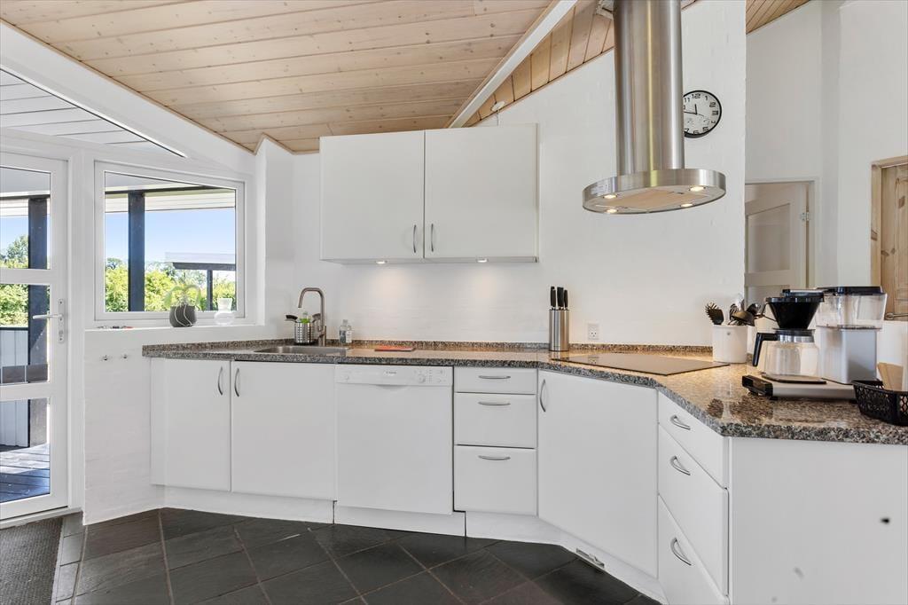 Sommerhuset byder på hele 118 m² veludnyttet bolig med god plads til op til 10 personer fordelt på fem soveværelser. Det centrale køkken/alrum er lyst og moderne indrettet og fungerer som husets naturlige samlingspunkt. Her er masser af bordplads og alle de nødvendige faciliteter til at lave mad sammen og nyde ferien i fællesskab. Brændeovnen skaber hygge på kølige aftener, og de store vinduespartier lukker lyset ind og forbinder inde- og udeliv på smukkeste vis. Huset har to badeværelser – det ene med bruser, det andet med både sauna og indendørs spabad, som er oplagt til wellness og afslapning efter en lang dag i naturen. Her er tænkt på både komfort og funktionalitet, og huset har selvfølgelig også TV og lynhurtig opladning til elbilen.