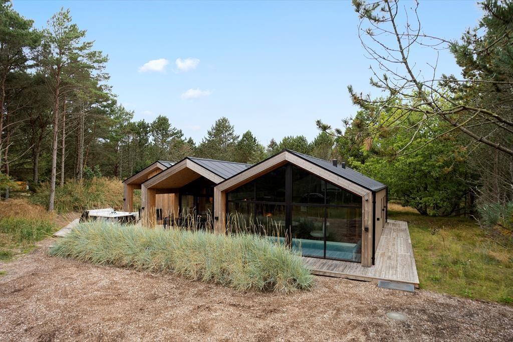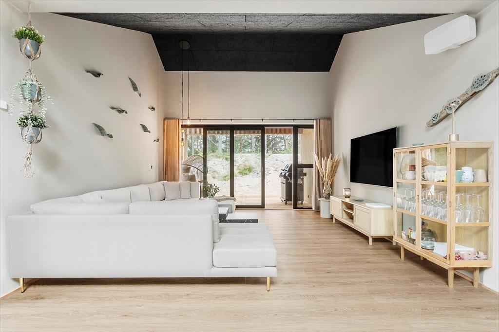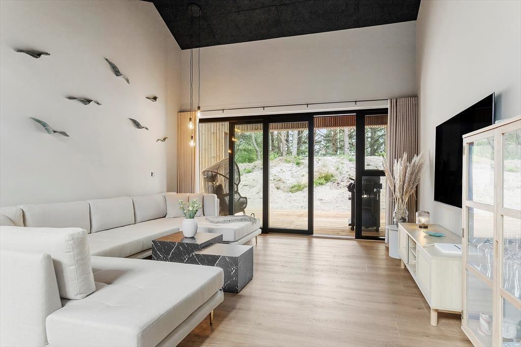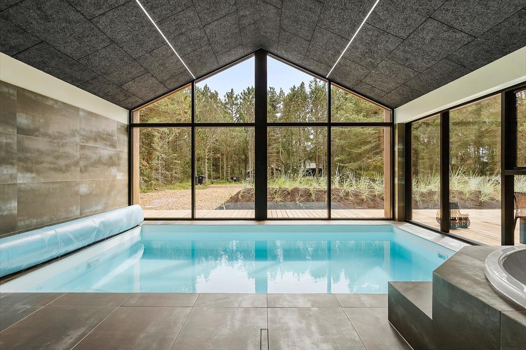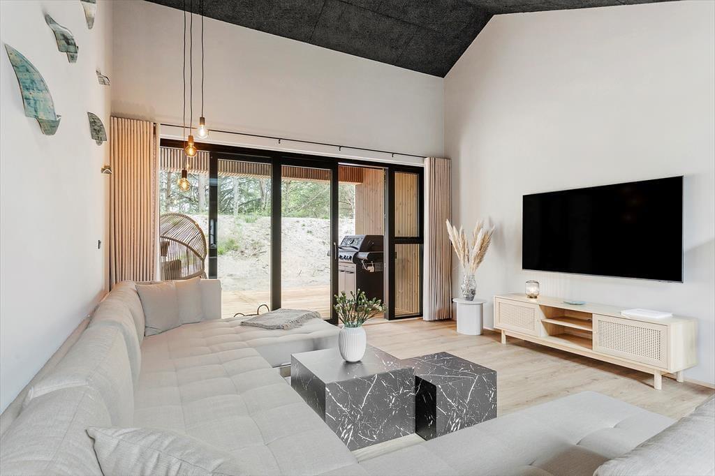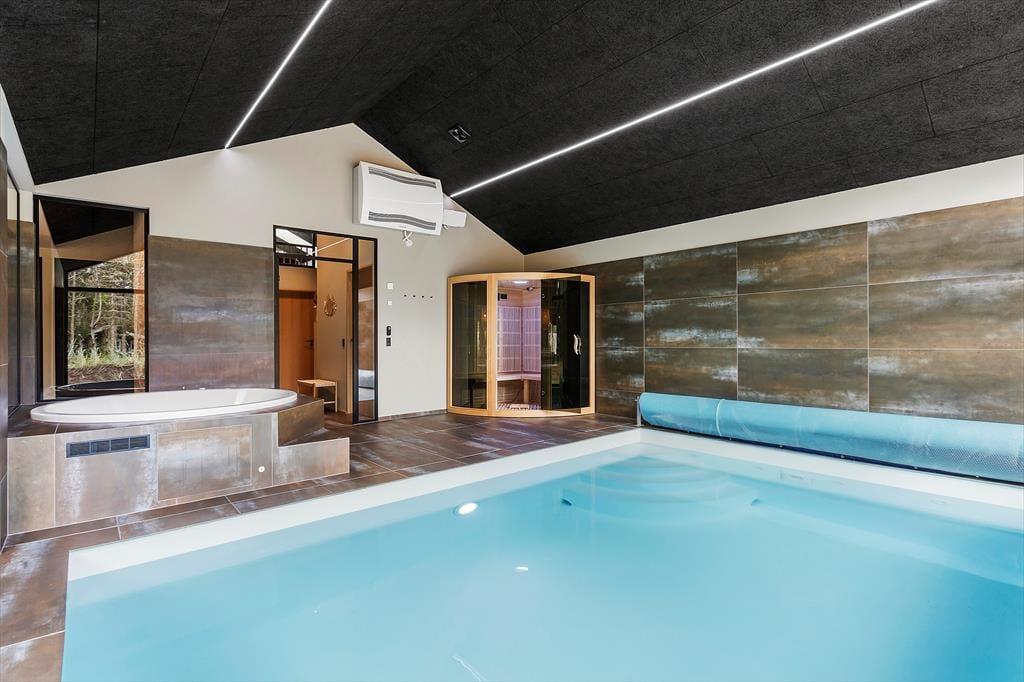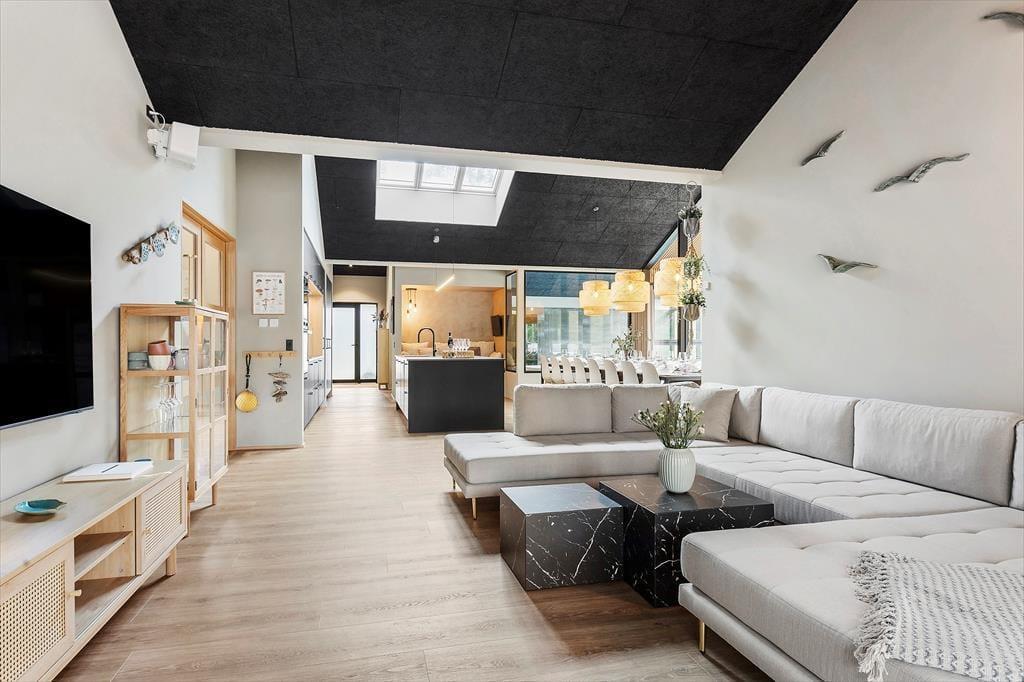 Sommerhuset ligger i bunden af en lukket vej på en stor naturgrund, der omkranses af store træer, så uanset hvad feriedagene byder på, kan du nyde livet i ro og mag. Gennem husets store vinduer bliver naturen inviteret helt indenfor, og rummene har loft til kip og en lys indretning i elegante farvetoner, der er med til at skabe en fornemmelse af hygge og velvære. De mange lækre detaljer og udsøgte faciliteter sørger for, at alle kan have det godt – uanset om I sover sødt på de fem værelser og to hemse, spiller pool og bordtennis i aktivitetsrummet eller hygger jer med en god middag og musik på SONOS-anlægget i det store opholdsrum. Selv i stuens alkove er der tv, hvis du vil slappe af med en spændende film, og når det er tid til at koble helt af, er det herligt at have fri råderet over en stor wellnessafdeling med både saltvandspool, sauna og spabad.