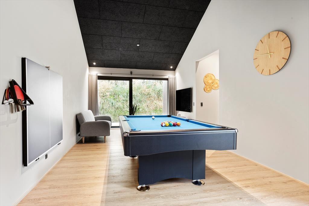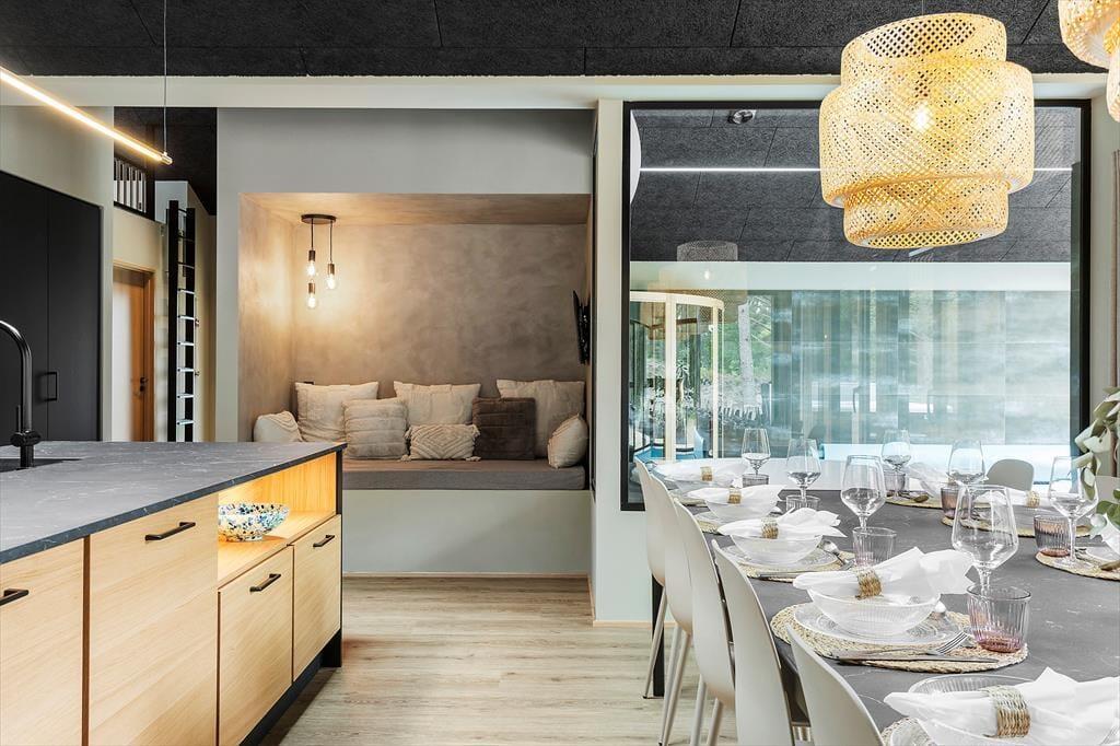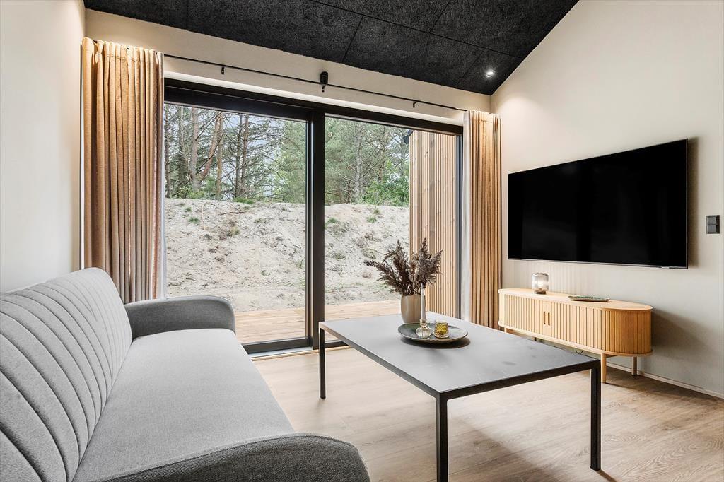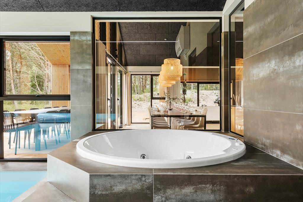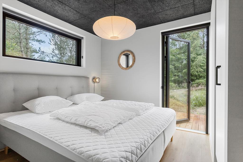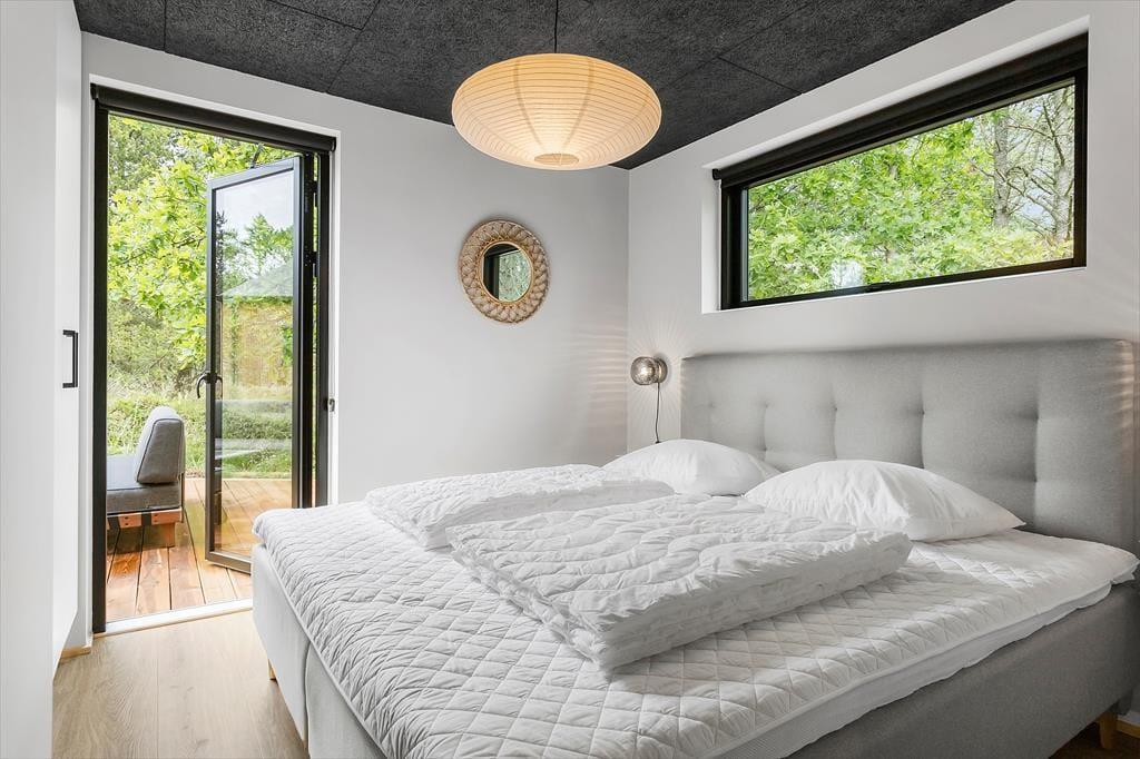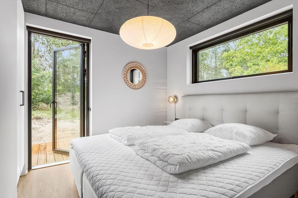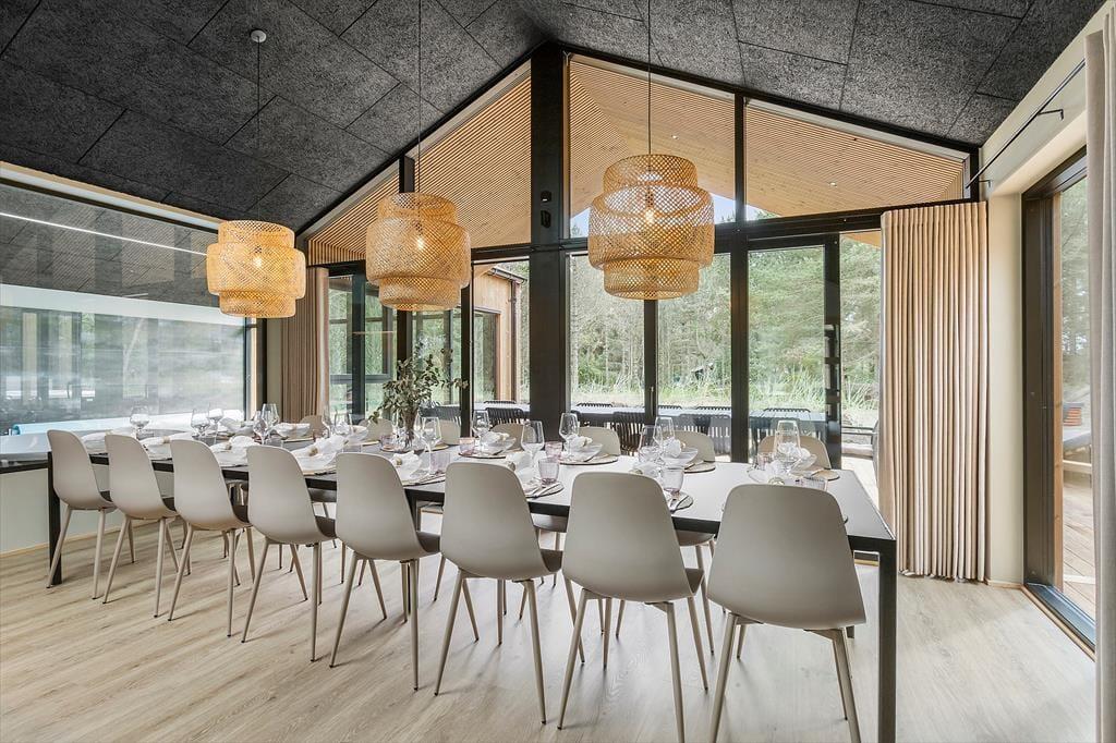 Sommerhuset ligger i bunden af en lukket vej på en stor naturgrund, der omkranses af store træer, så uanset hvad feriedagene byder på, kan du nyde livet i ro og mag. Gennem husets store vinduer bliver naturen inviteret helt indenfor, og rummene har loft til kip og en lys indretning i elegante farvetoner, der er med til at skabe en fornemmelse af hygge og velvære. De mange lækre detaljer og udsøgte faciliteter sørger for, at alle kan have det godt – uanset om I sover sødt på de fem værelser og to hemse, spiller pool og bordtennis i aktivitetsrummet eller hygger jer med en god middag og musik på SONOS-anlægget i det store opholdsrum. Selv i stuens alkove er der tv, hvis du vil slappe af med en spændende film, og når det er tid til at koble helt af, er det herligt at have fri råderet over en stor wellnessafdeling med både saltvandspool, sauna og spabad.