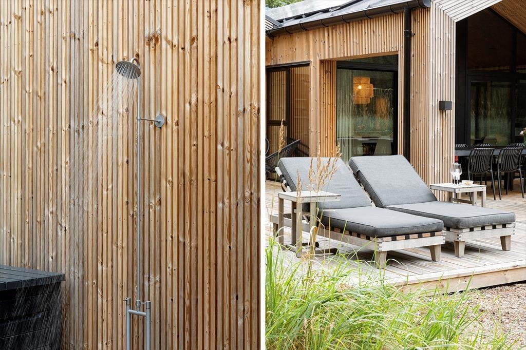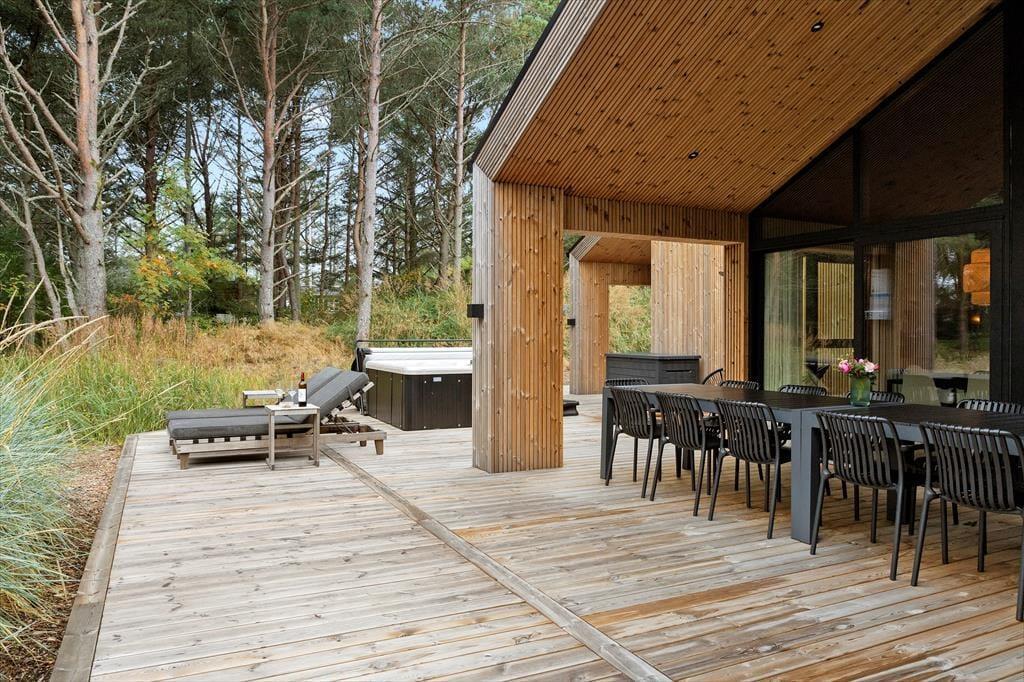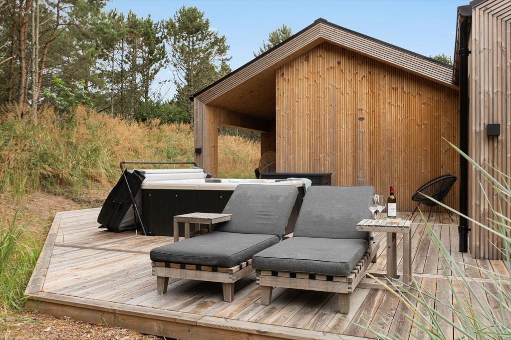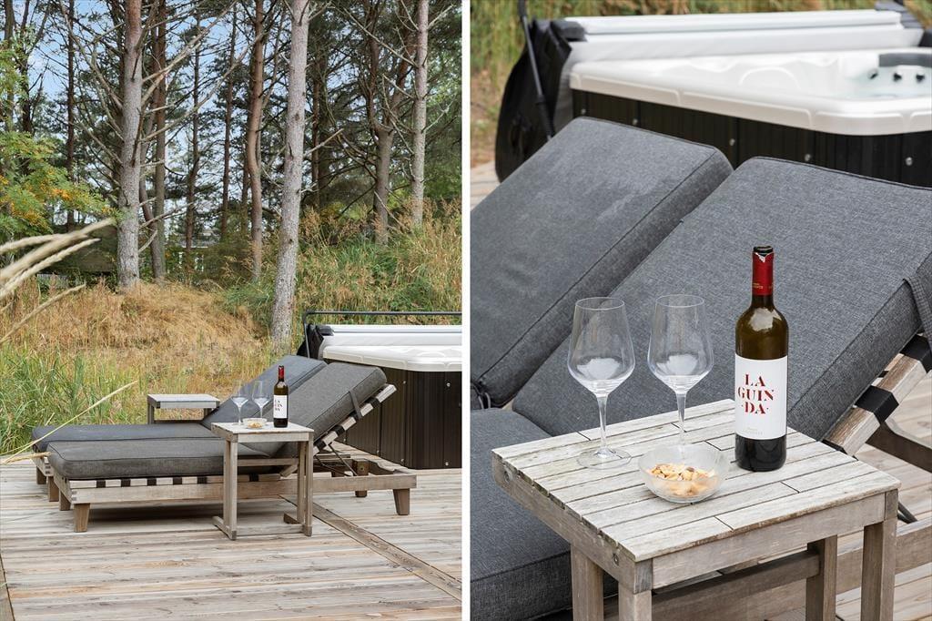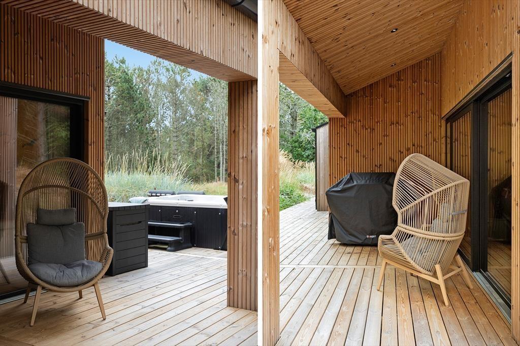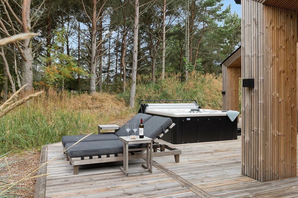 Også ude i det fri kan sommerhusets høje kvalitetsniveau tydeligt mærkes. Et lækkert terrassemiljø breder sig hele vejen rundt om bygningen, og der er både åbne og overdækkede arealer at vælge imellem, så du kan overveje, om du er i humør til sol eller skygge, før du slår dig ned i liggestolene eller loungemøblerne. Morgenbadet kan foregå under den udendørs bruser, mens sommerens frokoster og aftensmåltider let kan blive tilberedt på gasgrillen. Og hvis du vil slutte dagen af med at kigge på stjerner i de rolige omgivelser, kan du passende læne dig tilbage i det udendørs spabad.