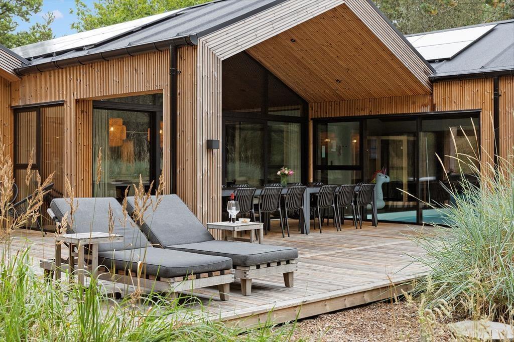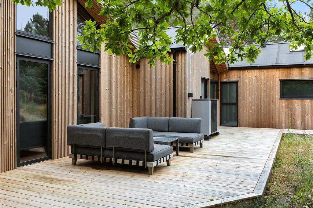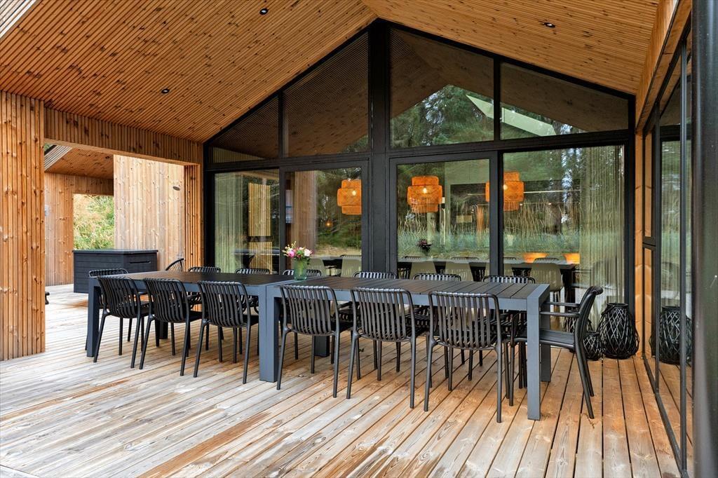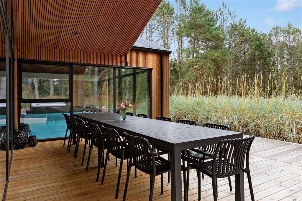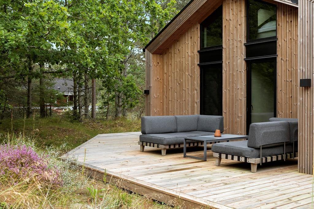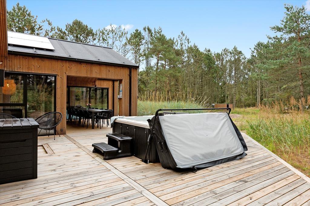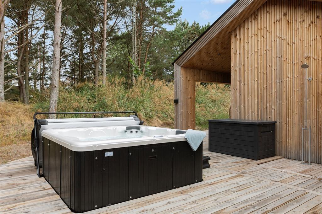Også ude i det fri kan sommerhusets høje kvalitetsniveau tydeligt mærkes. Et lækkert terrassemiljø breder sig hele vejen rundt om bygningen, og der er både åbne og overdækkede arealer at vælge imellem, så du kan overveje, om du er i humør til sol eller skygge, før du slår dig ned i liggestolene eller loungemøblerne. Morgenbadet kan foregå under den udendørs bruser, mens sommerens frokoster og aftensmåltider let kan blive tilberedt på gasgrillen. Og hvis du vil slutte dagen af med at kigge på stjerner i de rolige omgivelser, kan du passende læne dig tilbage i det udendørs spabad.