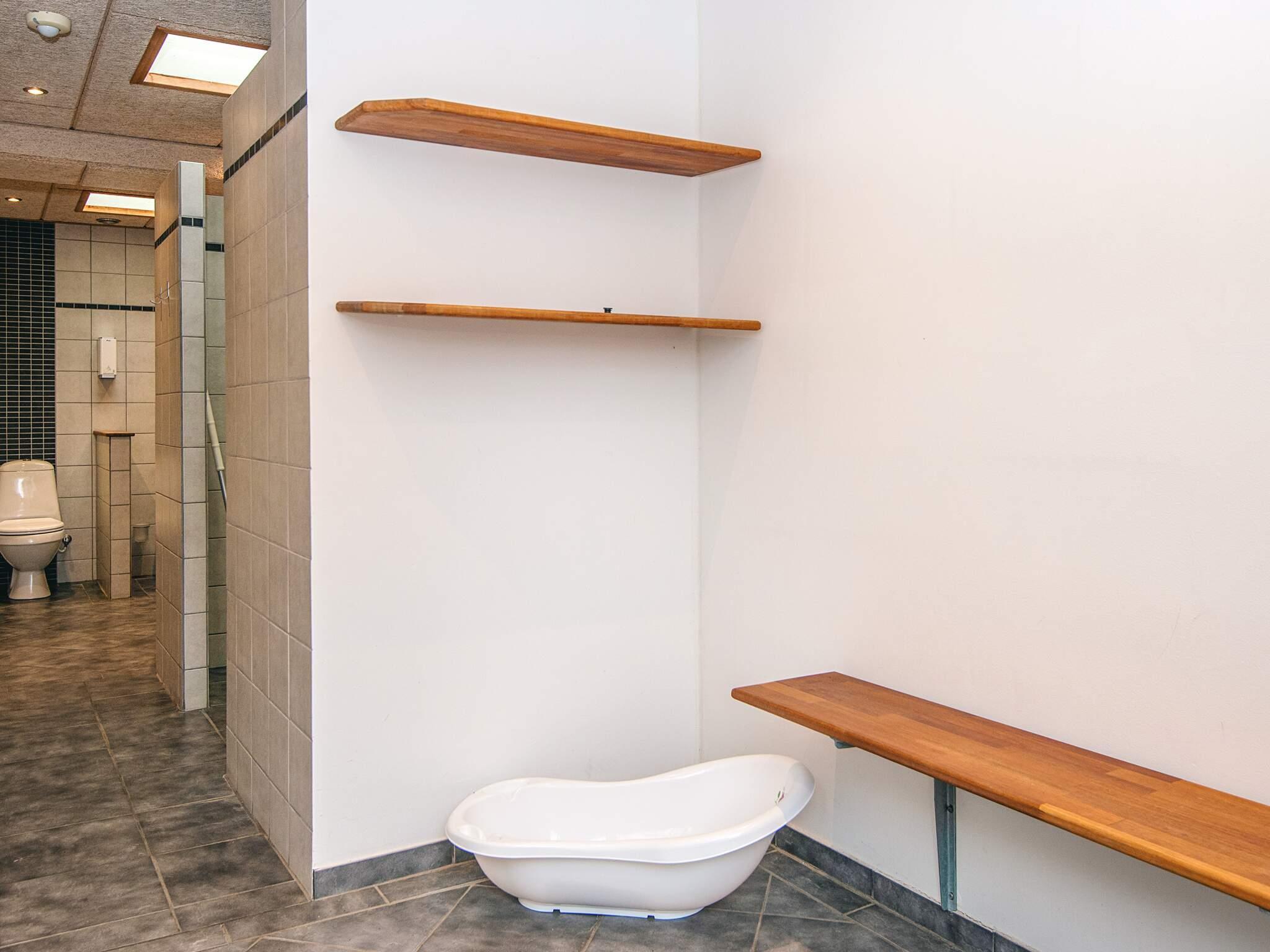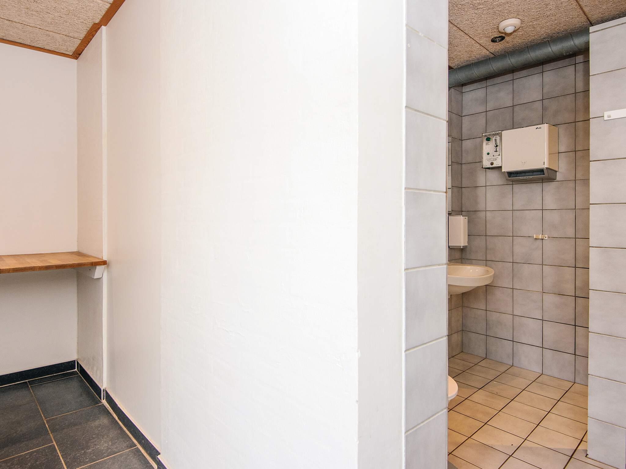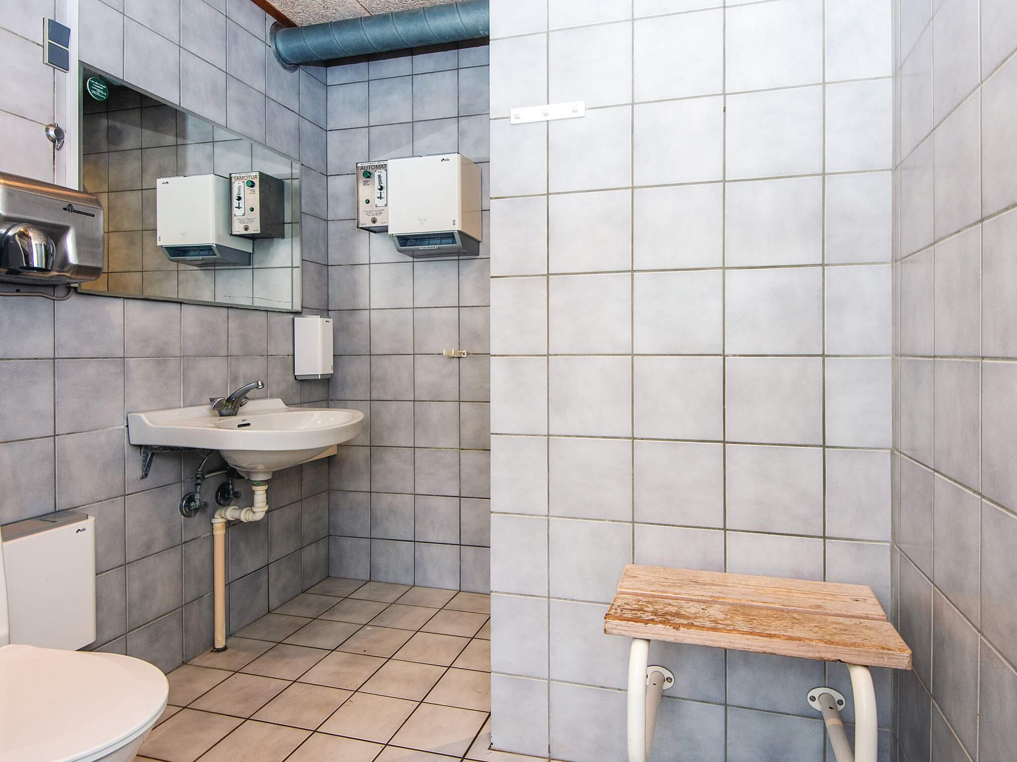 Der er ikke toilet og bad i hytten, men dette findes i den nærliggende servicebygning hvor der er et stort nyt fælleskøkken med overdækket terrasse, store familie baderum, gode toiletforhold med puslemuligheder samt vaskerum med vaskemaskine og tørretumbler. I servicebygningen er der også legerum med Lego, playstation og mange andre legeredskaber samt et rum til teenagerne, med tv og masse af hygge.