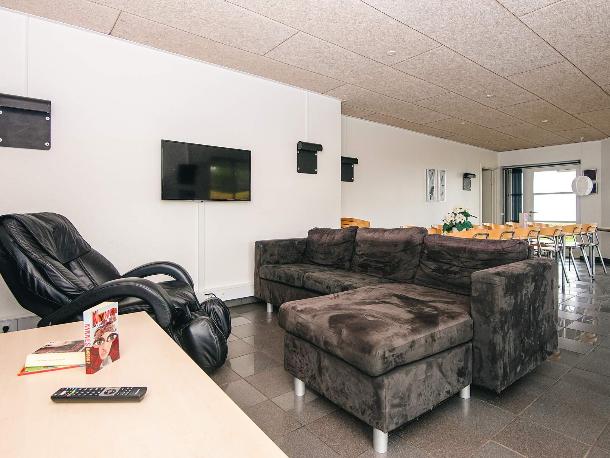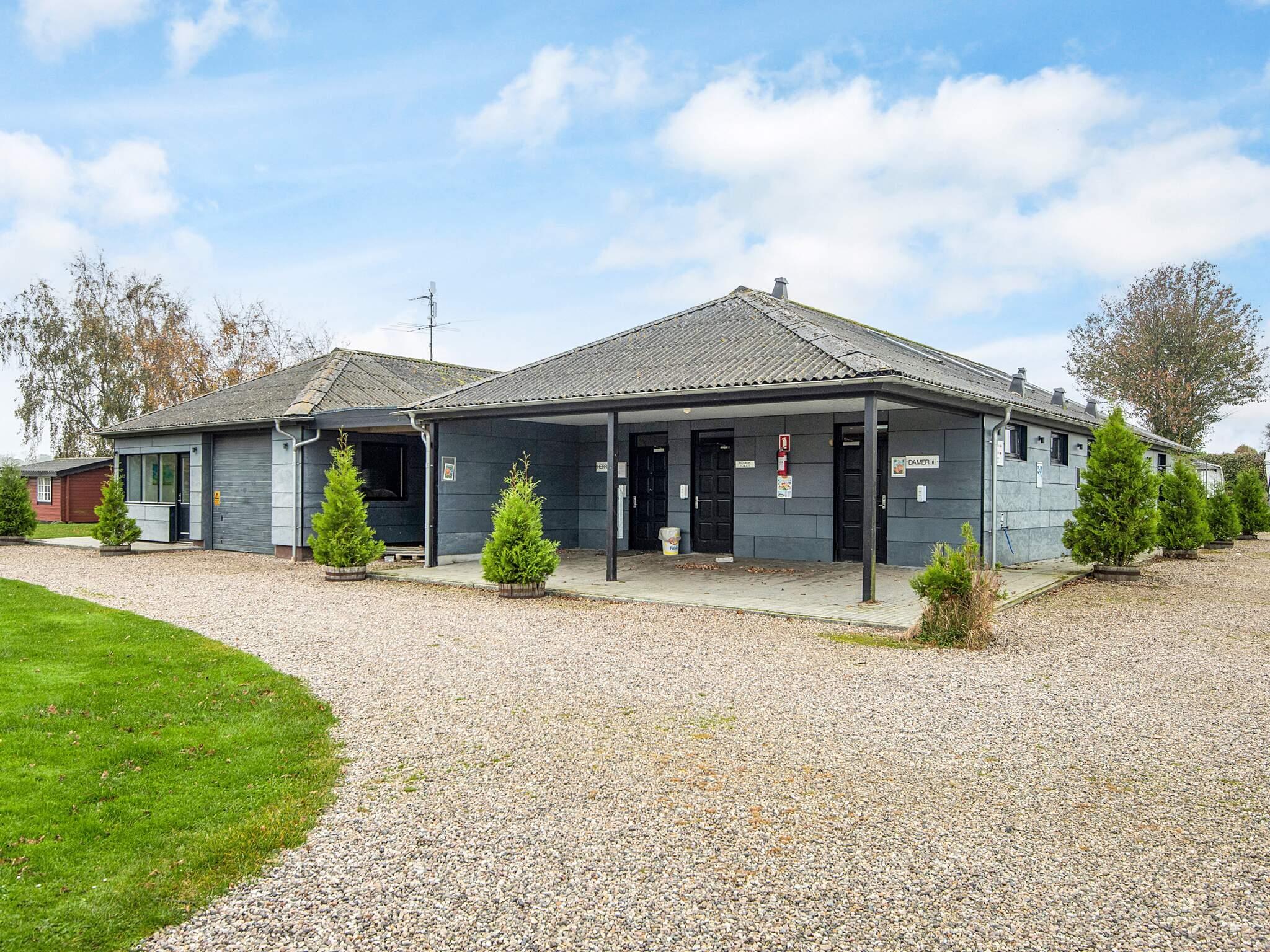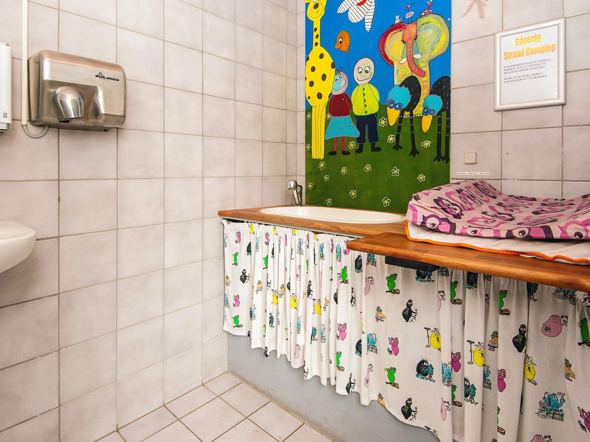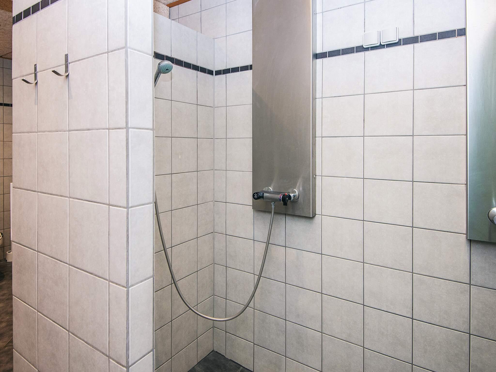 Der er ikke toilet og bad i hytten, men dette findes i den nærliggende servicebygning hvor der er et stort nyt fælleskøkken med overdækket terrasse, store familie baderum, gode toiletforhold med puslemuligheder samt vaskerum med vaskemaskine og tørretumbler. I servicebygningen er der også legerum med Lego, playstation og mange andre legeredskaber samt et rum til teenagerne, med tv og masse af hygge.