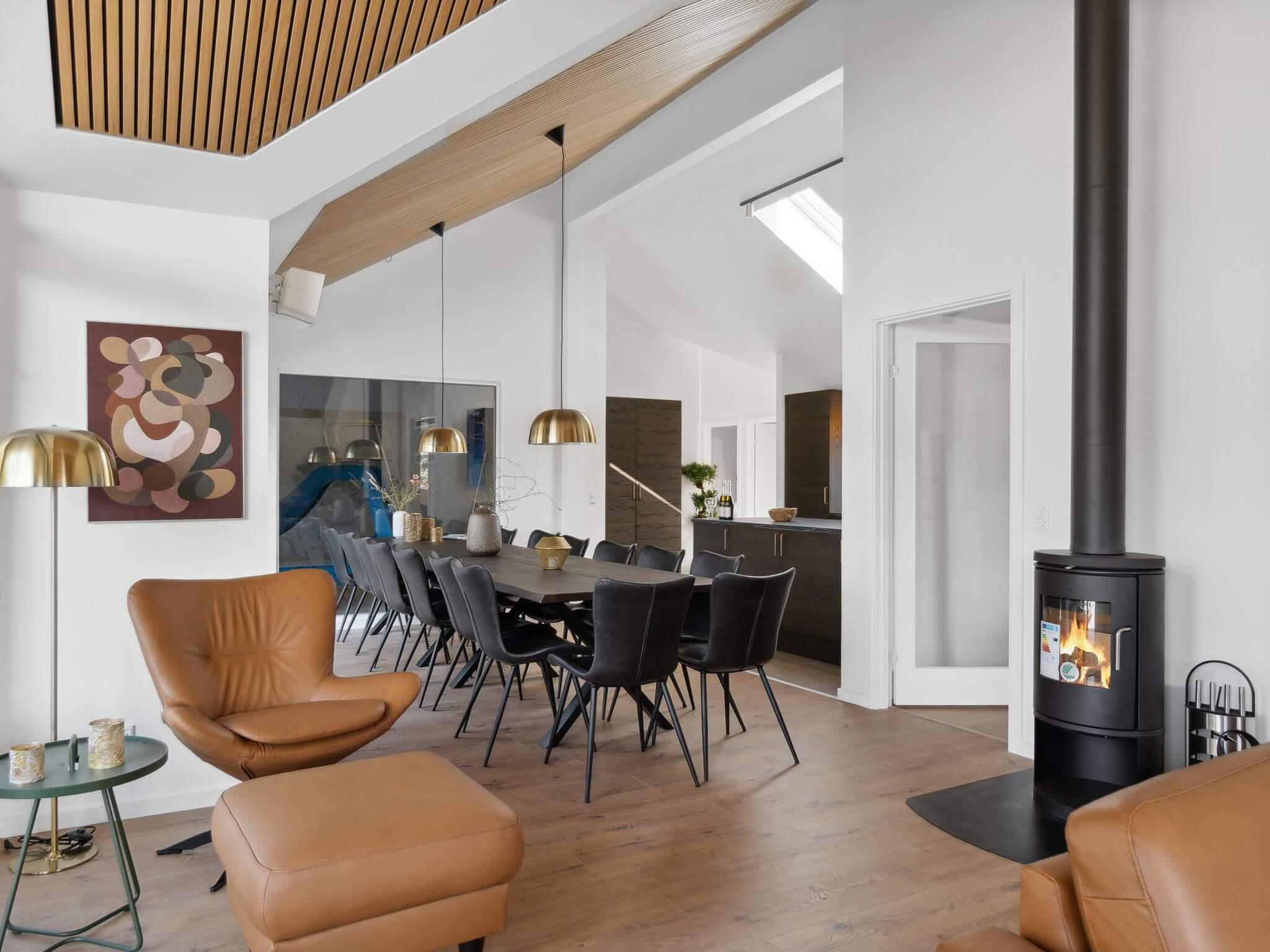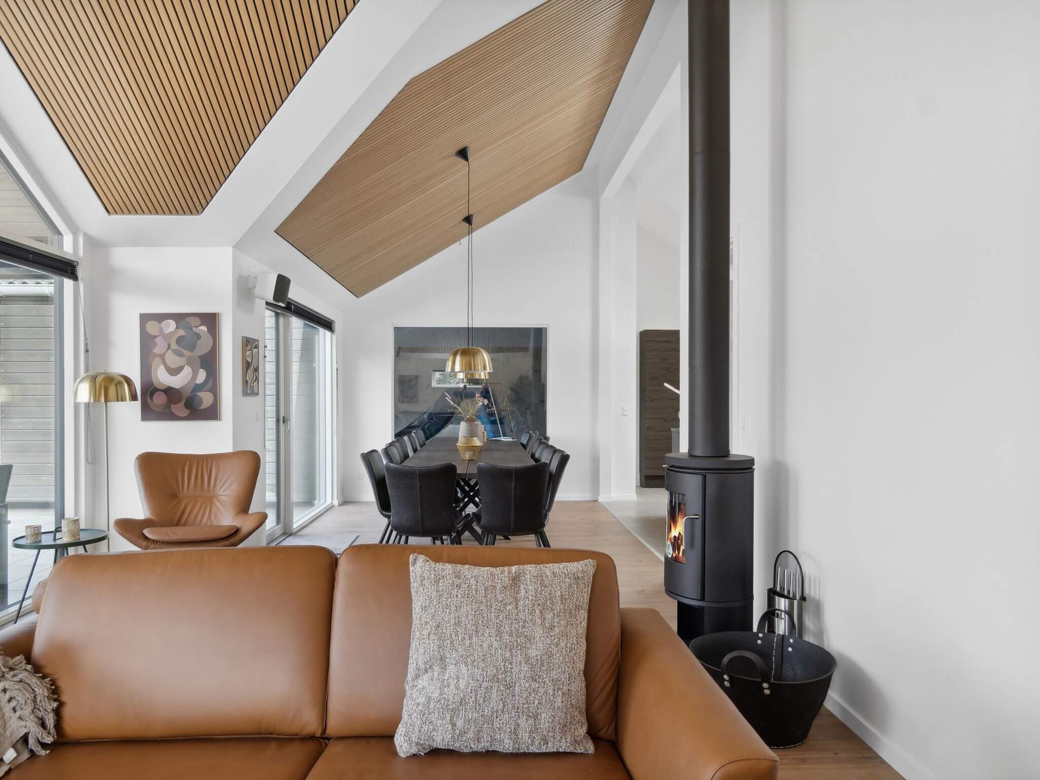 Brændeovnen giver varme og hygge til både spisepladsen og stuen. I stuen kan du slappe af foran tv'et og nyde udsigten til haven gennem de store vinduespartier, der giver lys i stuen.