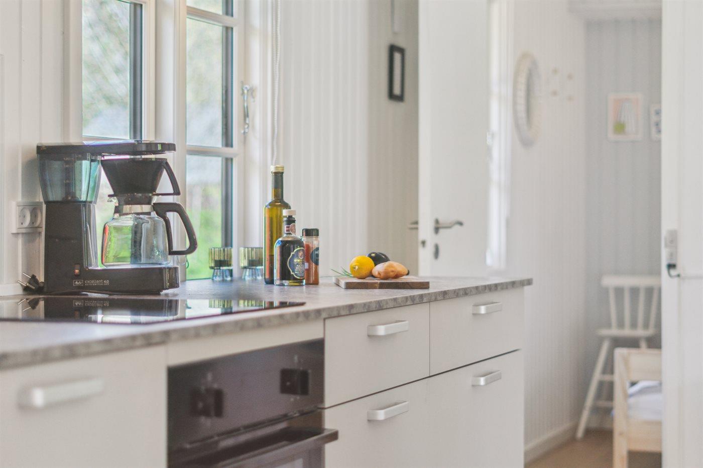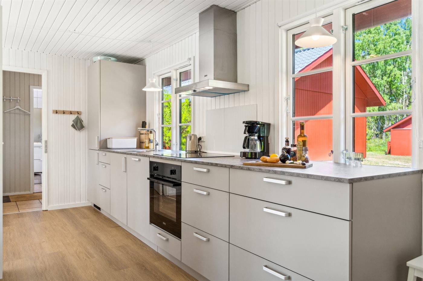 Køkkenet er udstyret med 1 køleskab. Der er 4 keramiske kogeplader, varmluftovn, mikrobølgeovn samt opvaskemaskine.