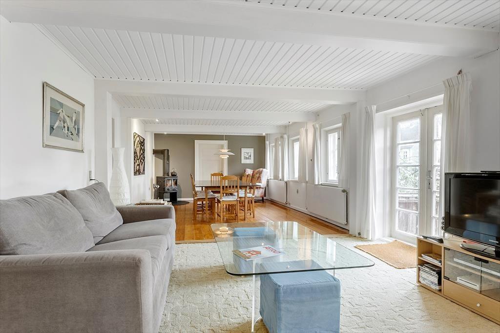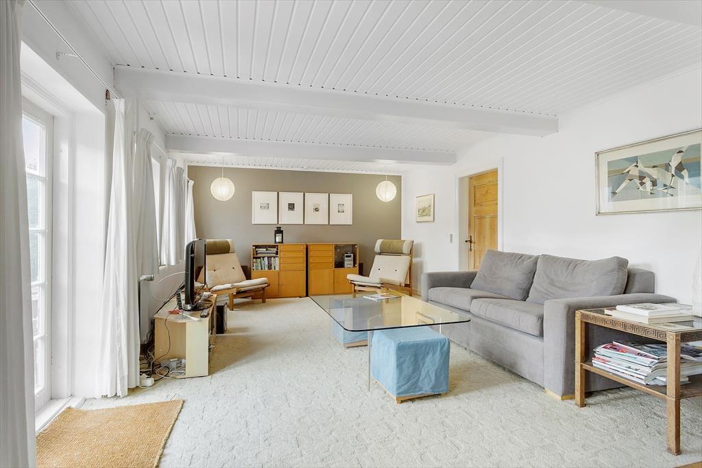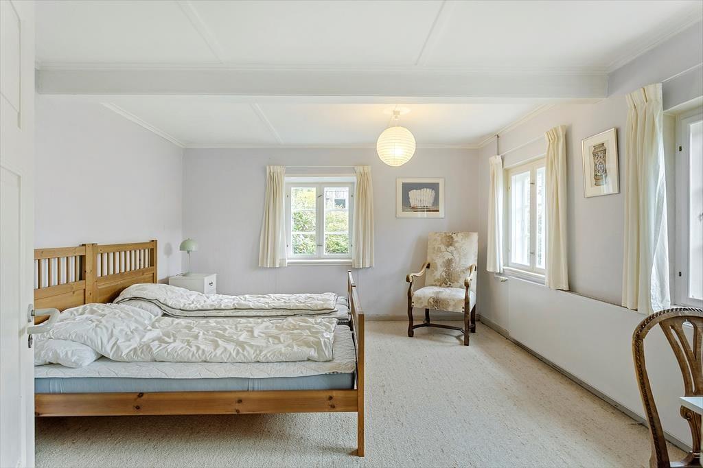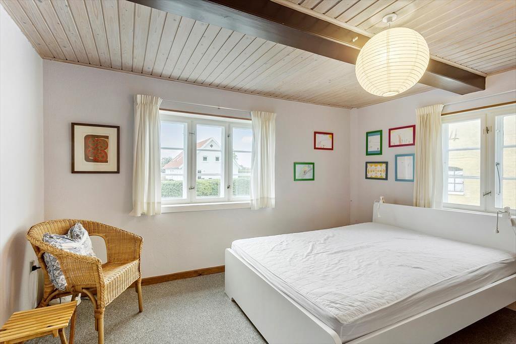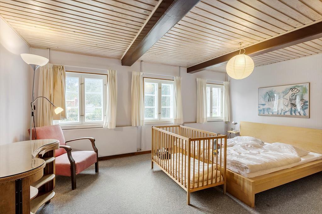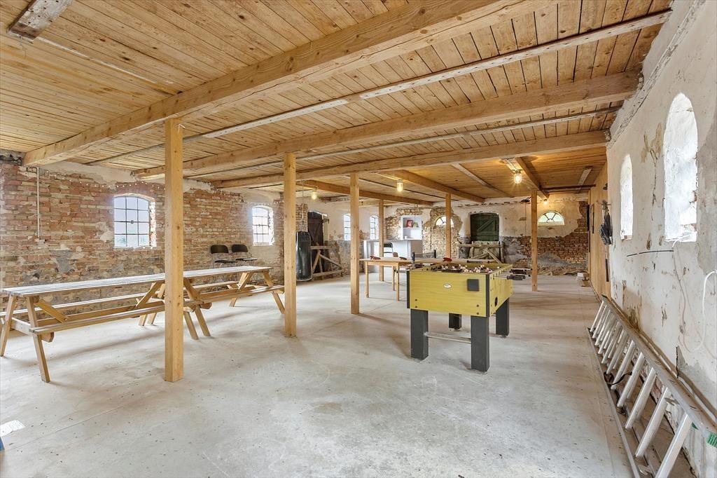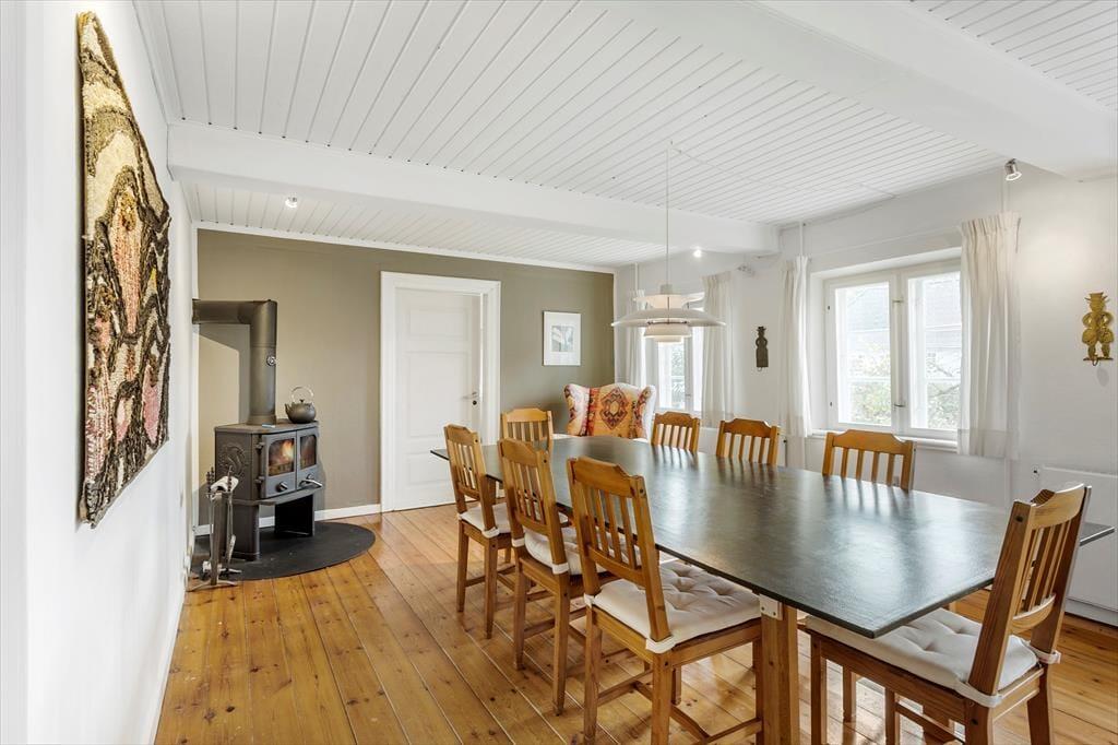 Når I træder ind i huset, bliver I mødt af en god stue med synlige bjælker, en hyggelig spiseplads og en brændeovn, der skaber en varm og indbydende atmosfære. Loftshøjden til bjælkerne er cirka 2 meter, hvilket giver rummet en autentisk og charmerende karakter. I det separate landkøkken med en mindre spiseplads kan I tilberede lækre måltider, mens I nyder udsigten til haven. Den gamle lade er blevet forvandlet til et hyggeligt samlingssted med synlige bjælker, et langt bord med bænke og masser af underholdningsmuligheder som bordtennis og bordfodbold.