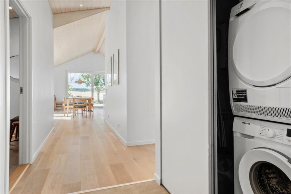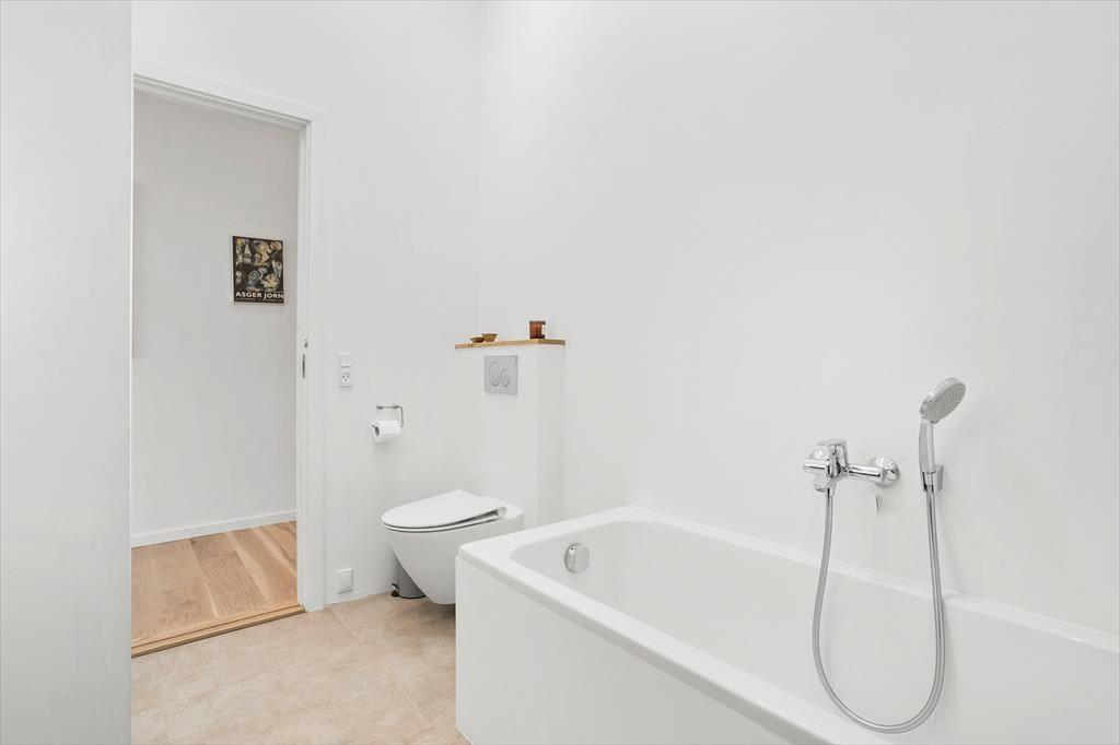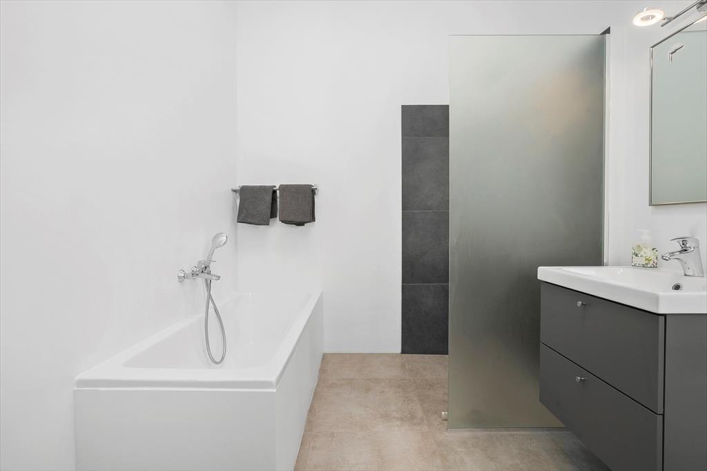 Der er flot badeværelse i huset med toilet, bruser og et dejligt badekar. Her er desuden gæstetoilet og både vaskemaskine og tørretumbler i huset, så I kan få vasket badehåndklæderne efter en lang dag på stranden.