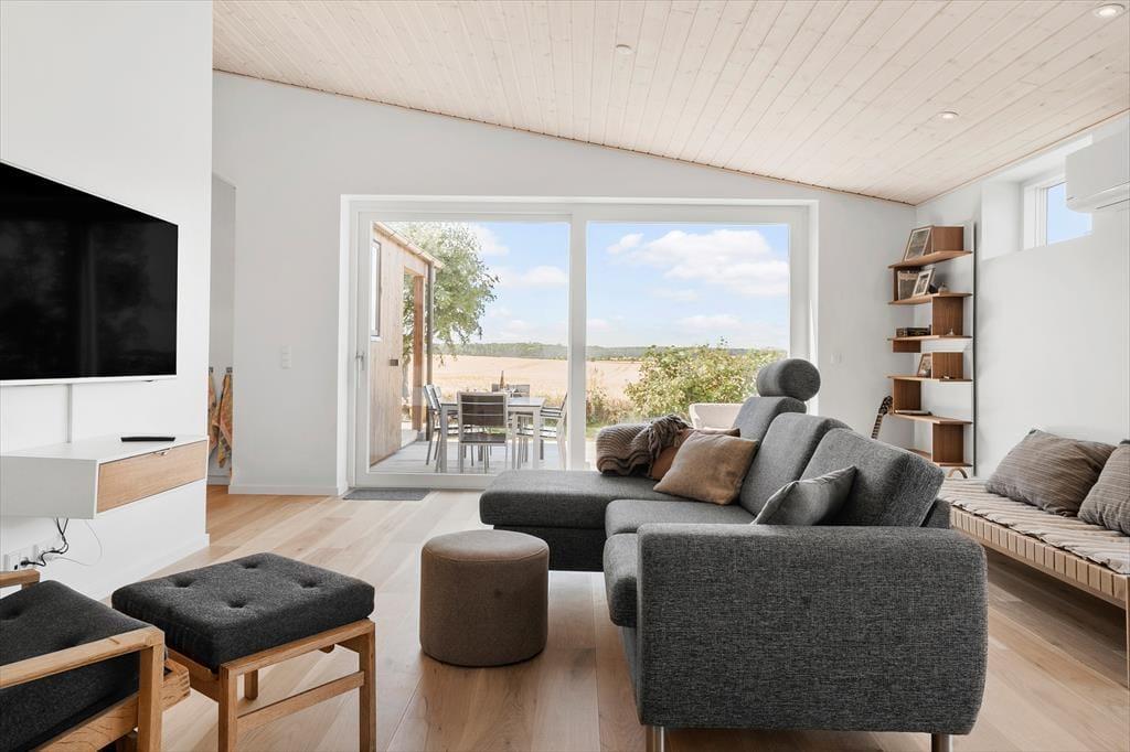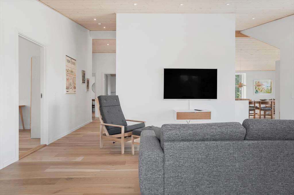 I direkte forbindelse med køkkenet er der spiseplads og hyggelig sofagruppe, hvor I alle kan samles efter en god dag på stranden og hygge jer med brætspil, puslespil, snak og måske se en film på TV´et, hvor der er mulighed for at streame eget abonnement via huset Chromecast.