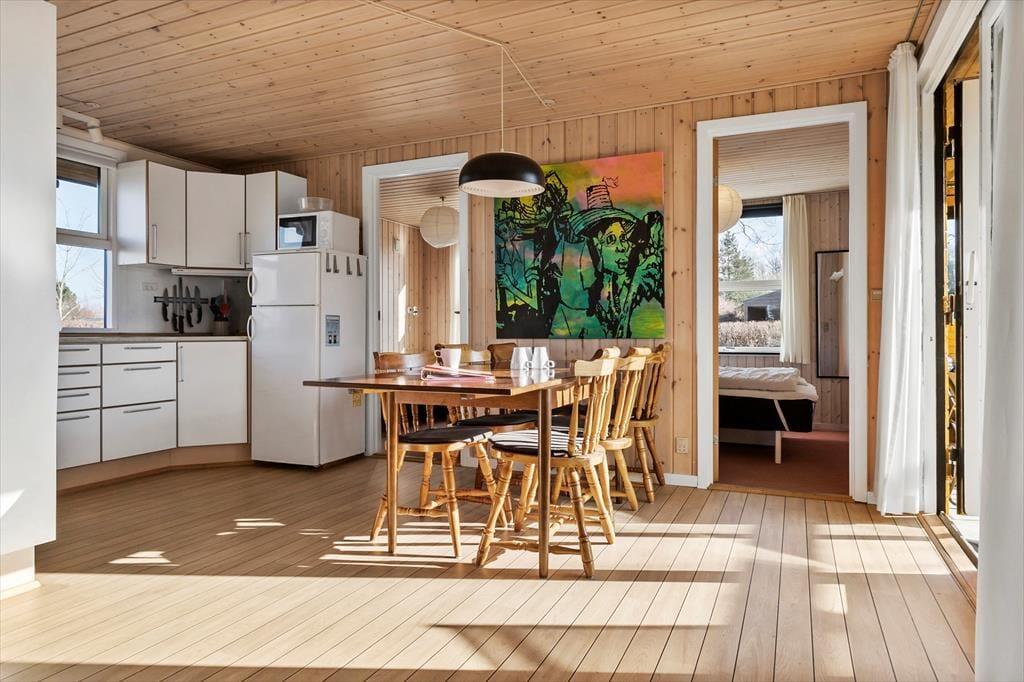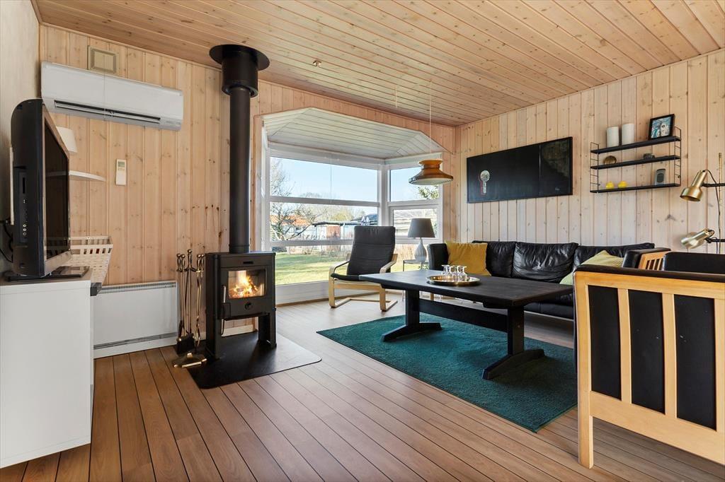 Stue med hyggeligt sofaarrangement, brændeovn og udsigt til haven. Stuen og køkken-alrum har flot skibsparketgulv og så er der direkte udgang til den lukkede terrasse og til haven. Køkken med opvaskemaskine og mikrobølgeovn. Bad med vaskemaskine. Fire rigtig gode soverum.